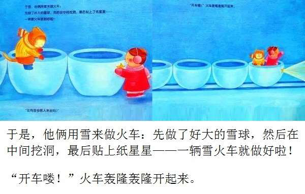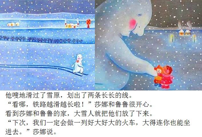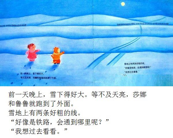 《莎娜的雪火车》内容为:积雪像一床银白色的毛毯,将草原、道路、屋顶覆盖,就像是另外的一个世界。我想,如果此时还有月光,那么一定会发生某种神秘的事情。我还会想,为探寻那种神秘的事情,我会在软绵绵的雪地上,一步一步地走向前,留下新鲜的脚印,说不定会遇到不知谁做的雪人向我挥挥手,或者好大的雪巨人跳着舞……这片刻的幻境,也许第二天就会消失,但此刻,我只想在这月光下的雪地上,和只在这里才会遇到的伙伴们交朋友,尽情地玩一趟。 夜晚,下了大雪,莎娜和鲁鲁等不及天亮,跑到了外面。 雪地上有两条线,好像铁路似的。要是能坐上雪火车开过去就好了! 看一看莎娜和鲁鲁的神秘火车的故事吧。