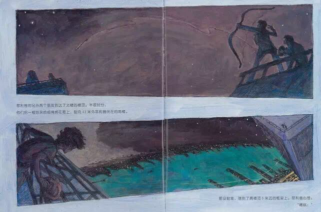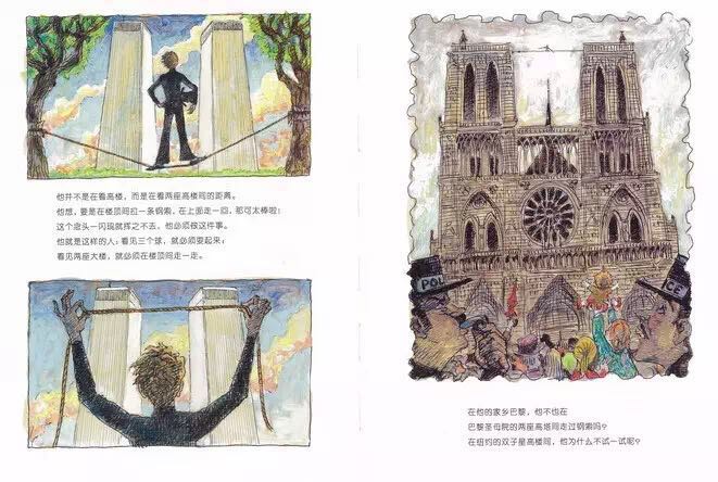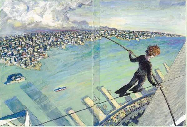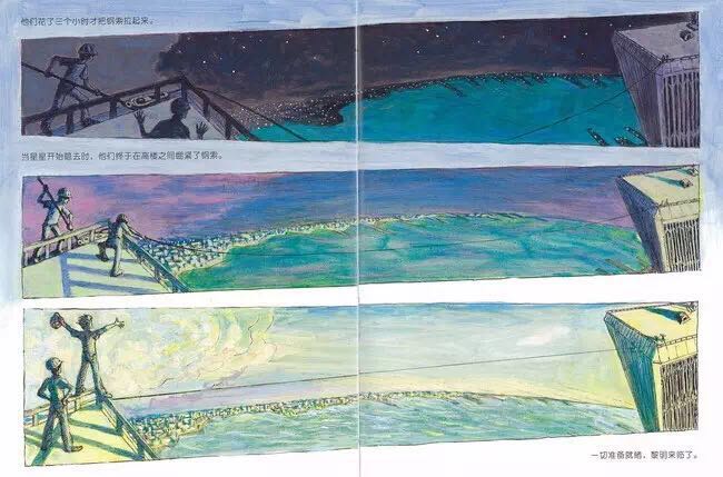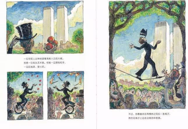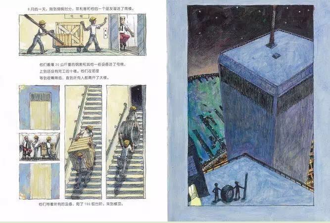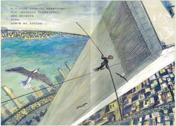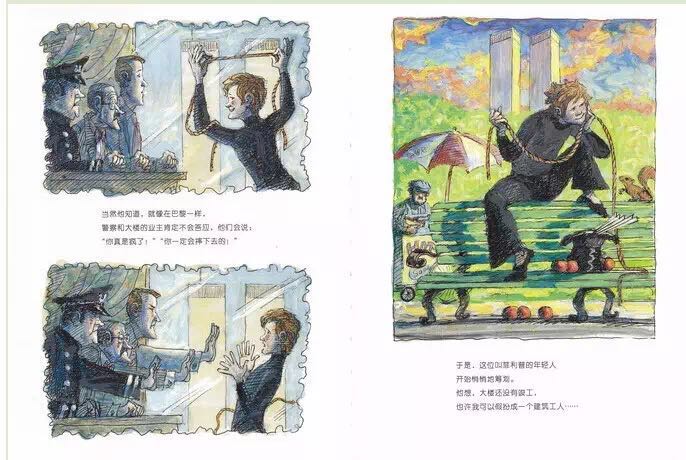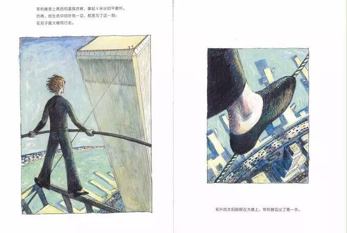 1974年,纽约世贸中心双子星大楼即将竣工之际,法国杂技艺术家菲利普.帕特在两座楼之间拉起了一条钢索,他在400米的高空行走,舞蹈,做着各种各样的表演,时间长达一个小时。《高空走索人》紧扣菲利普那满怀诗意和魔力的艺术激情,用简洁冷峻的语言和精彩的油画笔法,让每一个细节丝毫毕现,还巧妙地设计了两个拉页:水平式拉页,引领读者一起漫步空中;垂直式拉页,更加突出了双子星大楼梦幻般的高度和距离。