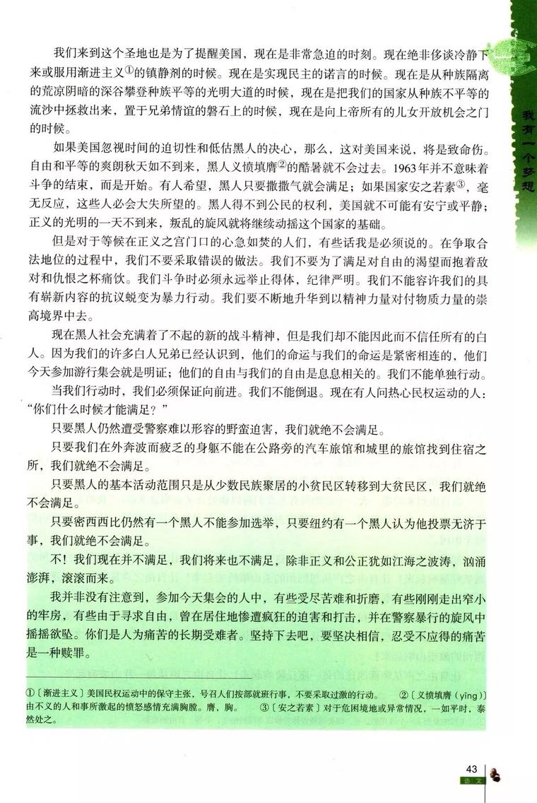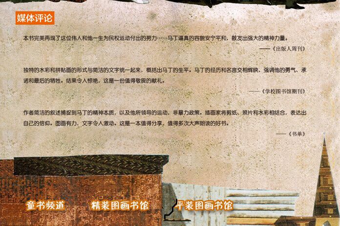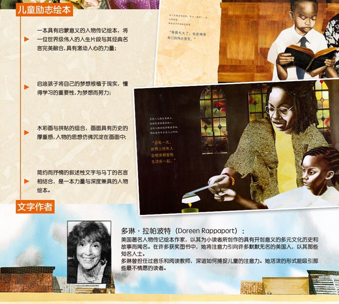 在马丁的成长过程中,“白人专用”的标志在家乡无处不在。每当看到这四个字,他都觉得很不舒服。 直到有一天,他想起母亲曾经说过: “你与别人一样优秀。” 长大后,马丁像父亲一样成为一名牧师。他将儿时从父母和圣经那里学来的伟大宣言铭记在心: “人人都可以伟大。” 他做到了。 为了真实再现这位伟大的美国英雄的传奇一生,多琳·拉帕波特用精炼的文字将马丁·路德·金和他的伟大宣言编织成一个迷人的故事,感动人心。著名艺术家布莱恩·科利尔精湛完美的拼贴画更是为本书锦上添花。《我有一个梦想》记录了一位让人民铭记在心的英雄,他的伟大梦想改变了美国,也改变了世界,永永远远!