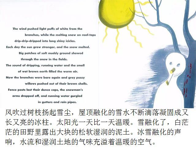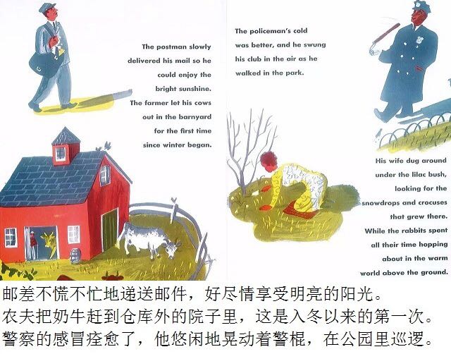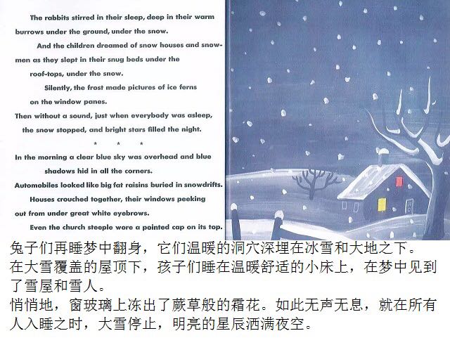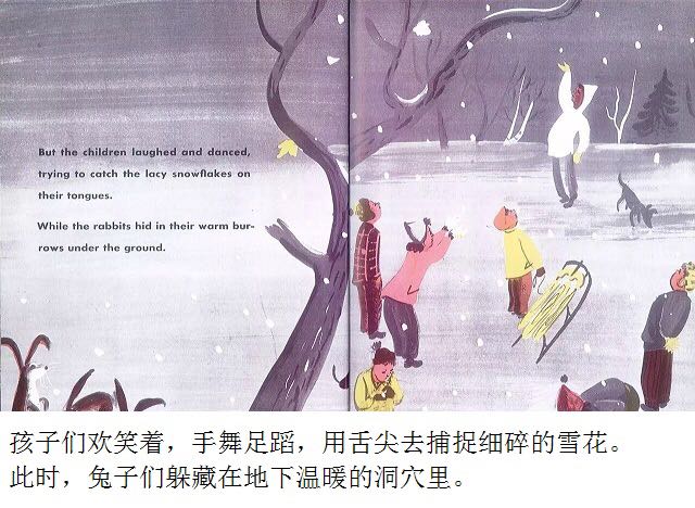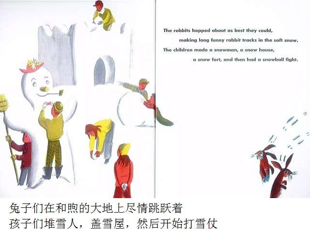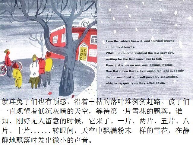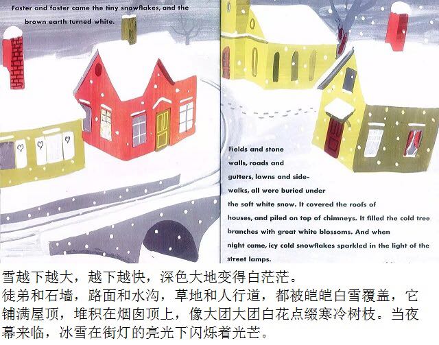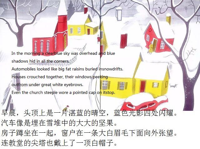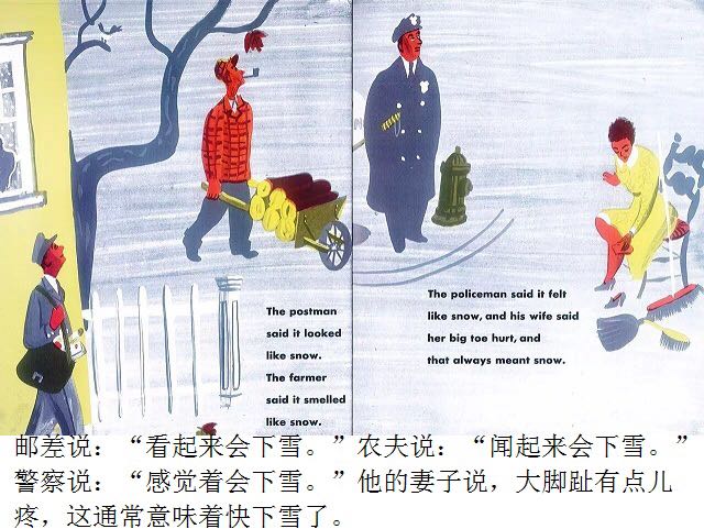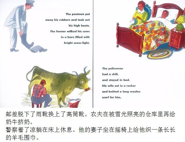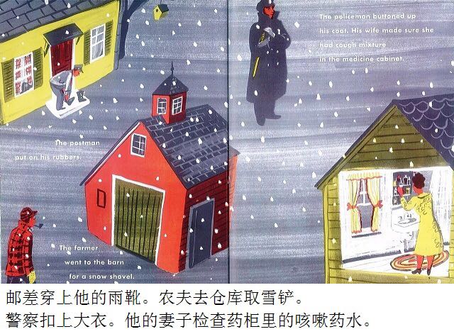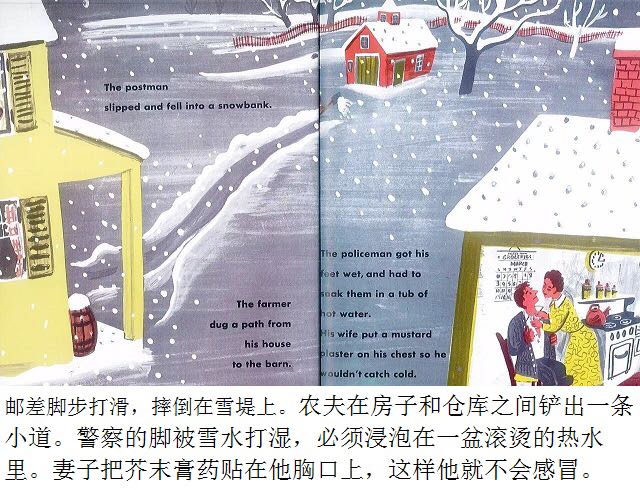 第一片雪花从灰蓝色的天空中飘落,邮递员穿上雨靴,农夫去仓库取雪铲,警察扣好了大衣,他的妻子检查药橱柜里的咳嗽药水,而孩子们则欢呼雀跃、手舞足蹈,用舌尖去捕捉飘落的雪花…… 《白雪晶晶》以美国的乡村小镇为背景,描绘了从冬天初雪飘落,到春天冰雪初融、万物复苏的季节变化,以及小镇居民舒缓、惬意的日常生活。书中用饱含水墨的蓝灰色来表现天空和大地,用画纸本身来呈现皑皑白雪的质感,而点缀其间的鹅黄色和橘红色则营造出欢快的气氛。 第一片雪花从灰蓝色的天空中飘落,邮递员穿上雨靴,农夫去仓库取雪铲,警察扣好了大衣,他的妻子检查药橱柜里的咳嗽药水,而孩子们则欢呼雀跃、手舞足蹈,用舌尖去捕捉飘落的雪花…… 《白雪晶晶》以美国的乡村小镇为背景,描绘了从冬天初雪飘落,到春天冰雪初融、万物复苏的季节变化,以及小镇居民舒缓、惬意的日常生活。书中用饱含水墨的蓝灰色来表现天空和大地,用画纸本身来呈现皑皑白雪的质感,而点缀其间的鹅黄色和橘红色则营造出欢快的气氛。