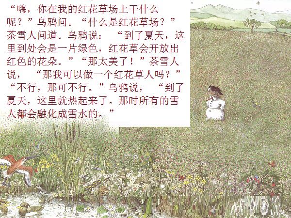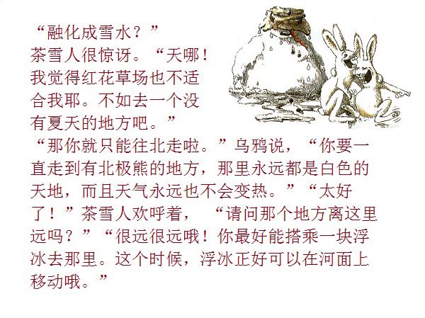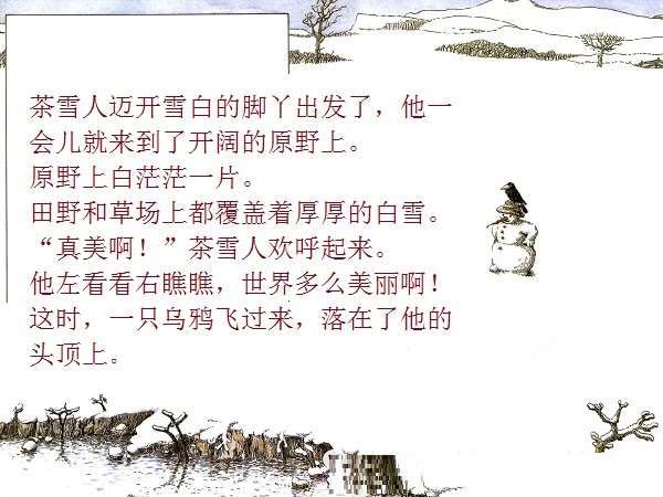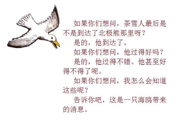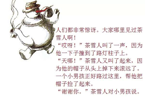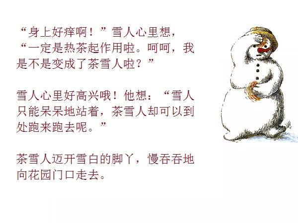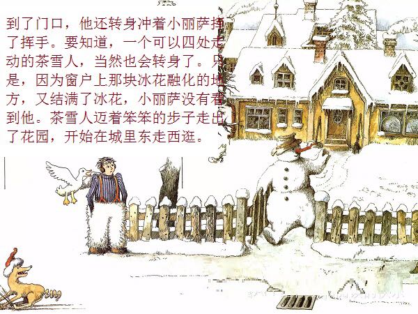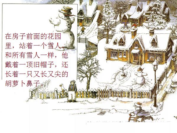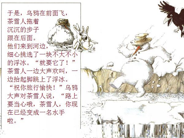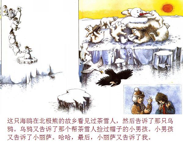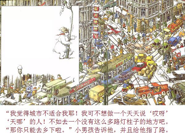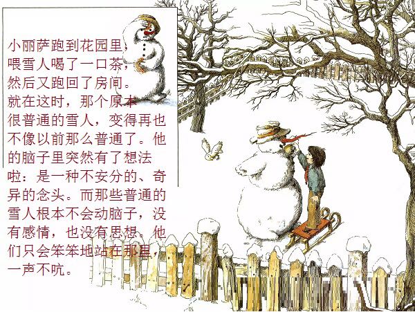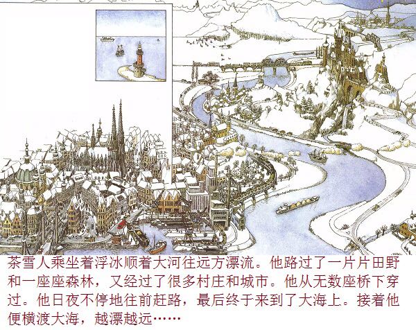 一个普普通通的、站在花园里的雪地上的小雪人,因为喝了小女孩丽萨送来的一口热茶,竟然获得了生命、思想,以及游遍世界的力量与勇气。而最不可思议的是,这个敢于向往、敢于行动的勇敢的雪人,竟然乘着一块浮冰,沿着河流开始了远航,经过了无数的田野、森林、城市、村庄,最终到达了他所向往的目的地:北极熊生活的地方!与其说,小小的雪人是乘着冬天的浮冰在漂流,不如说,他是乘着绘本作家米拉·洛贝的想象的翅膀在远航。