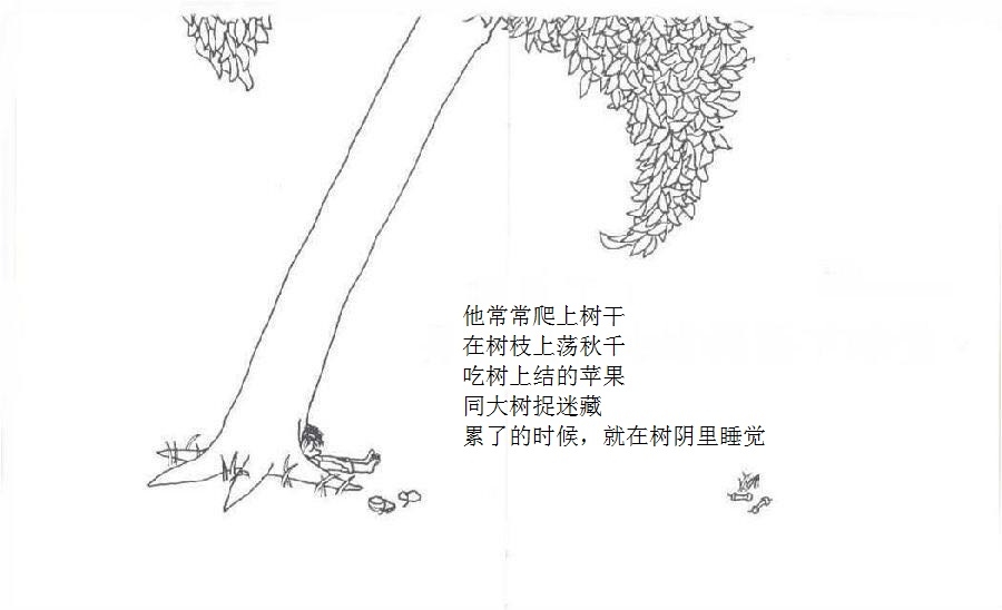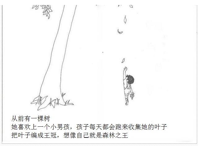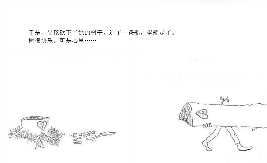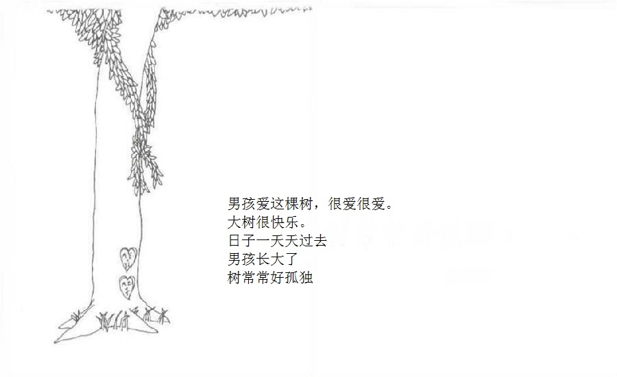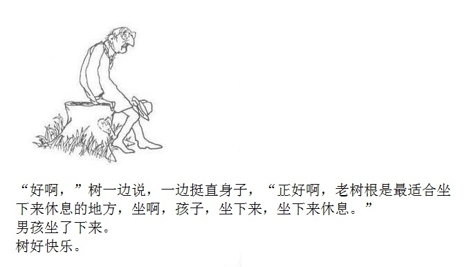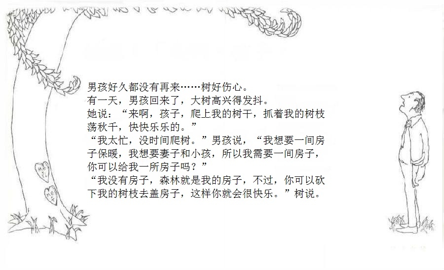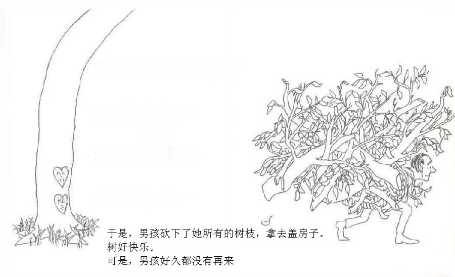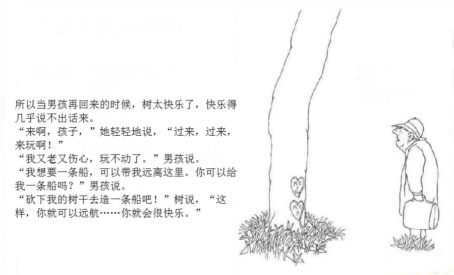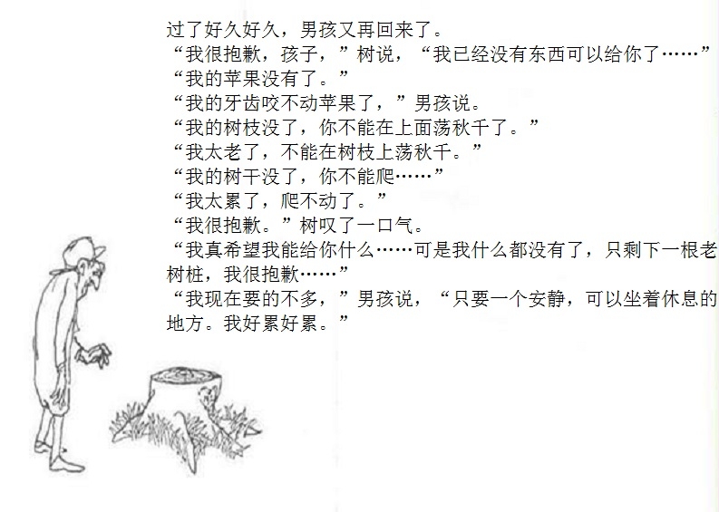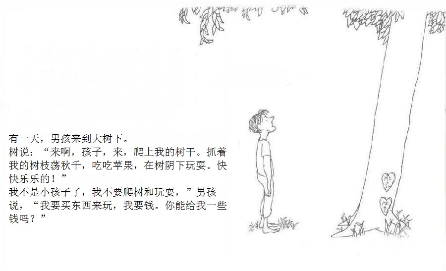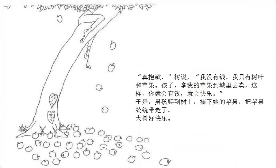 一棵大树爱上一个小男孩,小男孩每天来爬树、摘树叶、吃苹果……男孩很开心,大树也很开心。可是,男孩渐渐长大,不再与大树一起玩耍。男孩希望获得金钱,大树把苹果给他去换钱;男孩需要建立家庭,大树把树枝给他造房;男孩希望去远航,大树把树干给他造船。男孩变成老人回到大树身边,大树已经没有什么可以给他,不过它还有个树墩,可以让男孩坐下来休息……这是由一棵有求必应的苹果树和一个贪求不厌的孩子共同组成的温馨、又略带哀伤的动人故事;这是一则令人心醒动容的寓言——在施与受之间,也在爱与被爱之间。