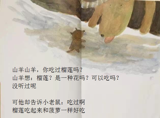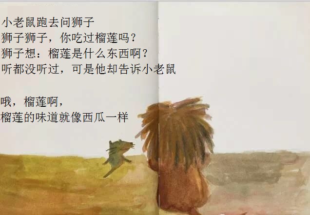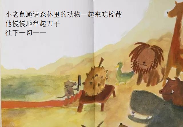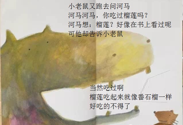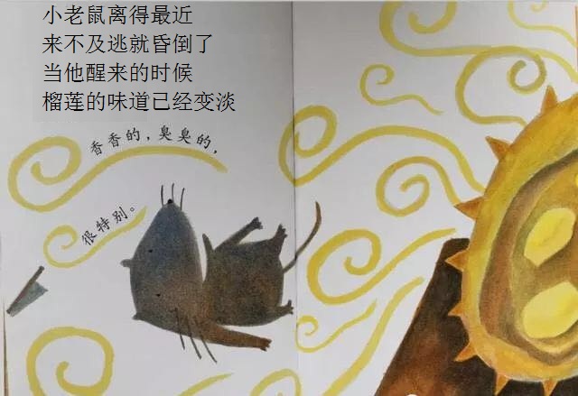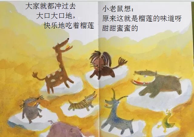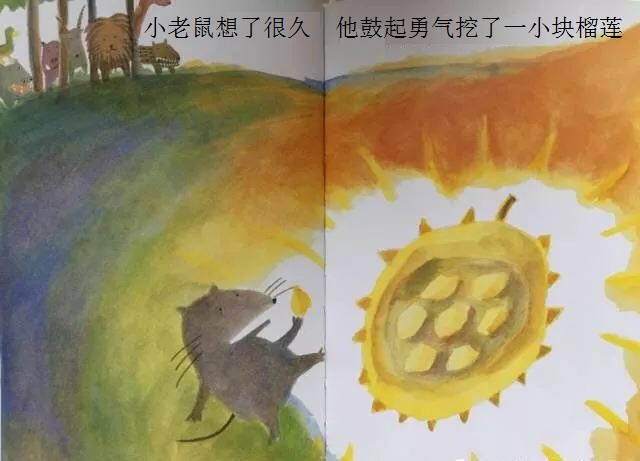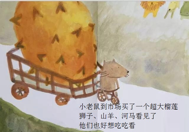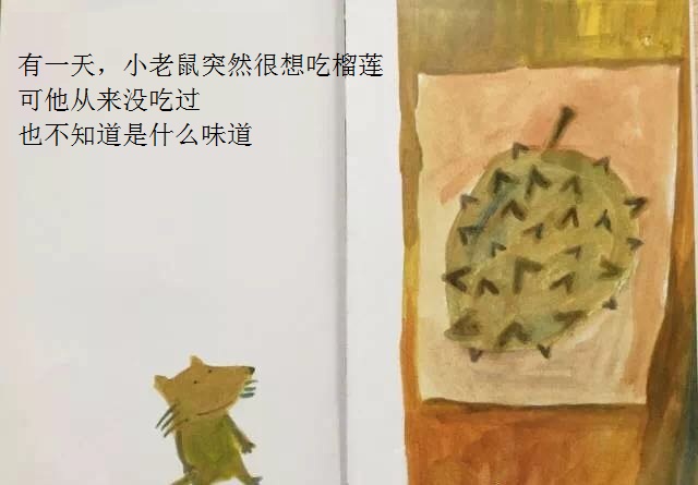 本书从一只小老鼠突然想吃榴莲开始,展开了一场有趣的探索之旅!故事简单,以一种单纯的渴望出发,带来了连串的行动,终于得到了真正的答案。这样的寓意,相当能贴近幼儿初探世界的经验。勇于尝试的小老鼠,从想、询问,到付诸行动去买、切开;从不适应到大口品尝,这些追求渴望的过程和加起来的满足,远胜过榴莲带来的滋味。想看看这个可爱的故事吗?