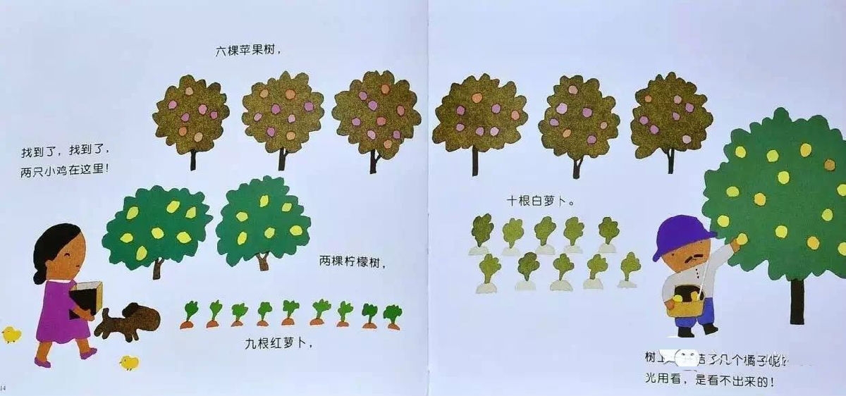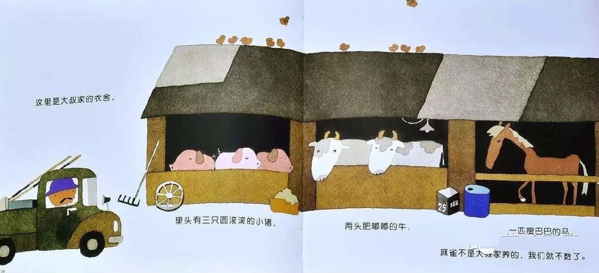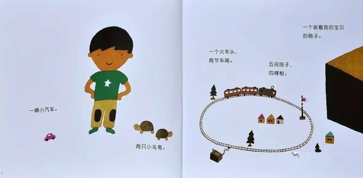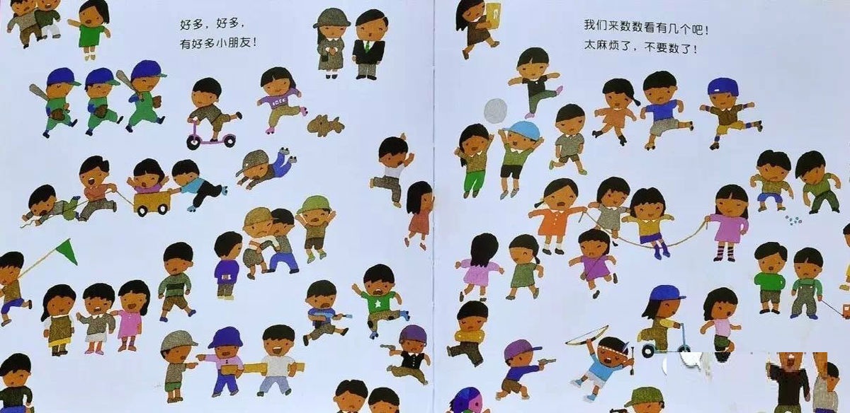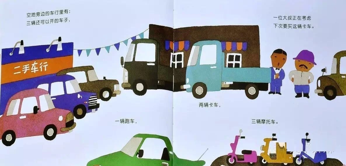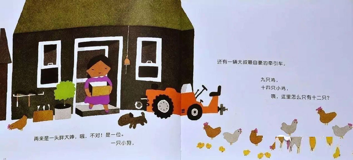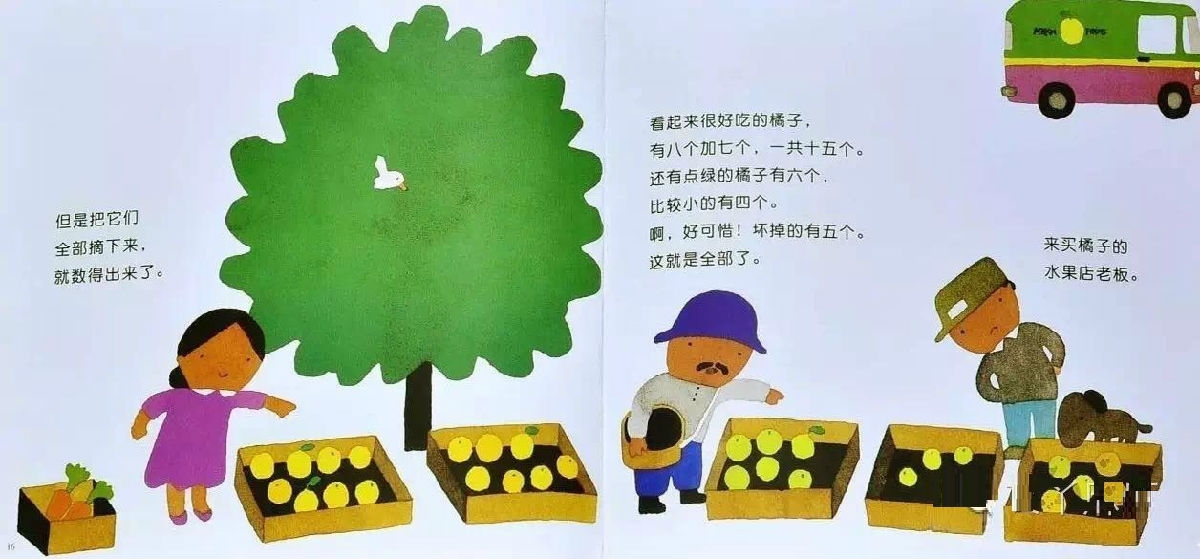 “三只圆滚滚的小猪,两头肥嘟嘟的牛,一匹瘦巴巴的马,再来是一头胖大婶,哦,不对!是一位……” 三只猪不能说成三条猪,两头牛不能说成两匹牛,一匹马不能说成一头马,一位胖大婶不能说成一头胖大婶……哇,量词那么多,要了解清楚真是不容易! 五味太郎认为数字非常有魅力,因此画了许多充满“数字”要素的景物,要让孩子在玩数一数的同时,也发现语言的奥妙! 他融合一贯幽默、活泼、天真的创作风格,让孩子在数着一个火车头、五间房子、四棵树的时候,领略到数字的变化,还发现量词的种类繁多。 除了教育功能外,五味太郎还希望他的书必须是让孩子感兴趣的故事。于是故事从小男孩的房间开始,到玩耍的空地、空地旁边的二手车店、想买卡车的大叔和他的农舍、农舍旁的果园、水果店老板和来买水果的妈妈,最后又回到小男孩身上,环环相扣的情境,让人物之间形成流畅又有趣的互动。五味太郎还是位体贴的作者,他怕农舍里的动物太多数不完,于是说“麻雀不是大叔家养的,我们就不数了。”…… 这本图画书丰富的生活场景和逗趣的语言,让孩子不知不觉沉浸其中,在游戏中吸收了数与量的相关知识。日本图画书创意大师真是不简单,连数数的书都让人看了不由得惊呼“这也太有趣了吧!”