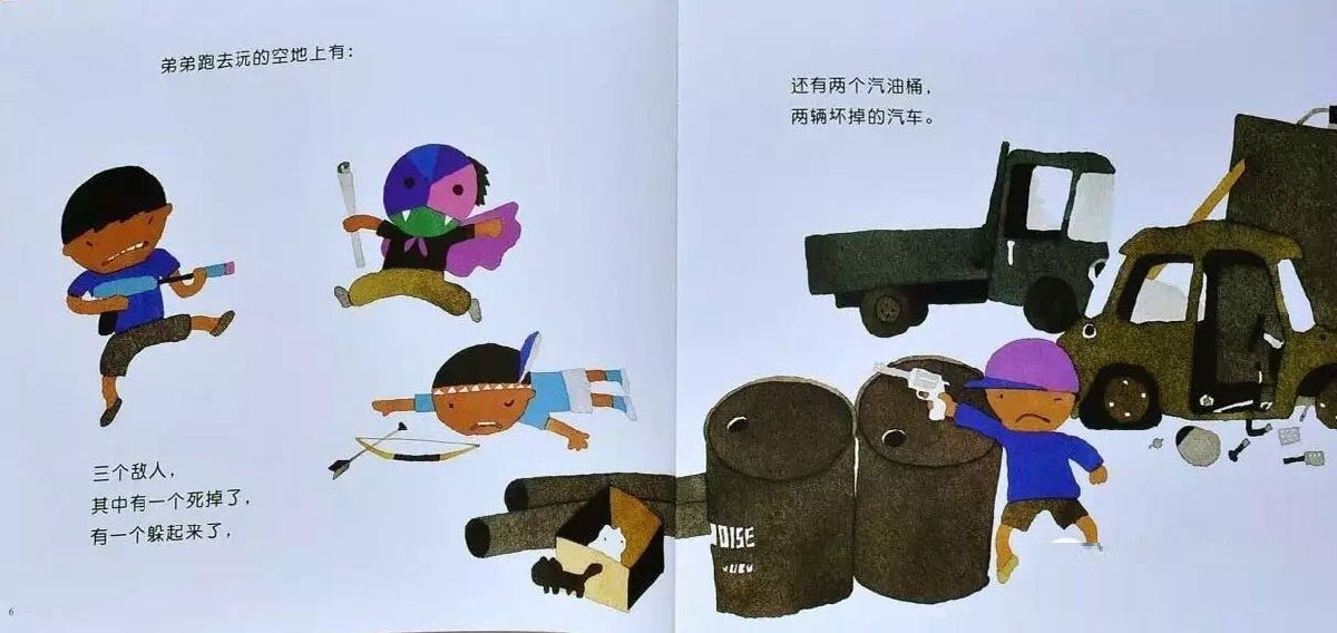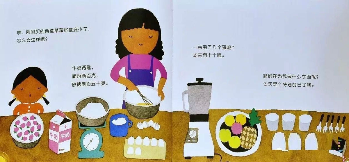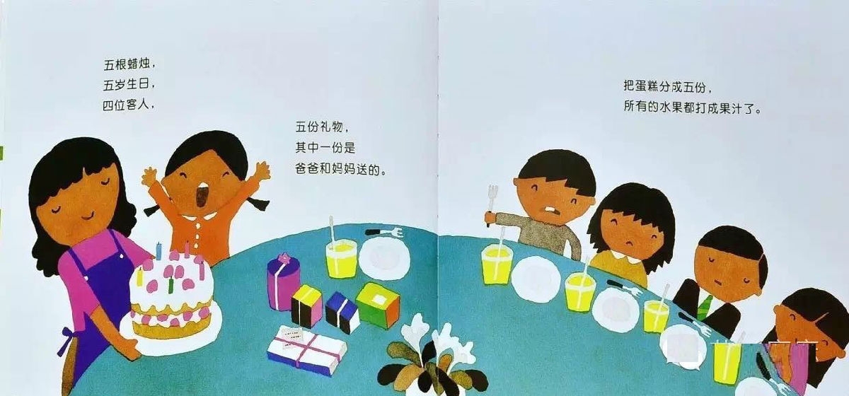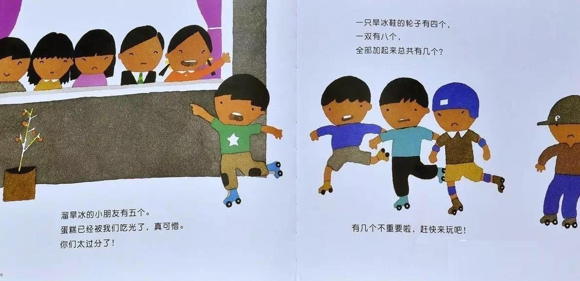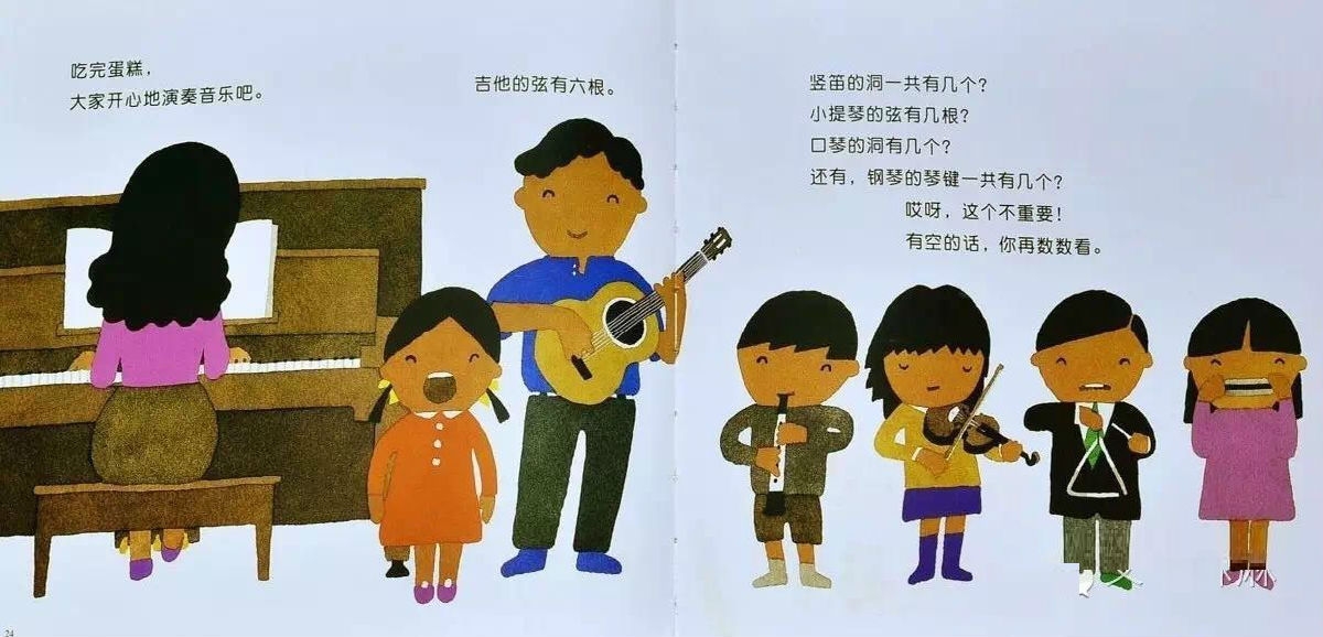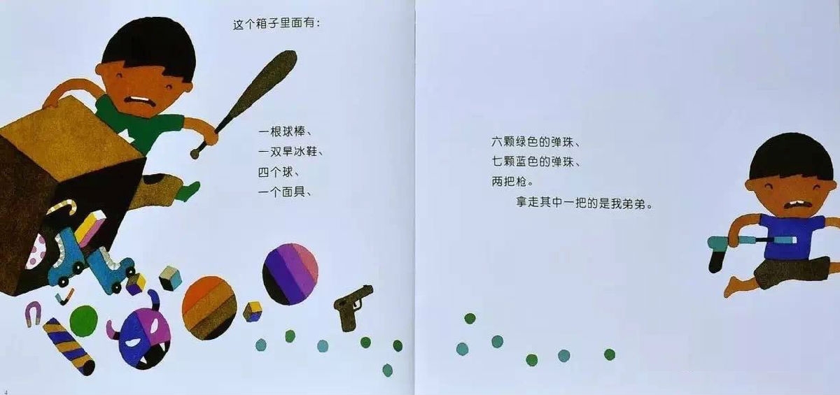 “三只圆滚滚的小猪,两头肥嘟嘟的牛,一匹瘦巴巴的马,再来是一头胖大婶,哦,不对!是一位……” 三只猪不能说成三条猪,两头牛不能说成两匹牛,一匹马不能说成一头马,一位胖大婶不能说成一头胖大婶……哇,量词那么多,要了解清楚真是不容易! 五味太郎认为数字非常有魅力,因此画了许多充满“数字”要素的景物,要让孩子在玩数一数的同时,也发现语言的奥妙! 他融合一贯幽默、活泼、天真的创作风格,让孩子在数着一个火车头、五间房子、四棵树的时候,领略到数字的变化,还发现量词的种类繁多。 除了教育功能外,五味太郎还希望他的书必须是让孩子感兴趣的故事。于是故事从小男孩的房间开始,到玩耍的空地、空地旁边的二手车店、想买卡车的大叔和他的农舍、农舍旁的果园、水果店老板和来买水果的妈妈,最后又回到小男孩身上,环环相扣的情境,让人物之间形成流畅又有趣的互动。五味太郎还是位体贴的作者,他怕农舍里的动物太多数不完,于是说“麻雀不是大叔家养的,我们就不数了。”…… 这本图画书丰富的生活场景和逗趣的语言,让孩子不知不觉沉浸其中,在游戏中吸收了数与量的相关知识。日本图画书创意大师真是不简单,连数数的书都让人看了不由得惊呼“这也太有趣了吧!”