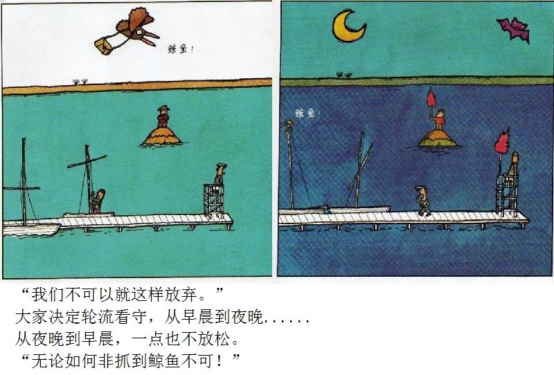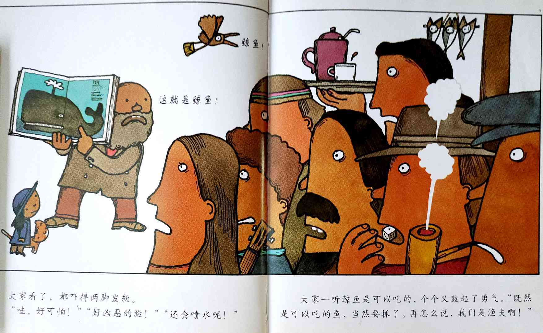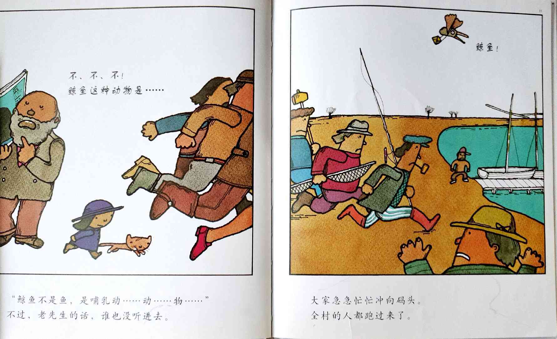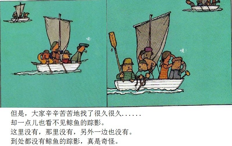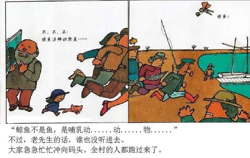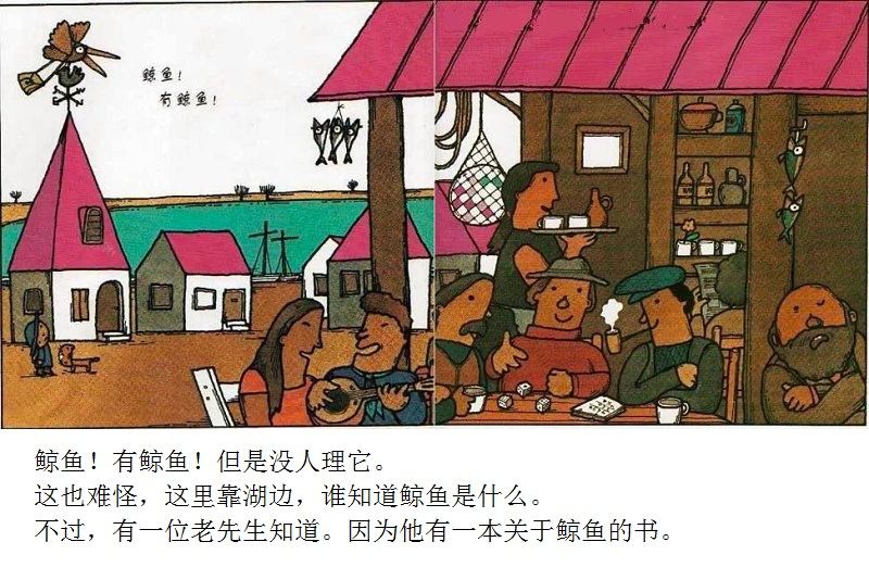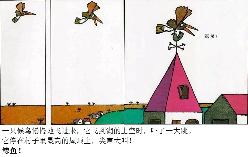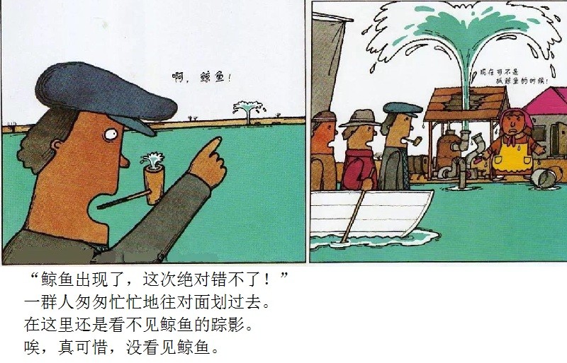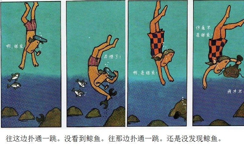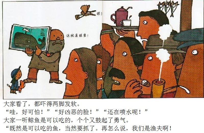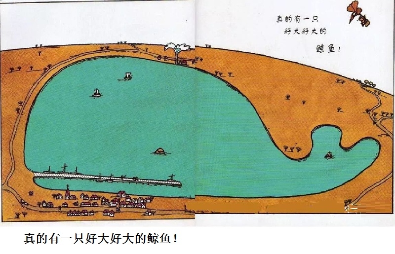 《鲸鱼》内容简介:读者不得不通过看图来结合文字叙述,才会感受并明白它的趣味和诉求,而这个特点也使得该书别具阅读趣味和价值。“啊!原来是这样!”几乎每个人看到结局,都有这种恍然大悟的惊叹:一只候鸟飞在天上,大喊着“鲸鱼”!可是,村子里的人们找来找去,都没有在湖里找到,他们开始抱怨候鸟欺骗了他们,可是,一个小孩子被候鸟带着飞上了天空,原来,村边的湖的形状跟鲸鱼一样,而一户人家坏了的水管喷上来的水正象是鲸鱼喷出来的水,原来候鸟也并没有骗人。其实有的时候,表面看到的东西不一定就是事实,而在你眼里是事实的事别人也不一定认同。什么才是真正的真相?一个看似简单的故事留给读者的是无穷的回味。日本作为动漫大国和绘本大国,其图画书总是充满视觉趣味。日本著名童书绘本作家五味太郎的重要作品《鲸鱼》中,以鲸鱼的形状、轮廓和颜色来发展故事的架构和旨趣,强调了图画的元素,也突显图画书的特质。