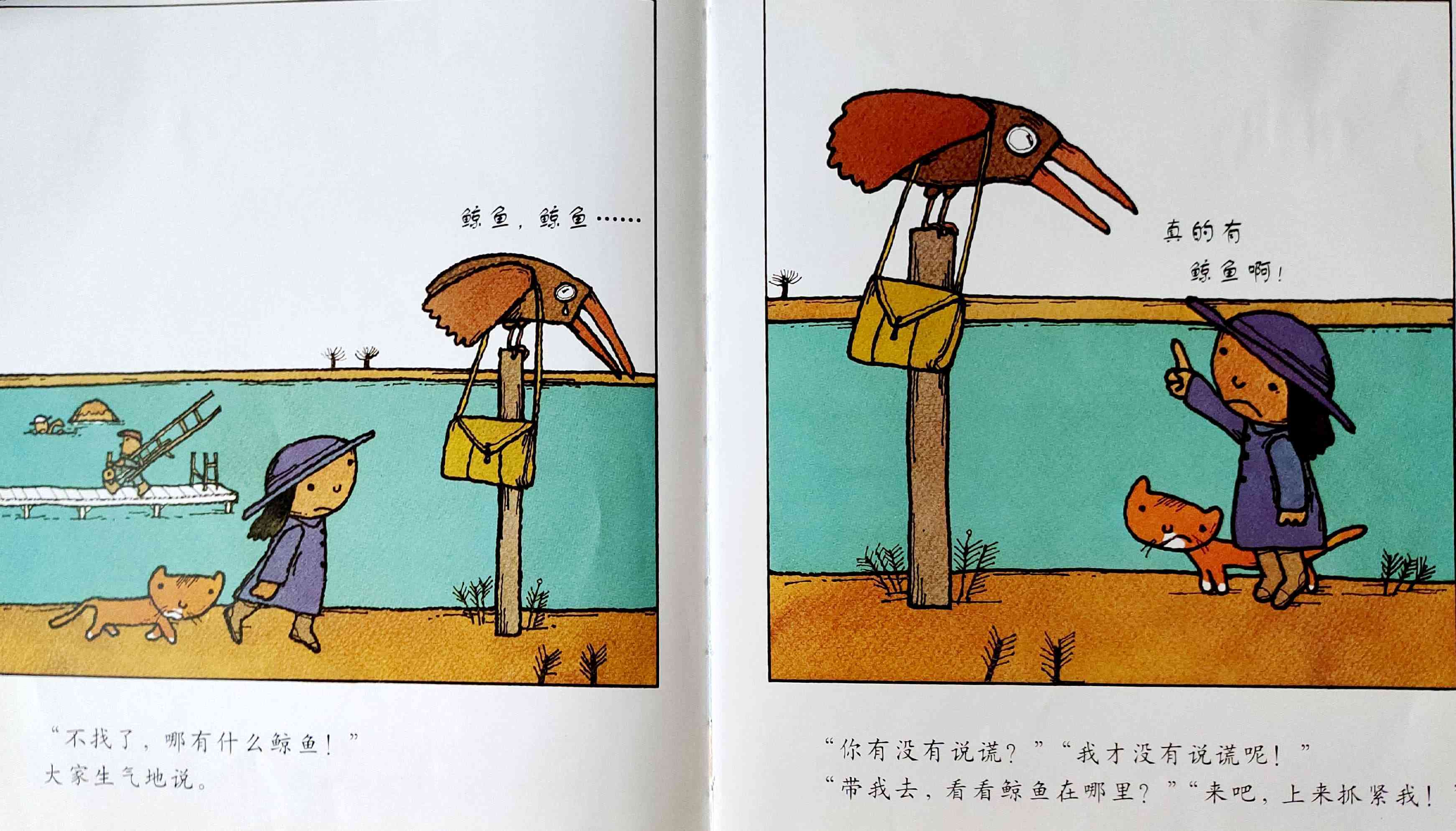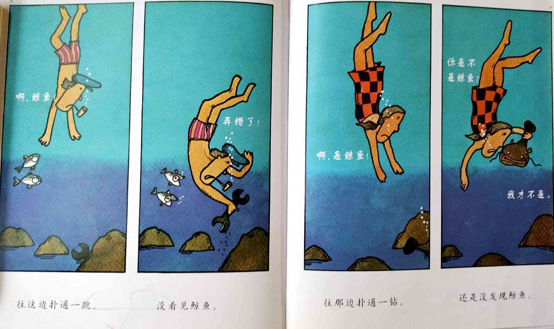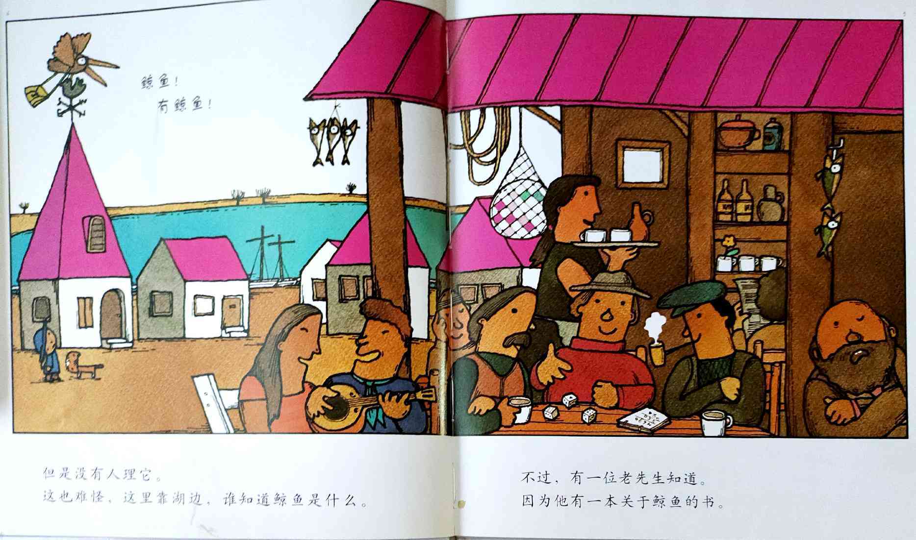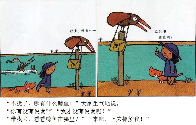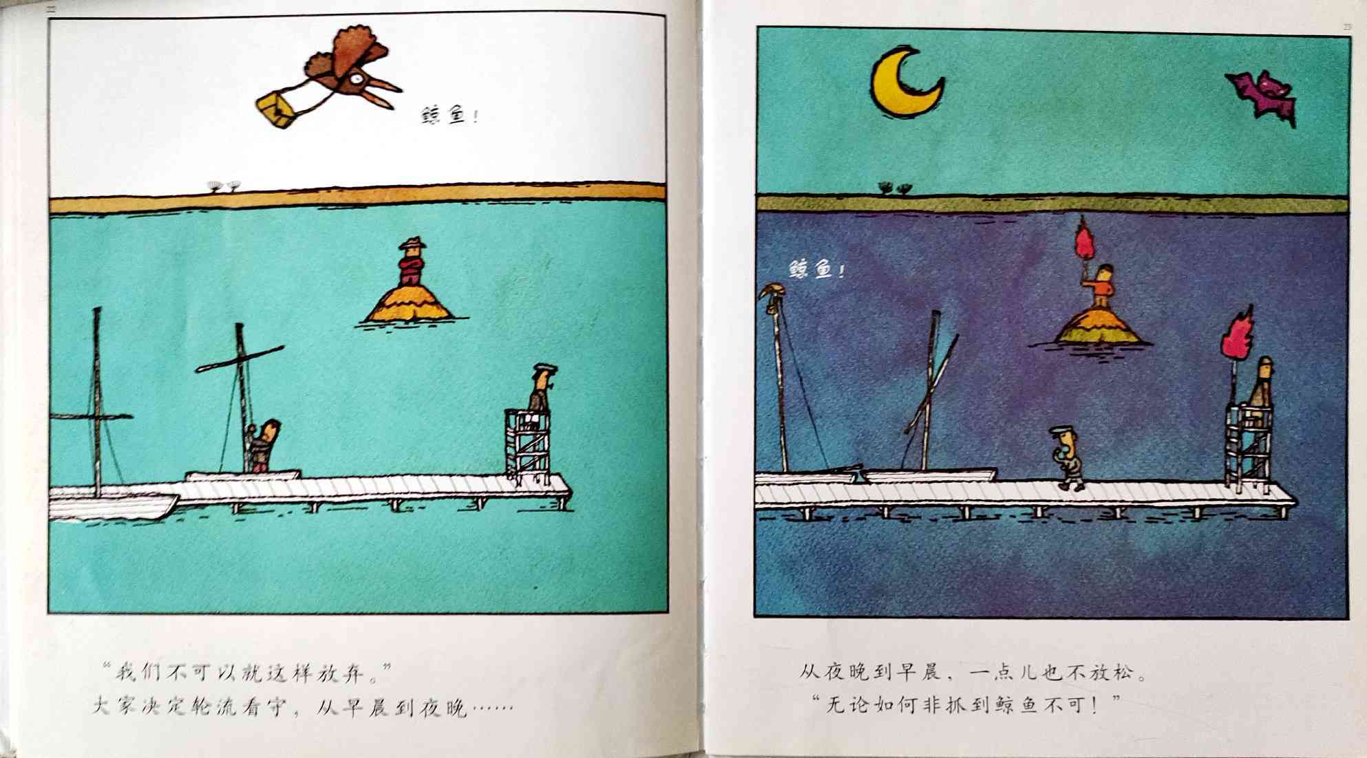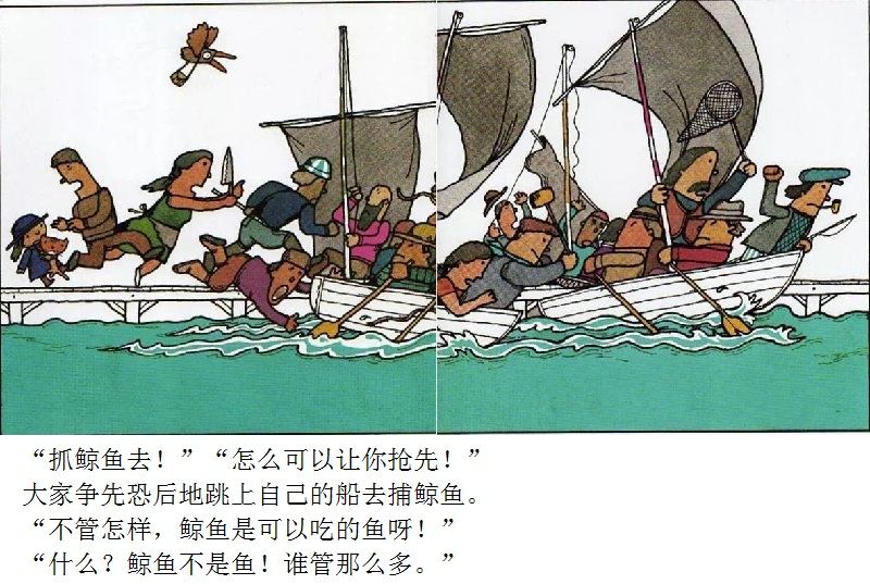 《鲸鱼》内容简介:读者不得不通过看图来结合文字叙述,才会感受并明白它的趣味和诉求,而这个特点也使得该书别具阅读趣味和价值。“啊!原来是这样!”几乎每个人看到结局,都有这种恍然大悟的惊叹:一只候鸟飞在天上,大喊着“鲸鱼”!可是,村子里的人们找来找去,都没有在湖里找到,他们开始抱怨候鸟欺骗了他们,可是,一个小孩子被候鸟带着飞上了天空,原来,村边的湖的形状跟鲸鱼一样,而一户人家坏了的水管喷上来的水正象是鲸鱼喷出来的水,原来候鸟也并没有骗人。其实有的时候,表面看到的东西不一定就是事实,而在你眼里是事实的事别人也不一定认同。什么才是真正的真相?一个看似简单的故事留给读者的是无穷的回味。日本作为动漫大国和绘本大国,其图画书总是充满视觉趣味。日本著名童书绘本作家五味太郎的重要作品《鲸鱼》中,以鲸鱼的形状、轮廓和颜色来发展故事的架构和旨趣,强调了图画的元素,也突显图画书的特质。
