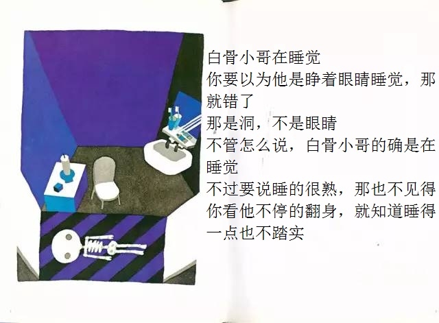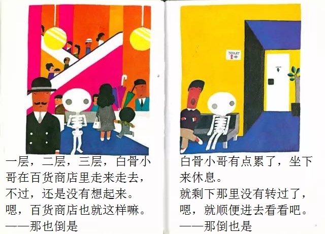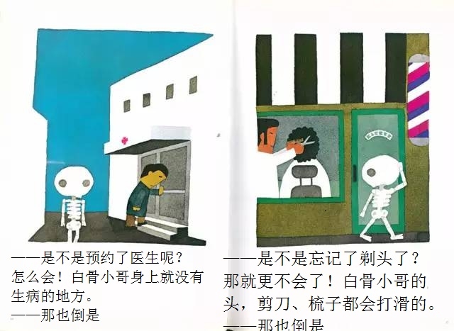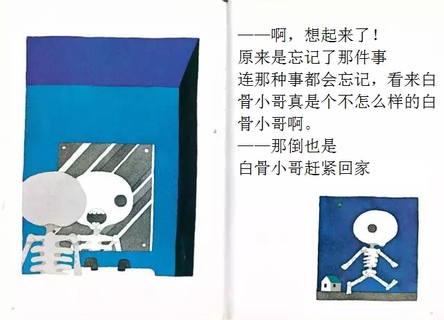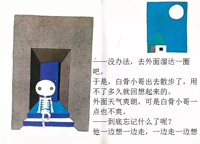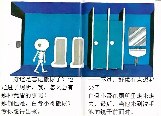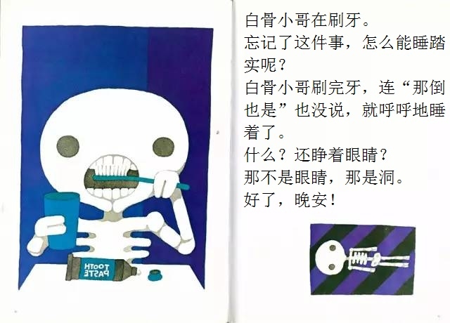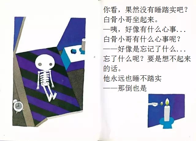 白骨小哥睡得一点也不踏实,他总觉得忘了什么事情,可就是想不起来。忘了洗衣服?怎么会!他根本就没有衣服嘛!忘了理发?那更不会了,梳子剪刀放到他的头上都会打滑的!忘记肚子饿了?怎么可能!他连肚子都没有!那……那到底是忘了什么呢? 在这本有些另类的绘本中,五味太郎别出心裁地让一个名叫“白骨小哥”的小骷髅做主角。不过这个形象丝毫不令人害怕,相反,他圆头圆脑,还有点呆兮兮的,十分可爱。全书借助画外音的形式进行互动,风趣幽默,不断设置悬念,带领读者不知不觉地走进故事中,直至最终揭晓谜底时,才让人恍然大悟:原来作者是想让孩子记住这个好习惯呀!至于是什么好习惯,看完一遍准不会忘!