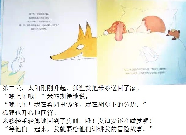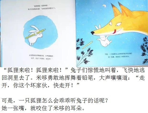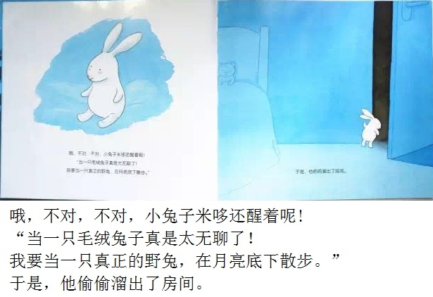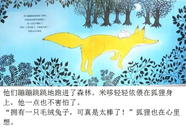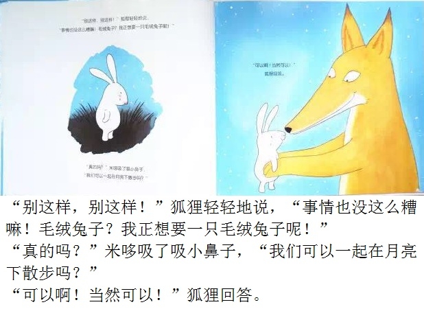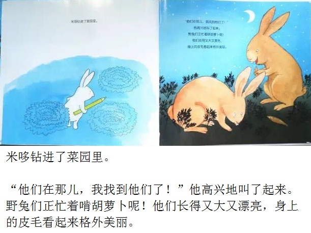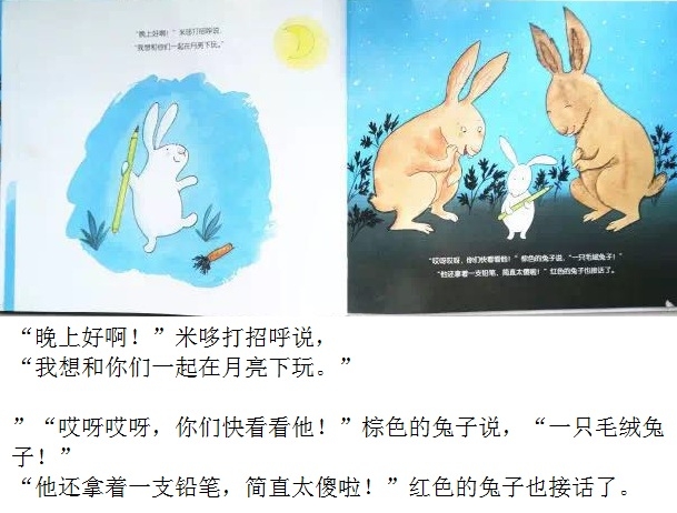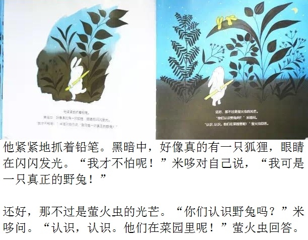 夜深了,毛绒兔子却翻来覆去地睡不着。“做一只毛绒兔子可真烦人,要是我是一只真正的兔子,在月亮下散步,那该有多好啊!”小兔子总是这么想。于是,他决定去寻找真正的兔子。出门前他还带了一根铅笔,防止遇到兔子的天敌——狐狸。在菜园里,小兔子遇到了真正的兔子,他开心地邀请他们一起玩。不过,兔子们又会有怎样的反应呢?可爱的主角、一波三折的情节、俏皮的语言、温馨的情感流露,配以柔和的色调、唯美的画面,告诉孩子有时候想象中的“敌人”可能没有那么坏,或许还能成为朋友呢!