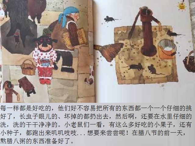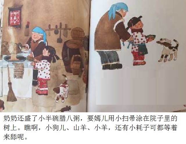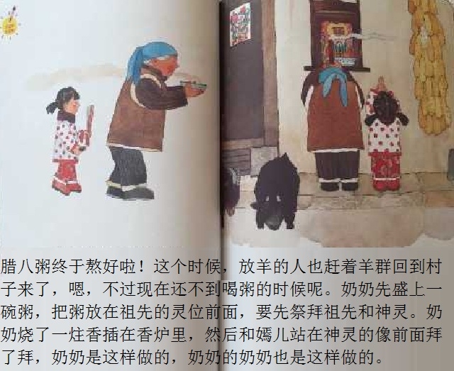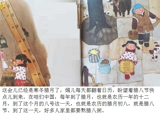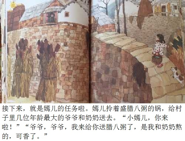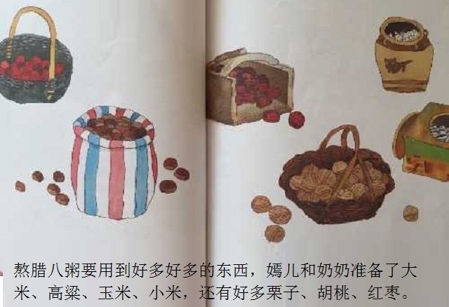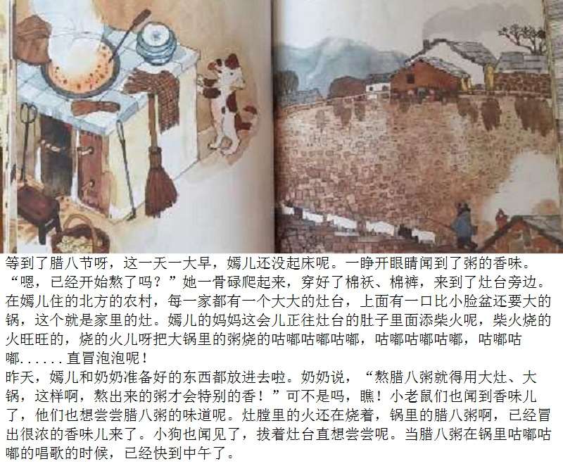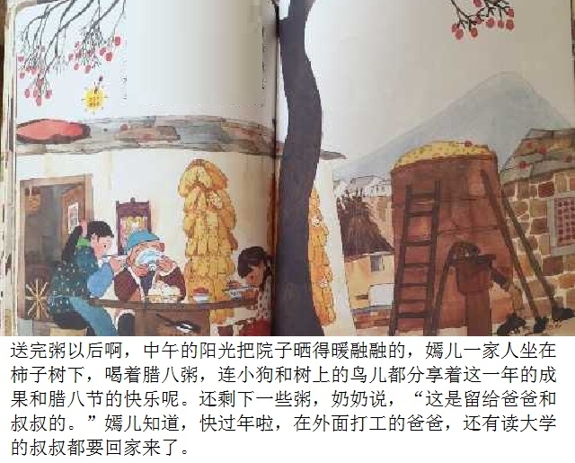 腊八节是中国传统节日之一。本书以腊八节为故事背景,通过嫣儿一家准备腊八粥的食材,熬粥,送粥,喝粥,给出门在外的亲人留粥,把腊八粥涂在树上,等等一系列活动,在温馨欢乐的场景中,表达了对美好生活的向往,传递出了腊八节这个传统节日的文化内涵。语言的力量和感人的图景结合在一起,使整个故事让人回味、让人充实。