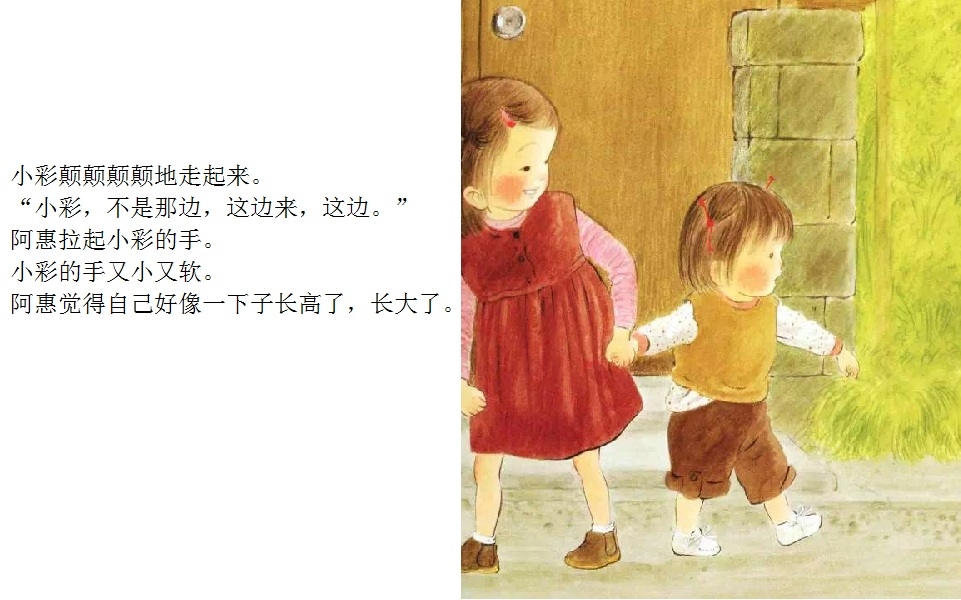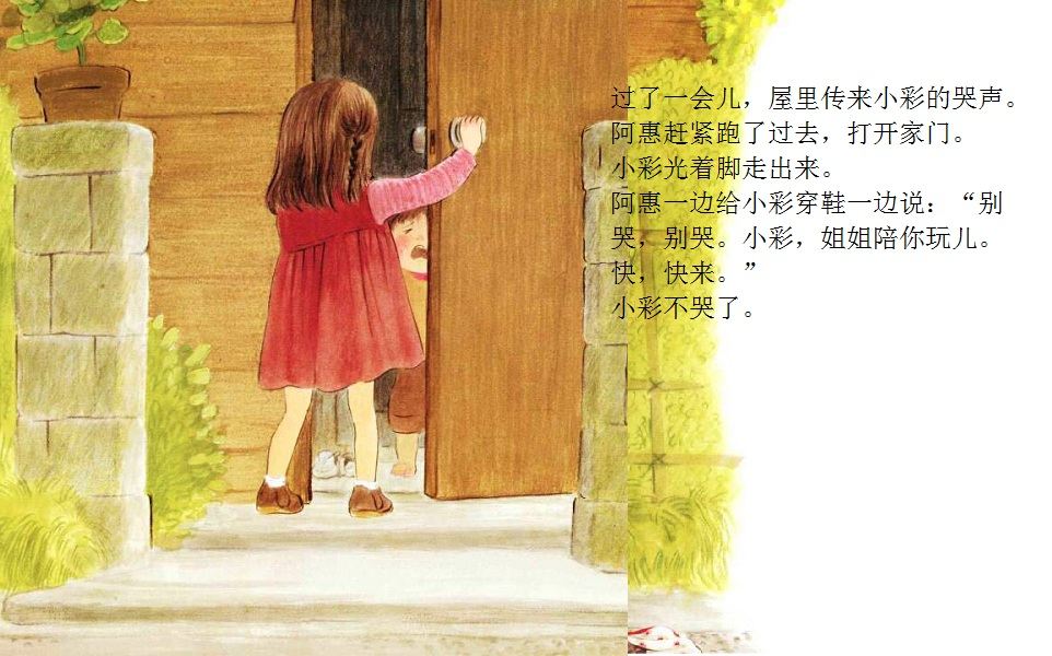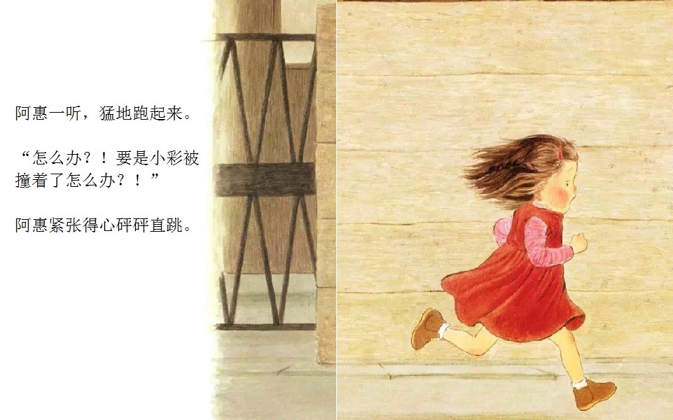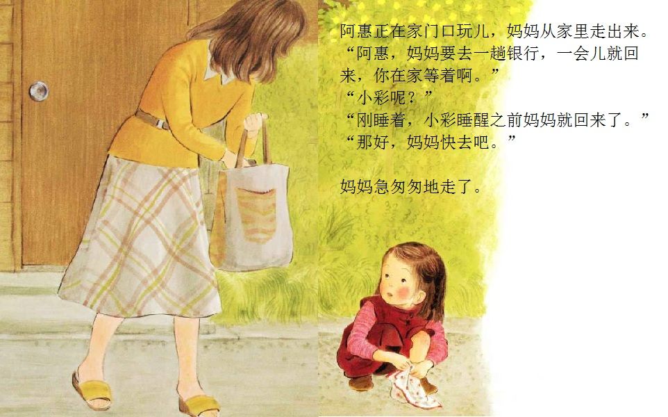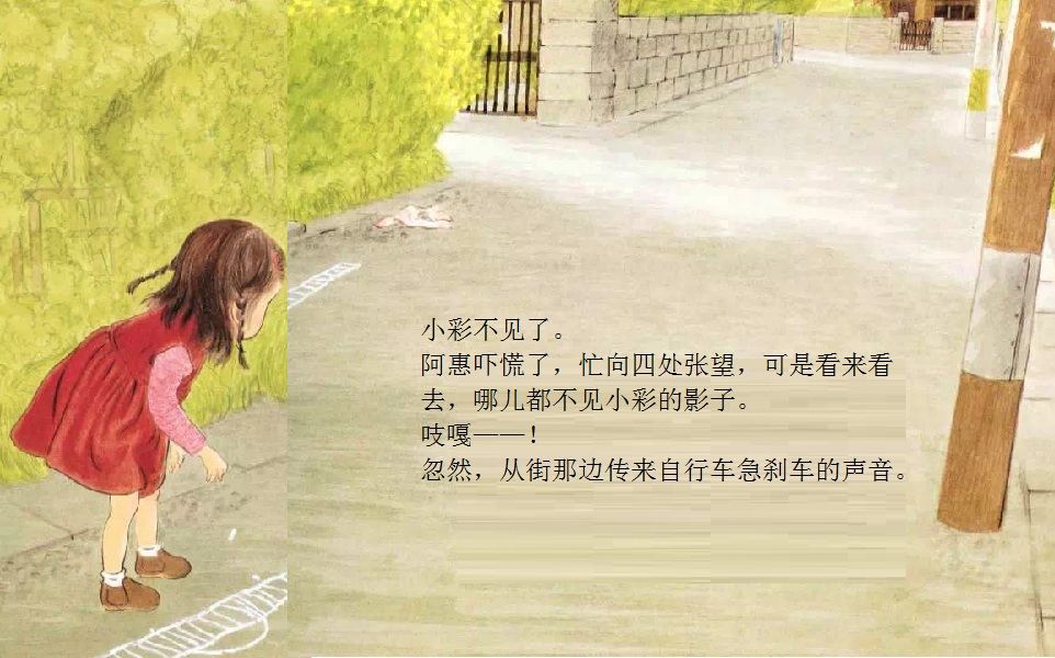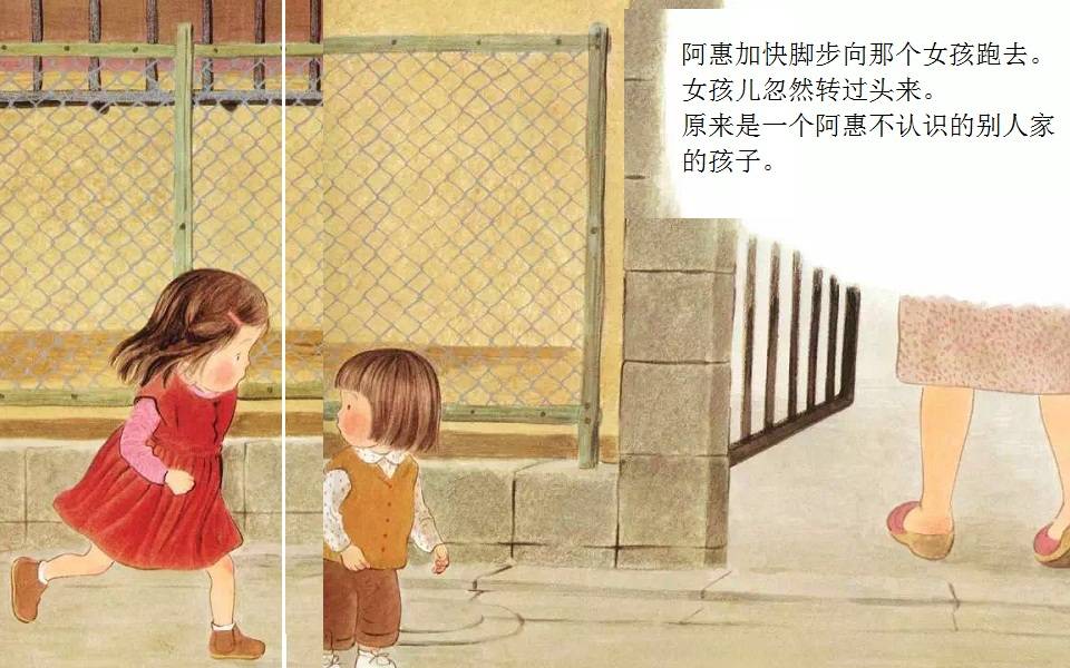 妈妈出门了,临走前把照顾妹妹的责任托付给阿惠。可是阿惠一时疏忽,竟然让妹妹走失了。幸好她很快镇定下来,自己负责任地把妹妹找了回来。这本书情节亲切、画面优美,孩子在爱意融融的故事中,随着小主人公的紧张、惊慌而情绪起伏,享受情感的陶冶,获得心灵的成长。
