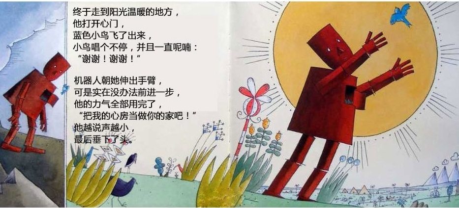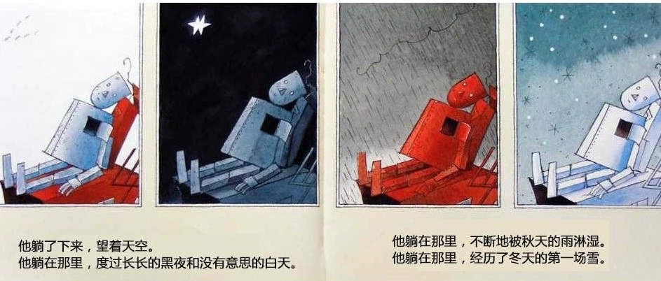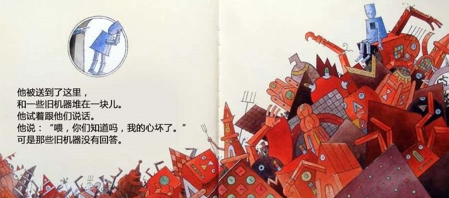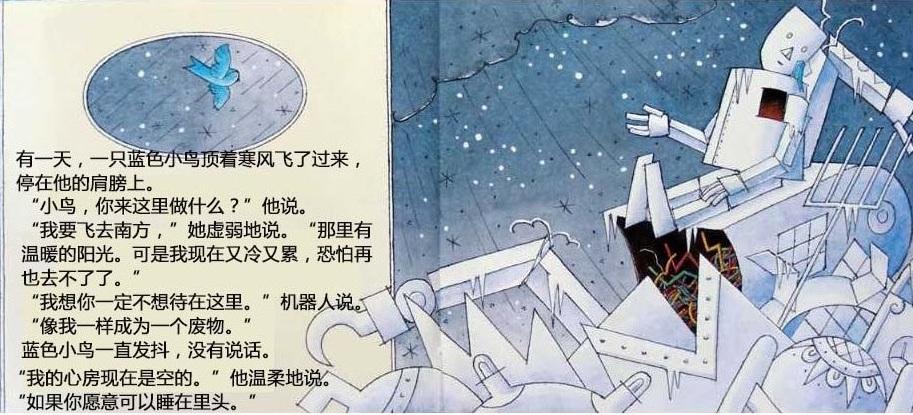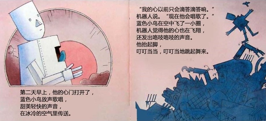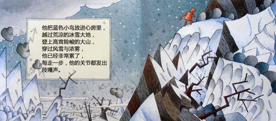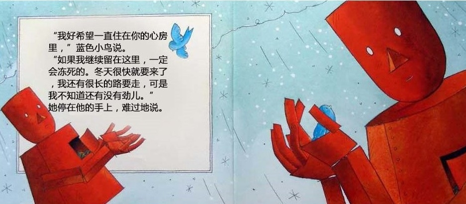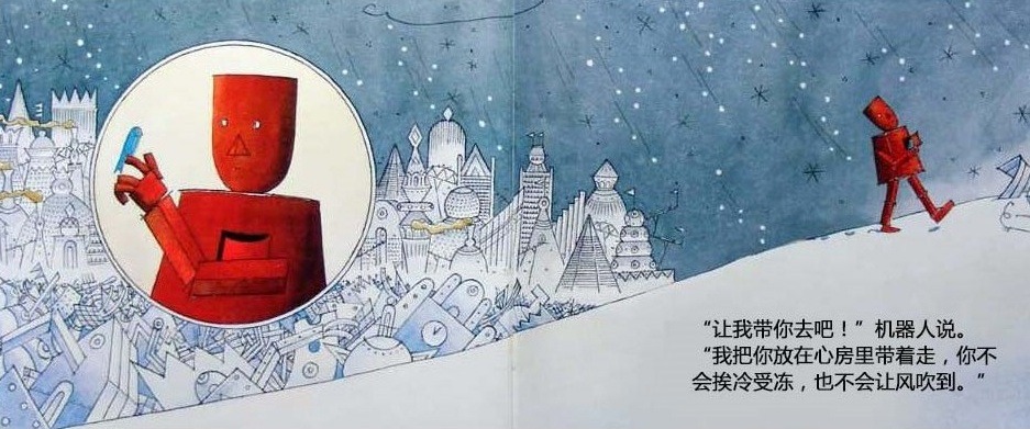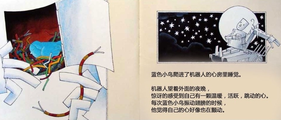 一个机器人的心坏了,被送到废弃场,不再有人需要他。他躺在那里,度过长长的黑夜和没有意思的白天。直到一个初冬的早晨,一只飞累了的蓝色小鸟住进了他的心房。他感到自己的心重新活了过来,他要把小鸟送到温暖的南方,哪怕用尽最后一点力气…… 这本书是英国著名图画书创作者大卫·卢卡斯的经典代表作。虽然是一本儿童图画书,但是它对生命意义的全市扣动每个读者的心弦,唤起他们对爱的记忆和向往。