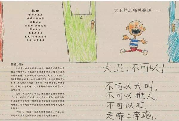 《大卫上学去》一书主要描述了大卫在学校学习规矩的状况。与《大卫,不可以》最大的不同是,在前一本书里,大卫唯我独尊、一个人胡闹;而在后一本书里,大卫的身边有了其他的小朋友,他必须得学会与别人相处,并且尊重学校里的规矩。 美国凯迪克银牌奖得主大卫·香农生于美国华盛顿,毕业于加州的艺术中心设计学院,之后到纽约发展,他为《纽约时报》、《时报杂志》和《滚石杂志》都画过插图,也曾设计过书籍封面。1989年,香农开始创作儿童图画书,他的作品屡屡得奖,其中《大卫,不可以!》夺得了1989凯迪克银牌奖、美国图书馆协会好书奖及《纽约时报》最佳图匦书奖。另一部作品《下雨了》得到了2001年的金风筝奖。