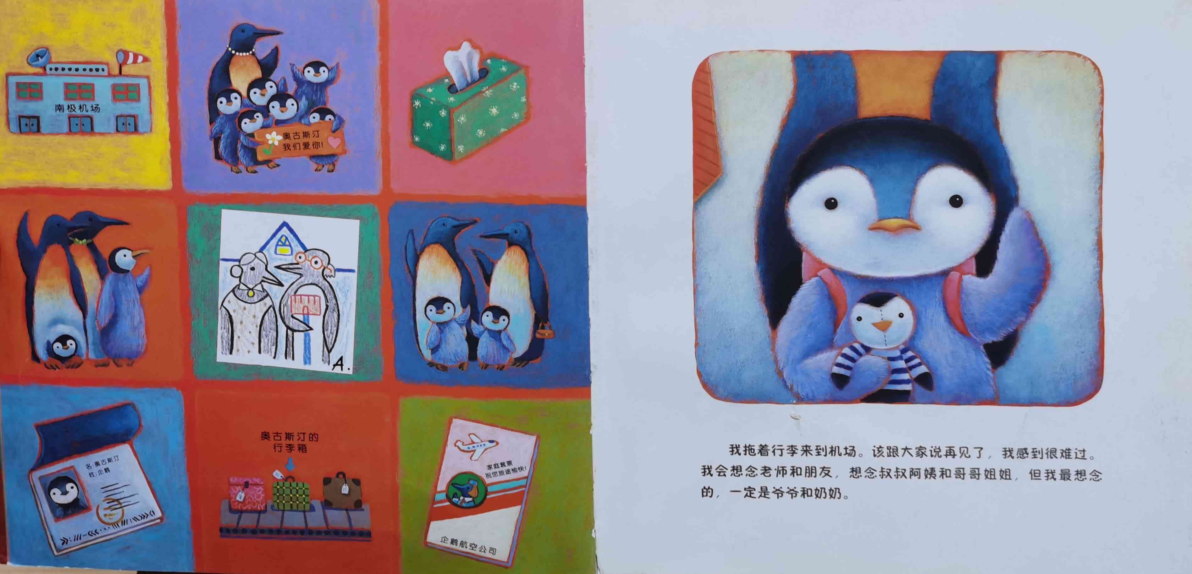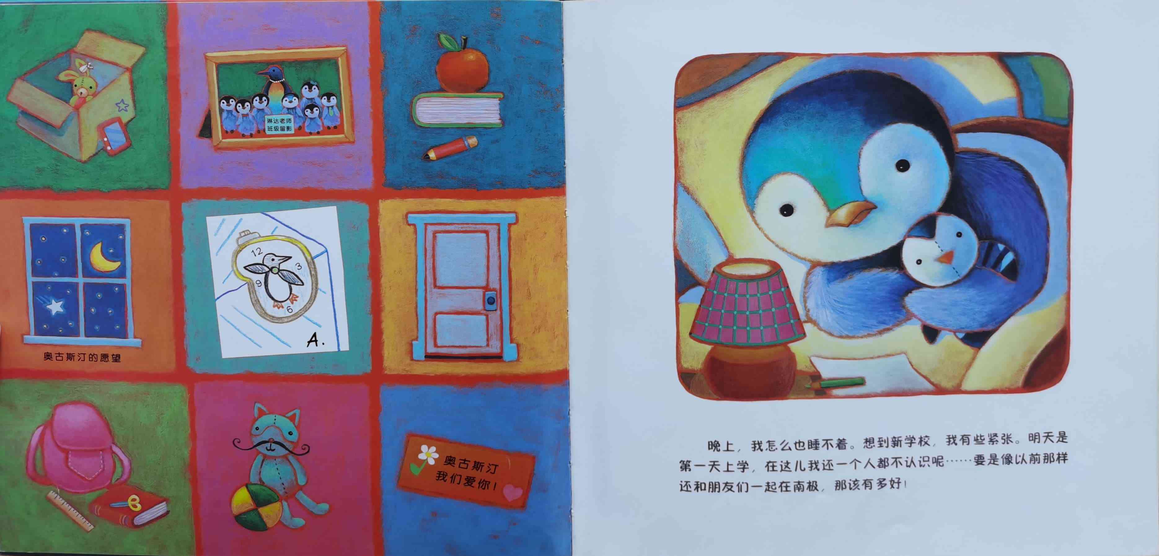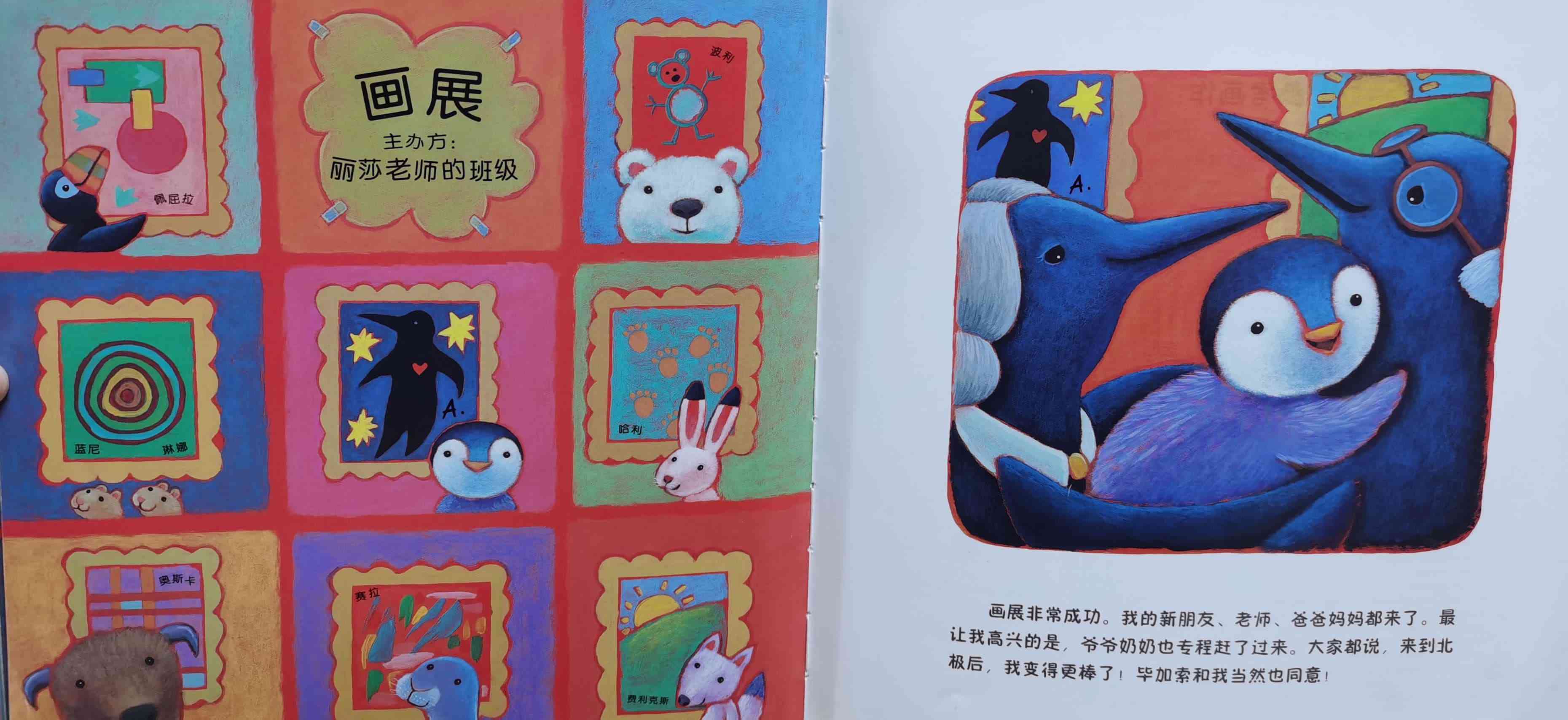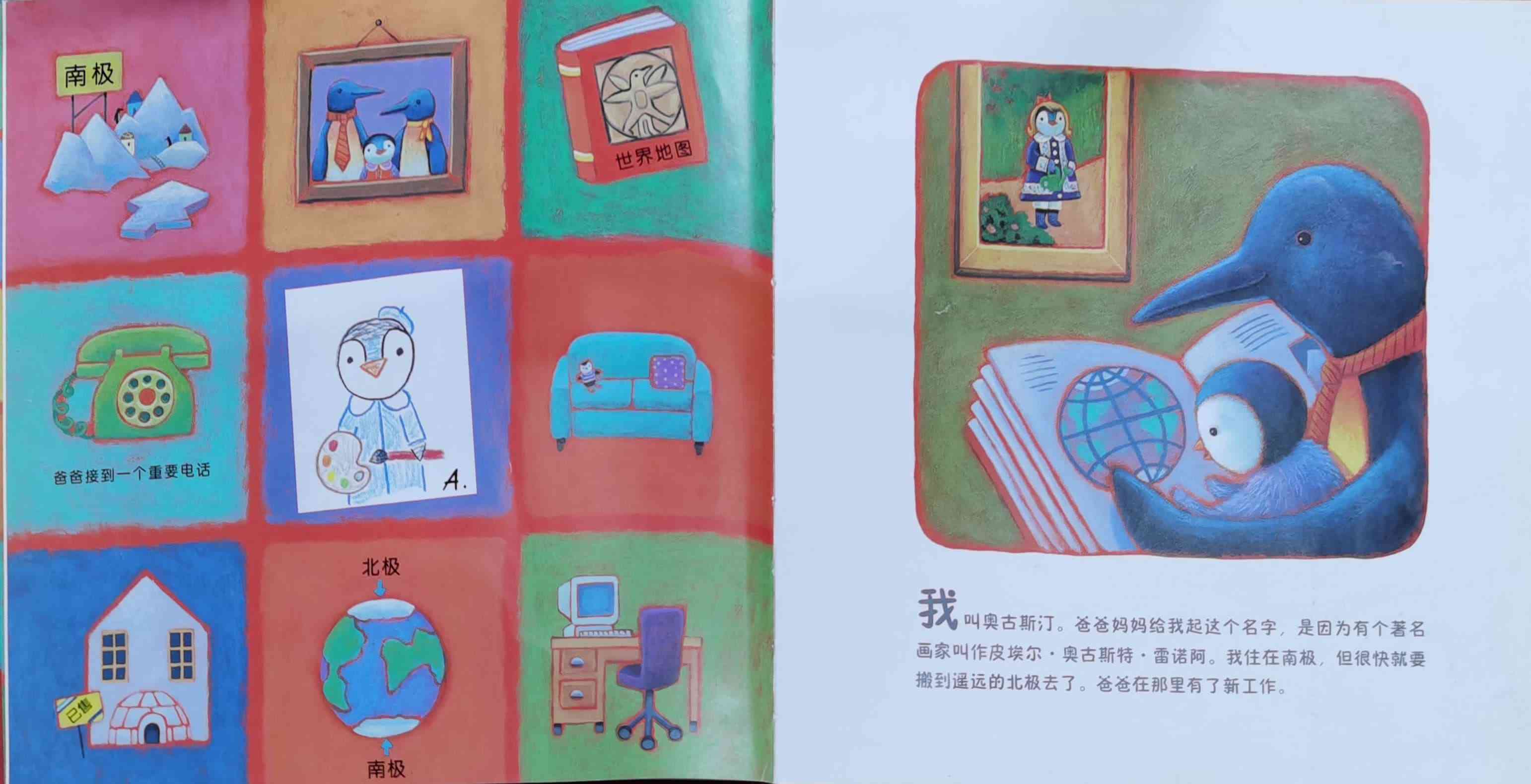 喜欢画画的小企鹅奥古斯汀跟着爸爸妈妈搬家去北极,因为爸爸有了新的工作。在那里,她搬进了新的房子,转进了新的学校、新的班级,认识了新的老师和同学,很快,奥古斯汀用自己的方式适应了新的生活,并且还举办了自己的画展。