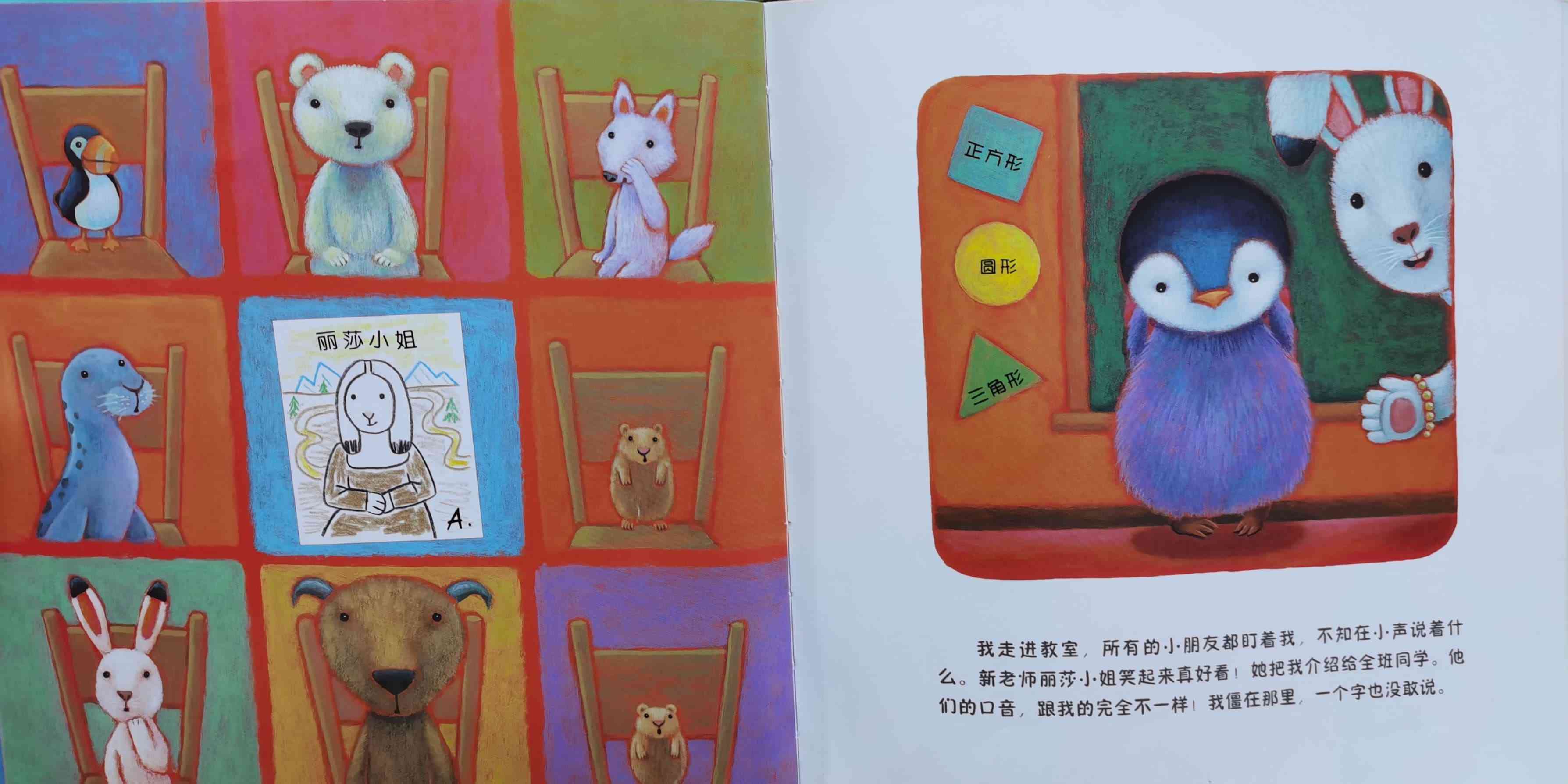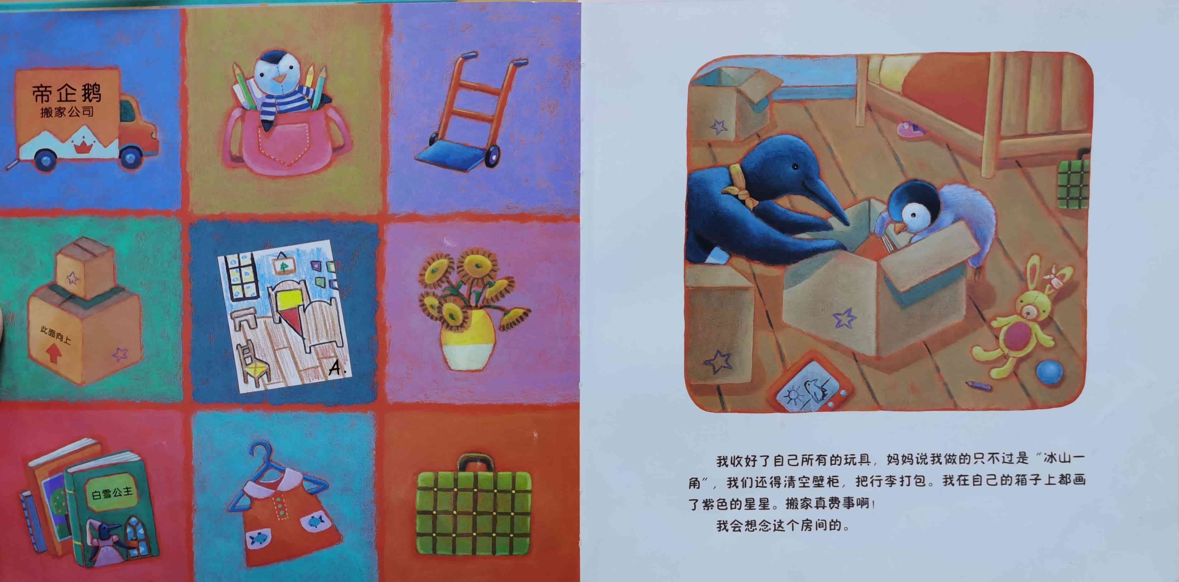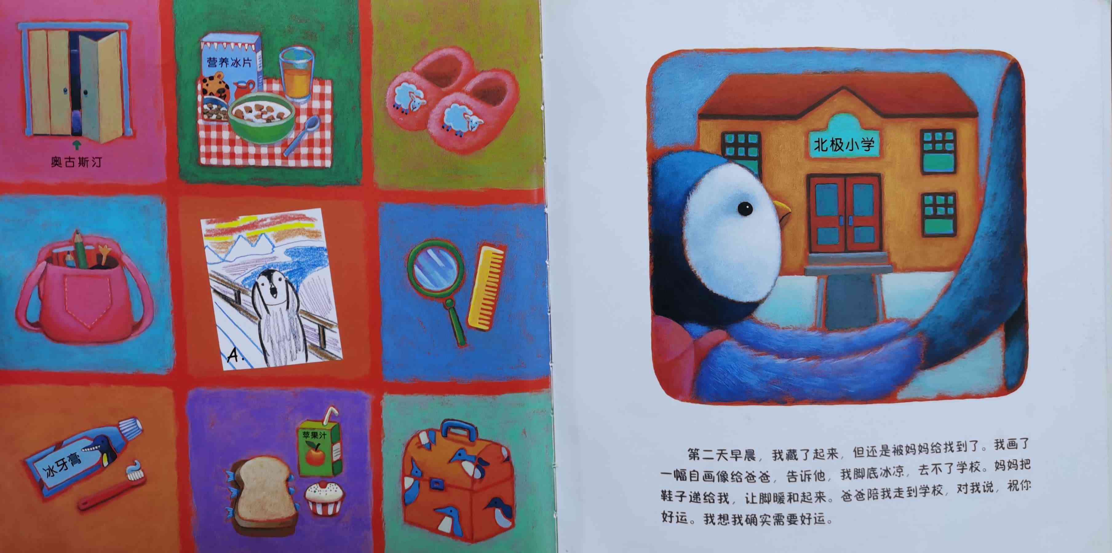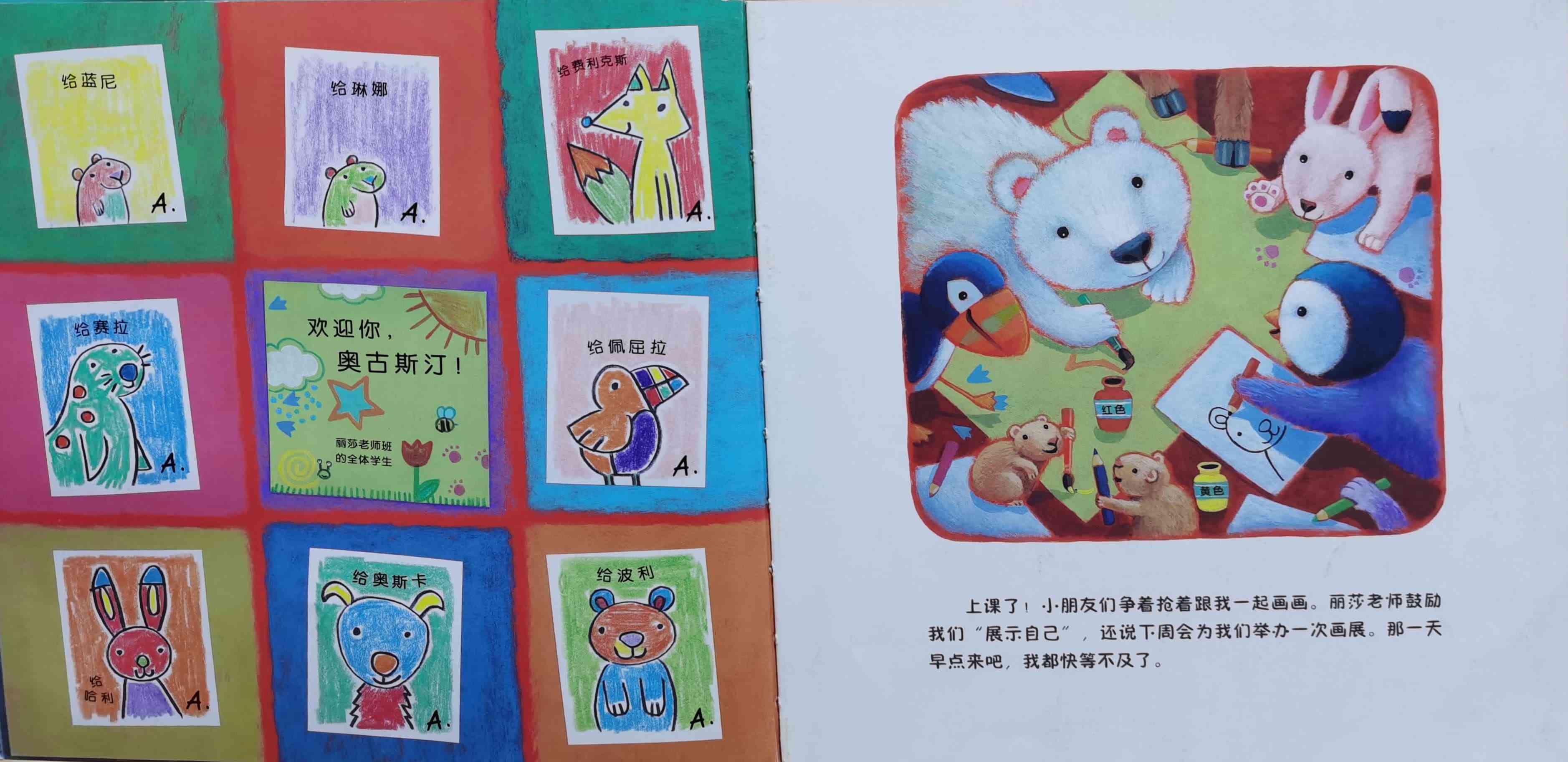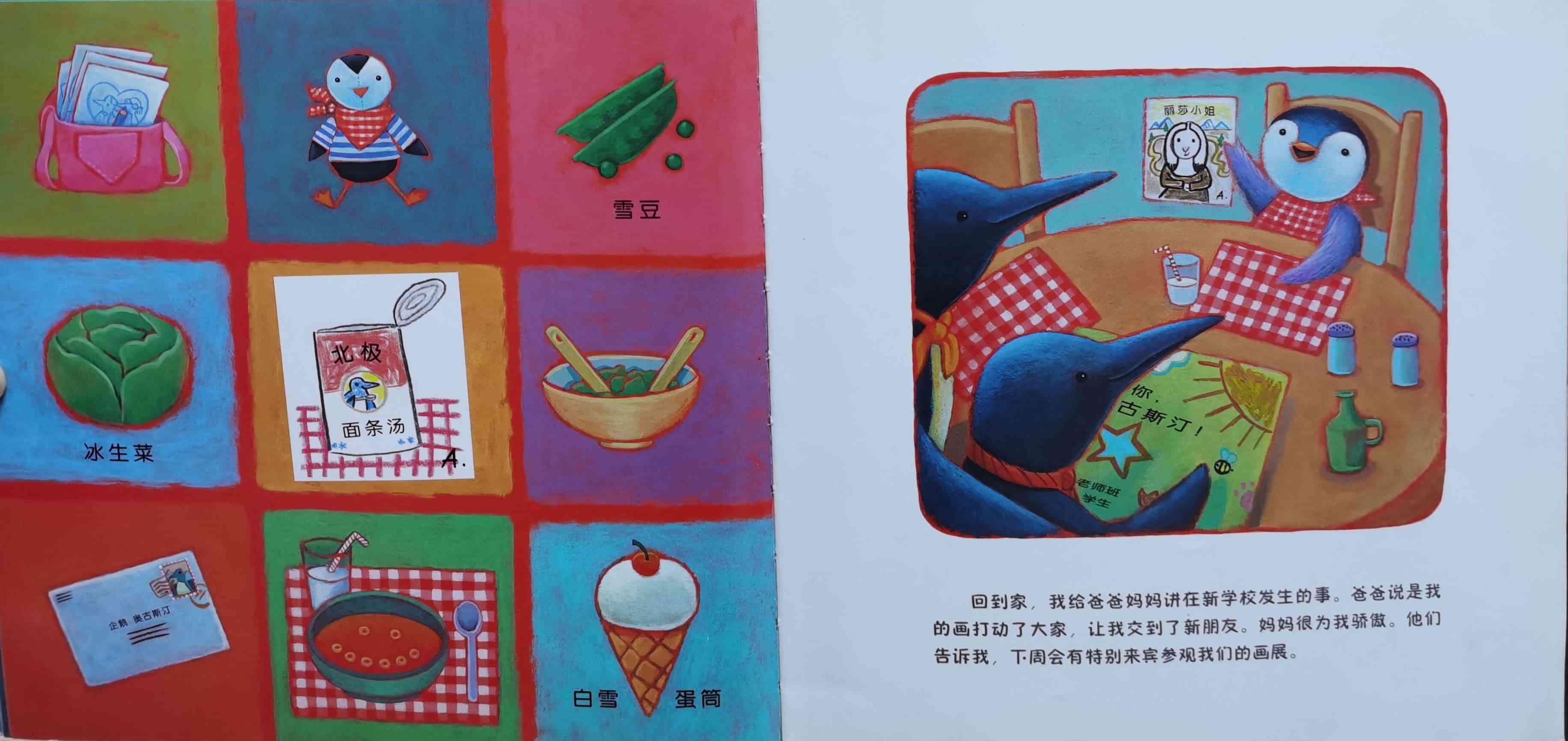 喜欢画画的小企鹅奥古斯汀跟着爸爸妈妈搬家去北极,因为爸爸有了新的工作。在那里,她搬进了新的房子,转进了新的学校、新的班级,认识了新的老师和同学,很快,奥古斯汀用自己的方式适应了新的生活,并且还举办了自己的画展。