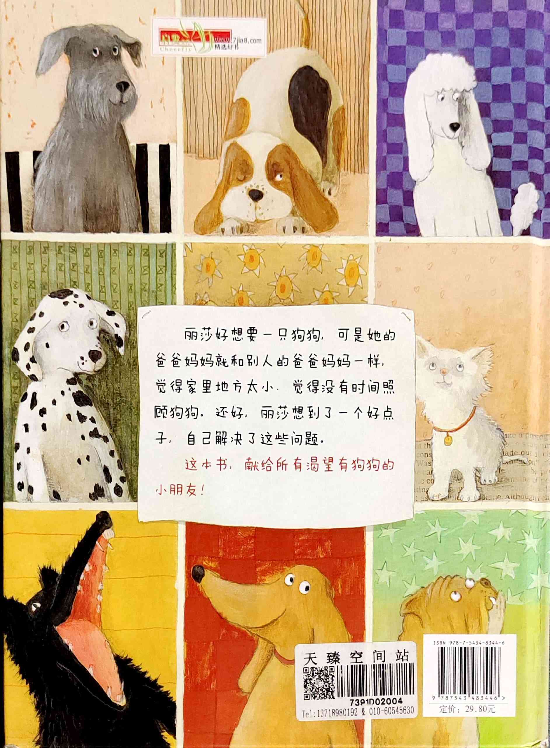 丽莎好想要一只狗狗,可是她的爸爸妈妈就和别人的爸爸妈妈一样,觉得家里地方太小,觉得没有时间照顾狗狗。还好,丽莎想到了一个好点子,自己解决了这些问题。 这本书,献给所有渴望有狗狗的小朋友!