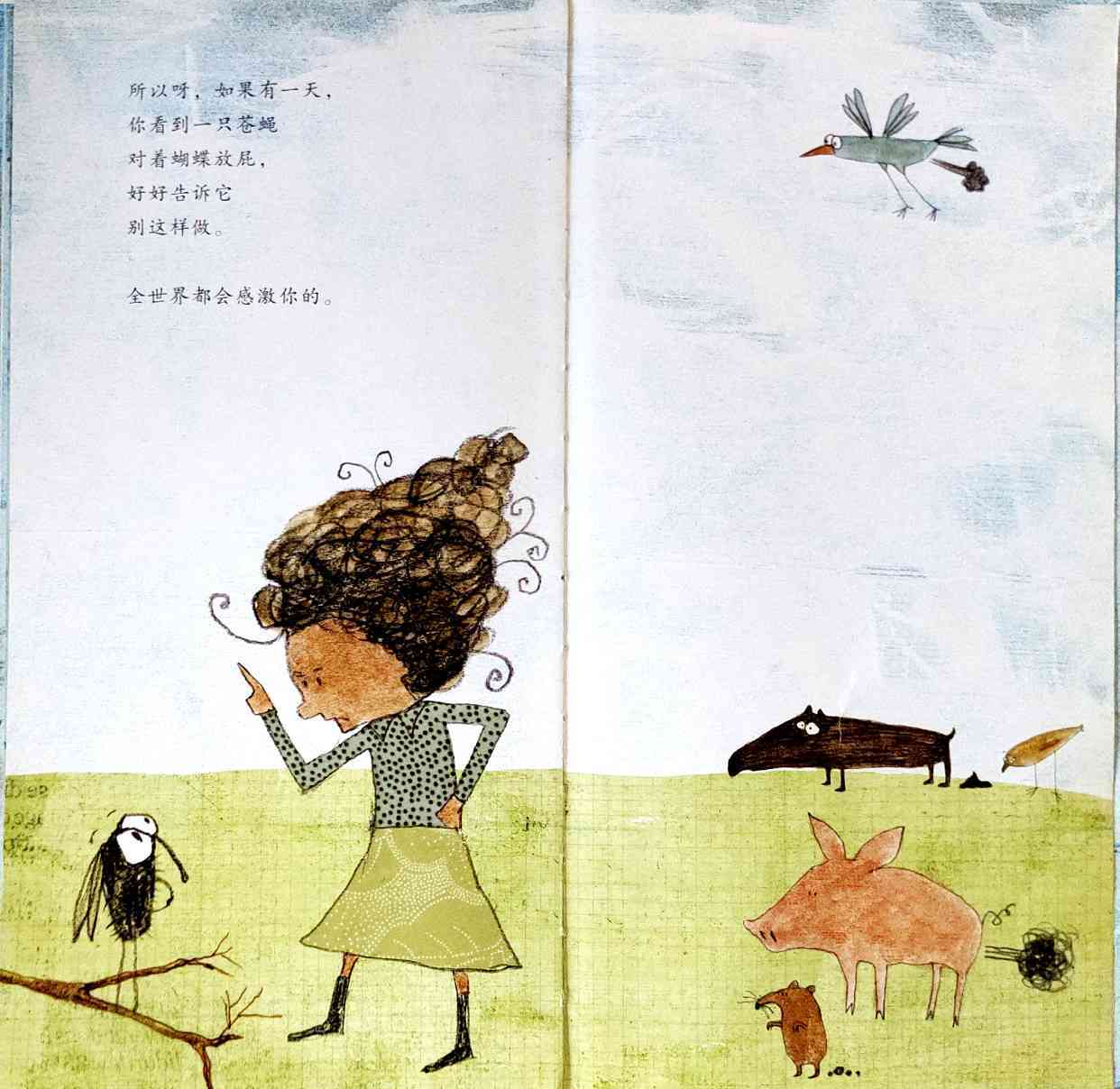 《启发精选世界优秀畅销绘本:放屁的苍蝇》内容简介:据说,南美热带雨林里的小蝴蝶,只要轻轻扇动翅膀,就能让美国的德克萨斯州在两周后刮起龙卷风。可你知道吗?如果一只懒洋洋的苍蝇对着蝴蝶放屁,会发生什么情况?当然绝不仅仅是放屁那么简单!这件小小的蠢事能让邮差一头栽进水沟、让荒野森林燃起熊熊大火、让飞机从空中无端坠落……甚至掀起毁灭人类世界的大灾难!让我们一起来看看,苍蝇的这个小动作,造成的后果究竟有多么滑稽、多么惊人!