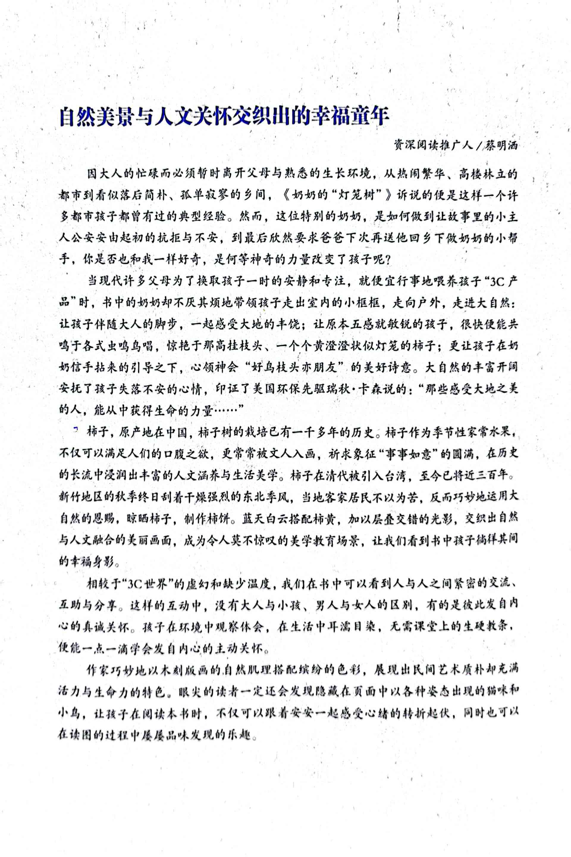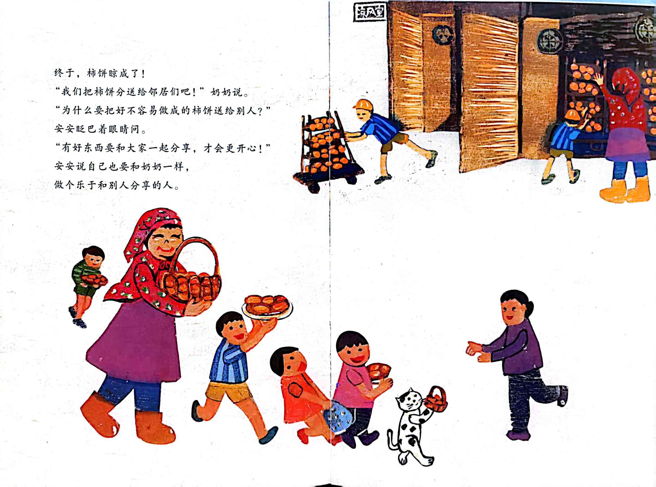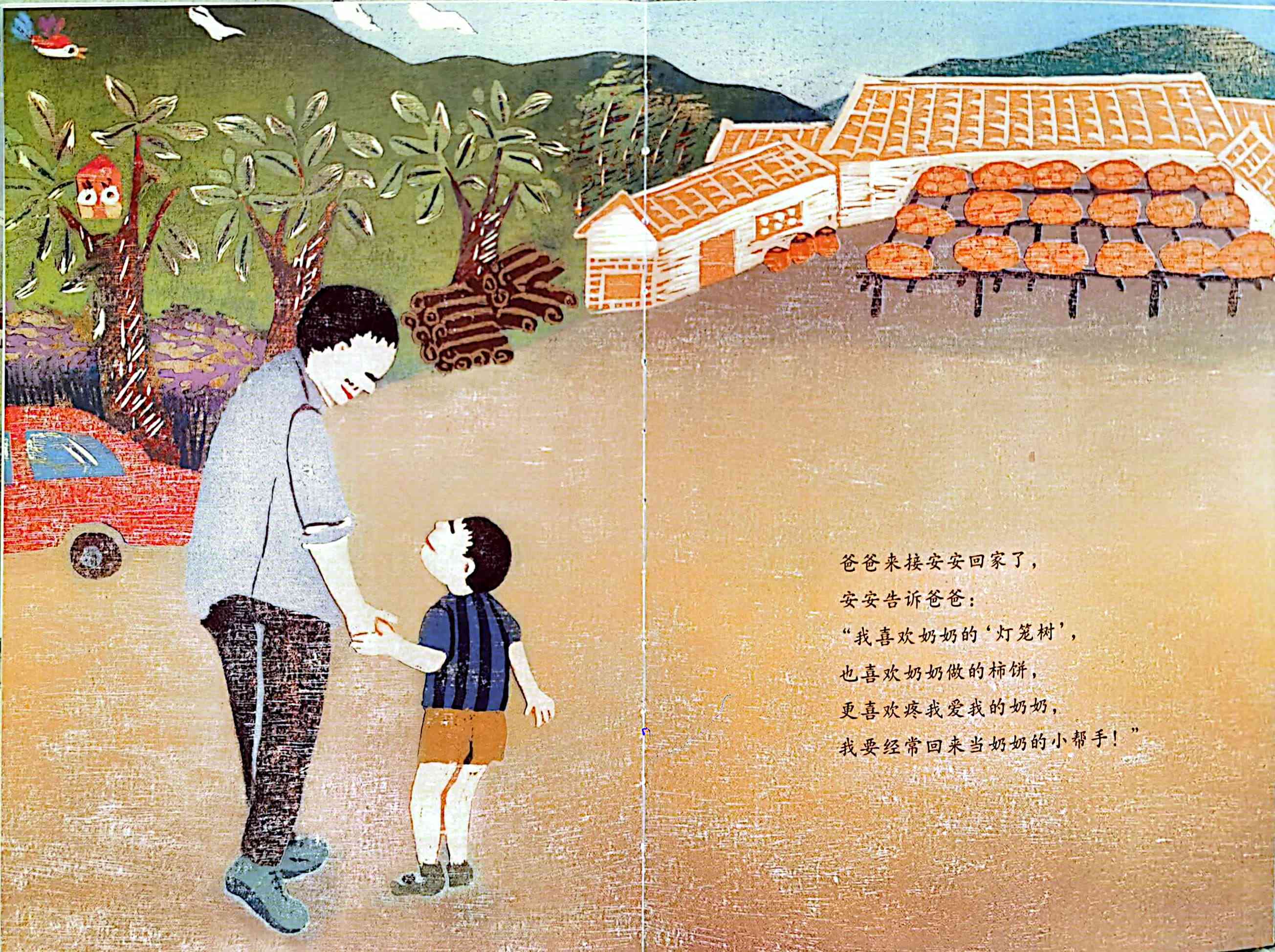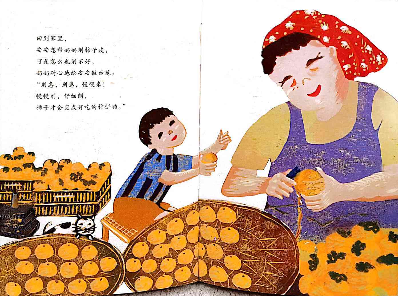 小男孩安安一开始很抵触被爸爸送去乡下的奶奶家,以为乡下生活很没意思,到了乡下,才发现乡村景色非常美丽,和奶奶一起摘柿子、 晾柿子,邻居们一起做柿饼、分享柿饼的生活也充满了乐趣,离开的时候甚至主动要求下次再来乡下做奶奶的小帮手。 ——当当网