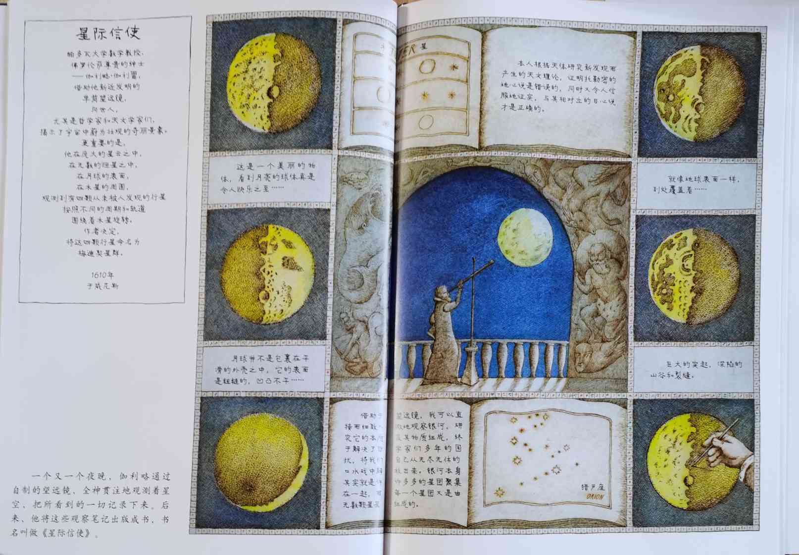 伽利略,传送星际信息的使者:他出生的时候眼睛里仿佛有星星在闪烁;他小的时候没有上学,只是跟着父亲念书;他年轻的时候喜欢质疑、与人辩论……而面对权威、压力和双目失明的挫折时,他勇敢而又执着地坚持着探索。《星际信使》,带小读者跟伽利略一同成长,它会让我们感受到 “星”的跳动,让我们发现伽利略——“我们明亮的星”,正放射出美丽的光彩。