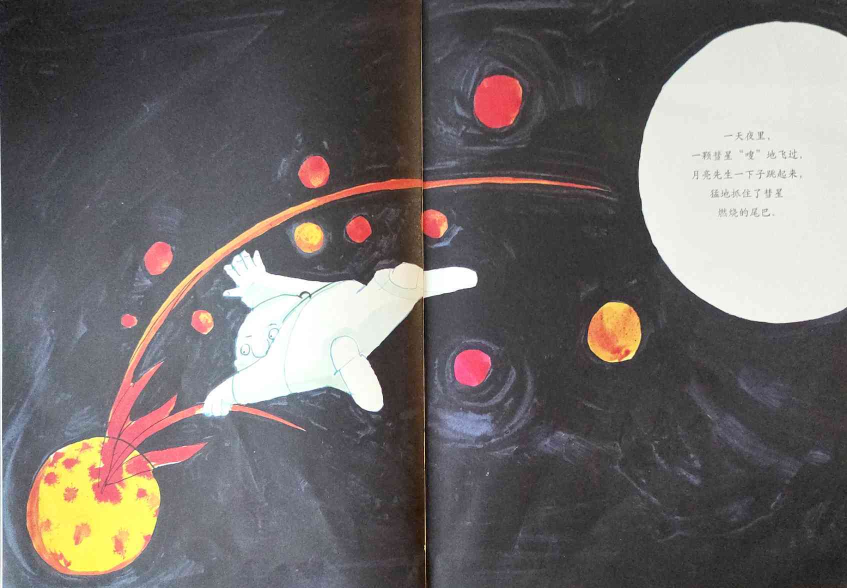住在天上的月亮先生看到地球上的人们快乐多彩的生活,非常羡慕,终于,一个偶然的机会,他抓着彗星的尾巴来到了地球,于是,开始了一次曲折的冒险……跟随绘本大师汤米・温格尔一起,在故事中学习知识,在故事中学会接纳别人。