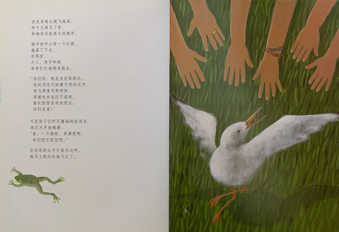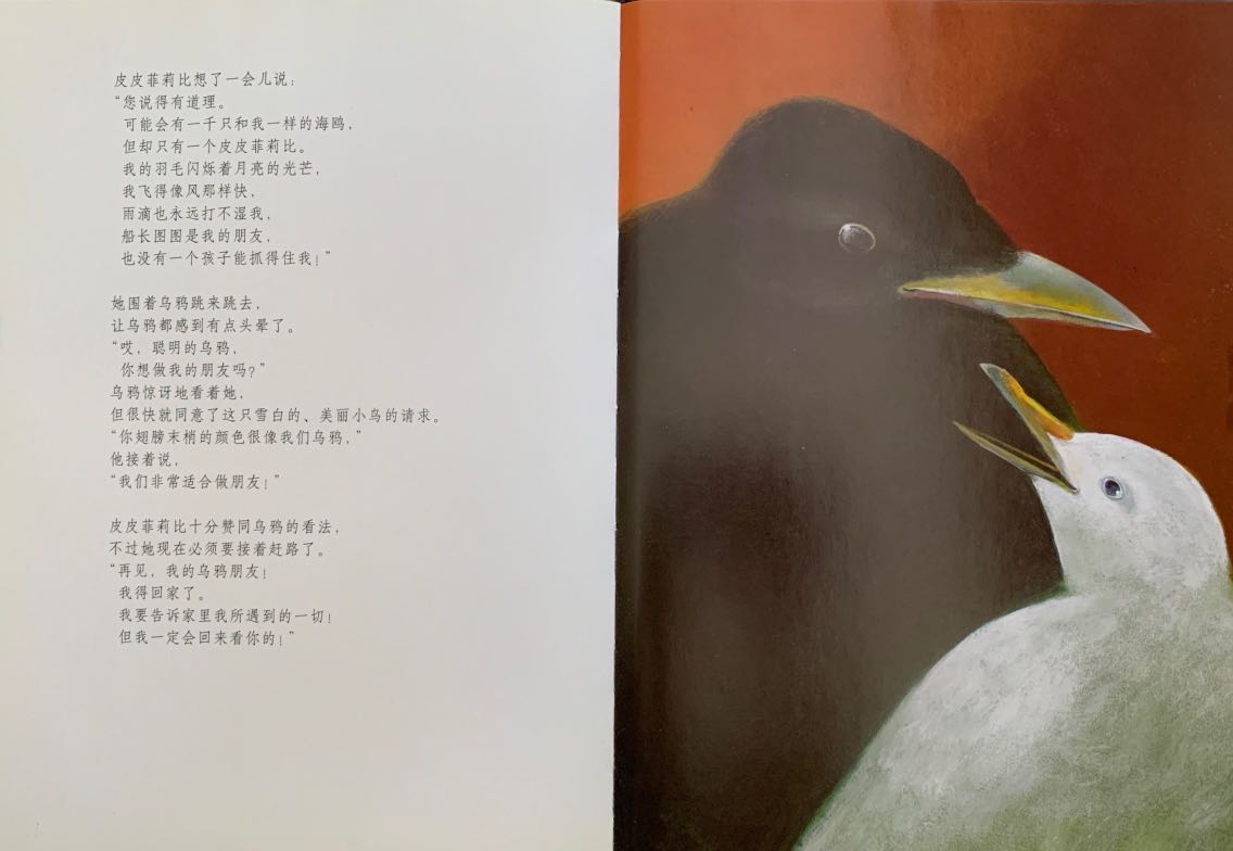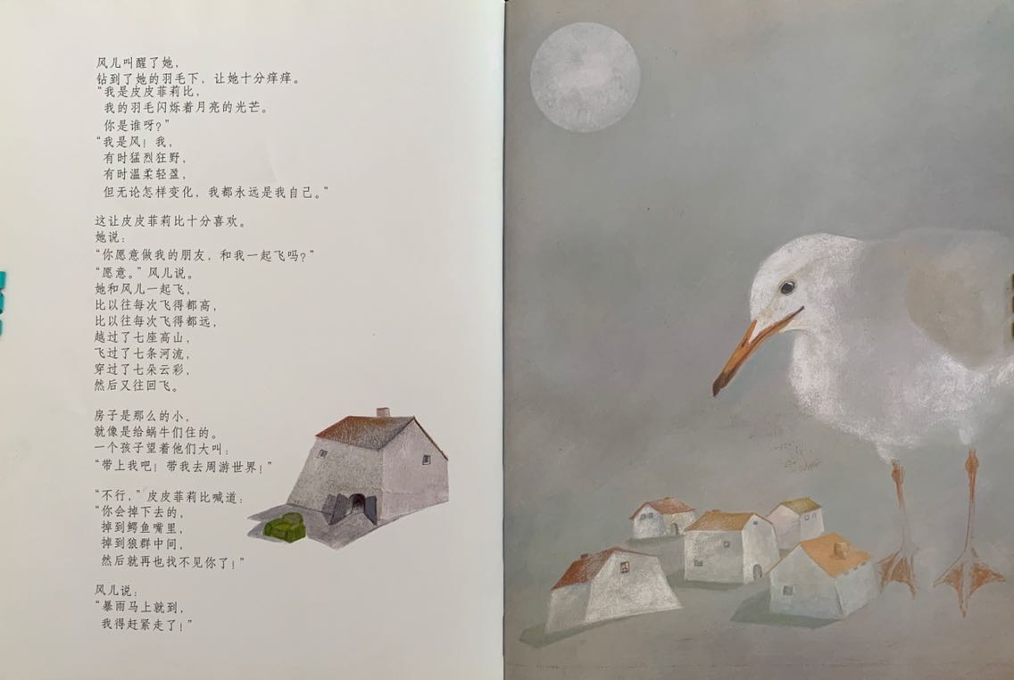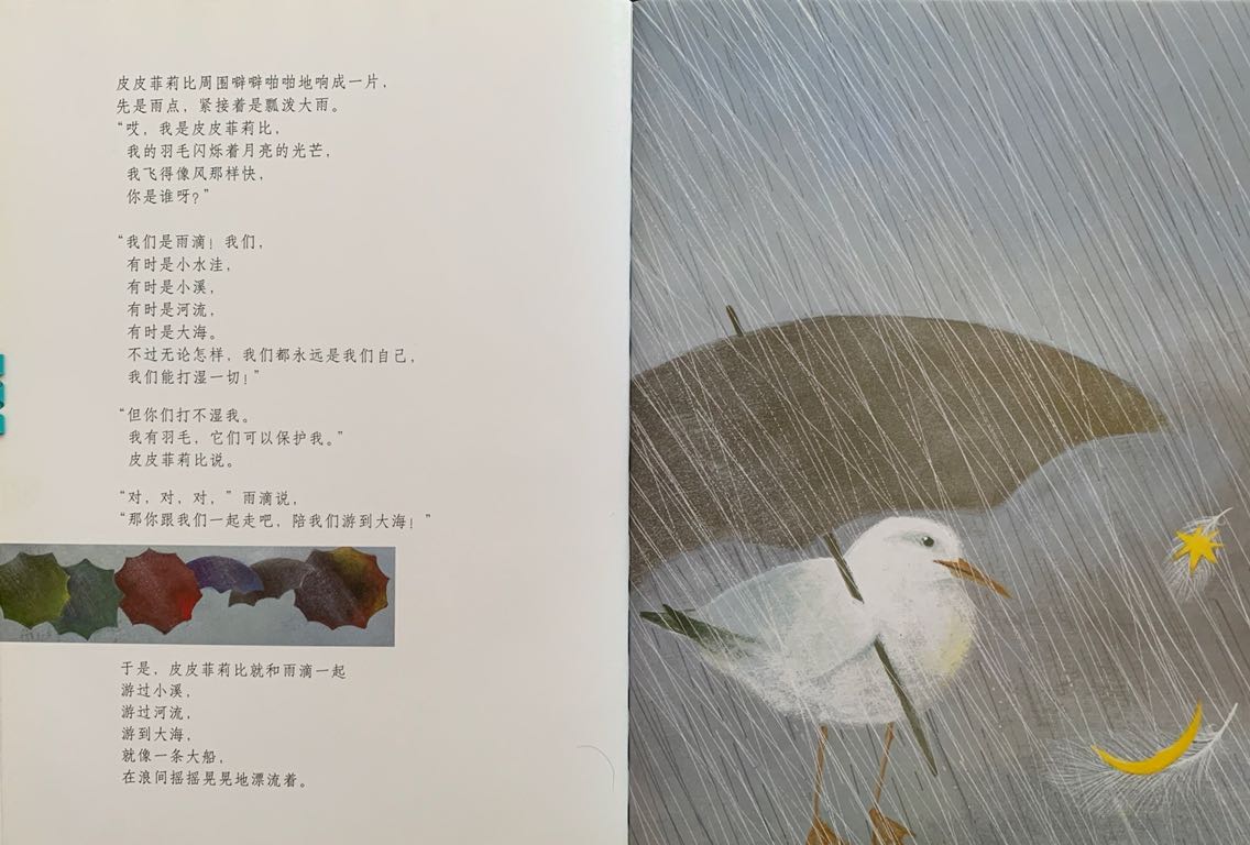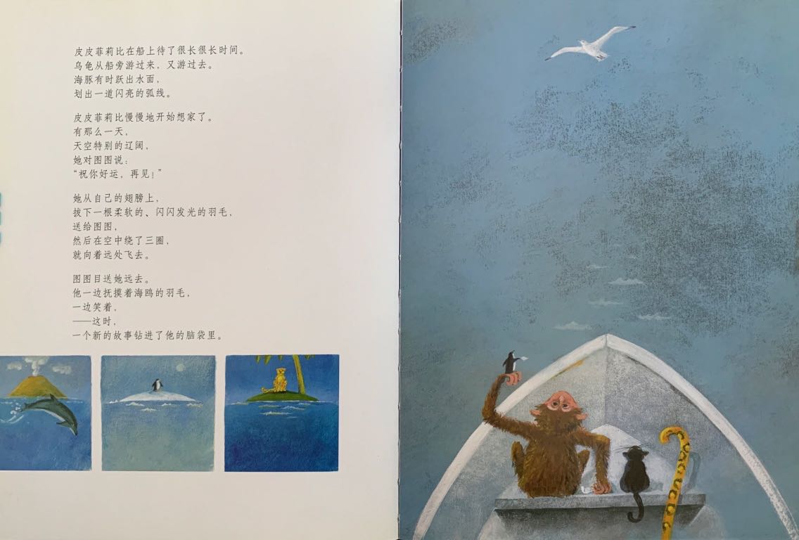 读皮皮菲莉比的故事,我们要带着读诗的感觉来读,因为它的语言凝有很强的音乐性。皮皮菲丽比一次次鸣啭歌喉,送来了纯净嘹亮的歌声,歌唱着“我的羽毛闪烁着月亮的光芒,/我可以和风一起飞翔……”每一次的叙述都增加着新的经历、新的感受,推进着情节的发展。 作为一本图画书,不可忽视绘画语言的表情达意。全书大部分画面色调柔和、明快,构图远远近近,很有节奏感。用色大胆,对比鲜明。画面视角多变,或俯瞰,或仰视,读者的目光被牵引着,好像和皮皮菲莉比在一起翱翔。 读图就是一种寻胜探幽,更需一双明敏的眼睛,不放过任何一幅幅大大小小的画面。当皮皮菲莉比告别图图,送他一根柔软、闪光的羽毛,请你仔细找找,那根羽毛在哪儿?当你看完全书,我建议你再从封面开始重新浏览一遍,你会对封面的那幅特写画有新的理解。就是蝴蝶页上那众多飘飞的白羽毛,也会把你再一次带上云天,和皮皮菲莉比比翼双飞……