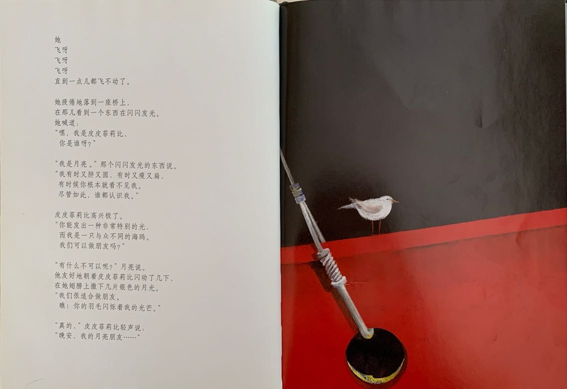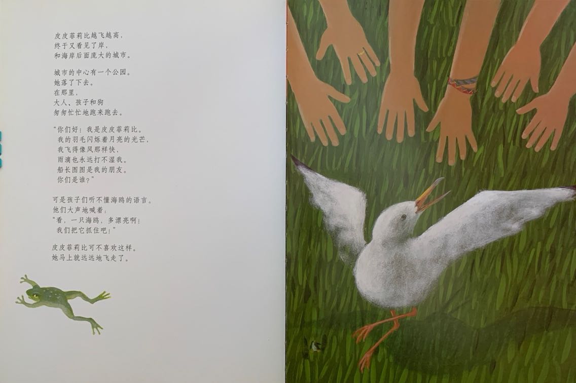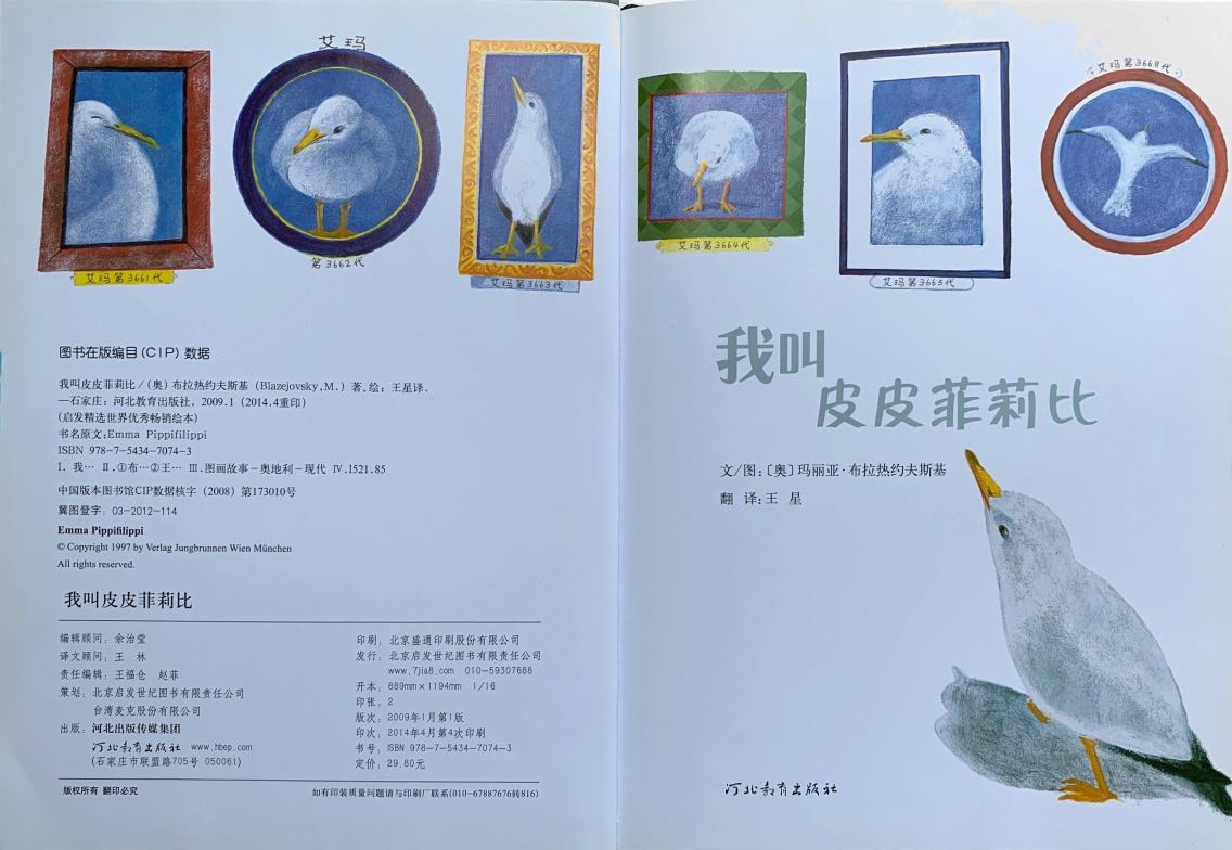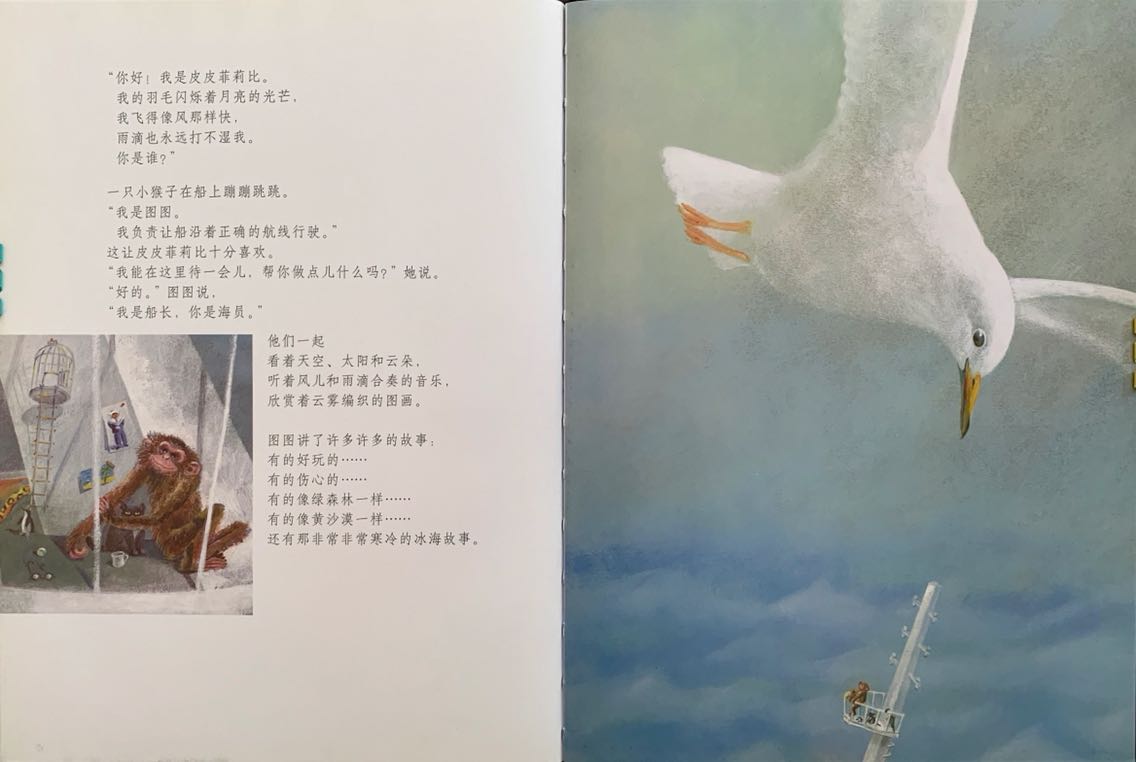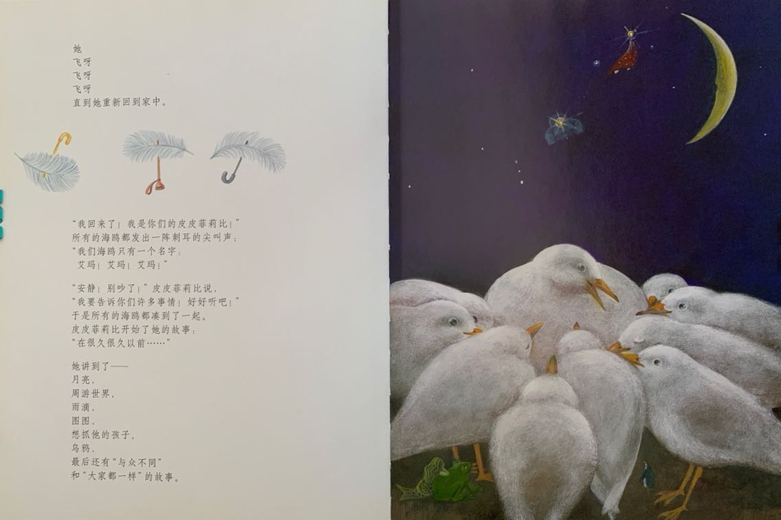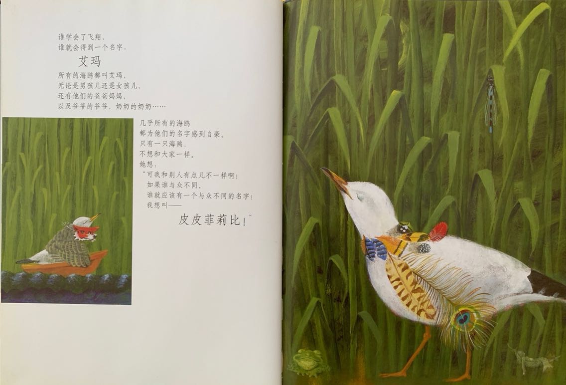 读皮皮菲莉比的故事,我们要带着读诗的感觉来读,因为它的语言凝有很强的音乐性。皮皮菲丽比一次次鸣啭歌喉,送来了纯净嘹亮的歌声,歌唱着“我的羽毛闪烁着月亮的光芒,/我可以和风一起飞翔……”每一次的叙述都增加着新的经历、新的感受,推进着情节的发展。 作为一本图画书,不可忽视绘画语言的表情达意。全书大部分画面色调柔和、明快,构图远远近近,很有节奏感。用色大胆,对比鲜明。画面视角多变,或俯瞰,或仰视,读者的目光被牵引着,好像和皮皮菲莉比在一起翱翔。 读图就是一种寻胜探幽,更需一双明敏的眼睛,不放过任何一幅幅大大小小的画面。当皮皮菲莉比告别图图,送他一根柔软、闪光的羽毛,请你仔细找找,那根羽毛在哪儿?当你看完全书,我建议你再从封面开始重新浏览一遍,你会对封面的那幅特写画有新的理解。就是蝴蝶页上那众多飘飞的白羽毛,也会把你再一次带上云天,和皮皮菲莉比比翼双飞……
