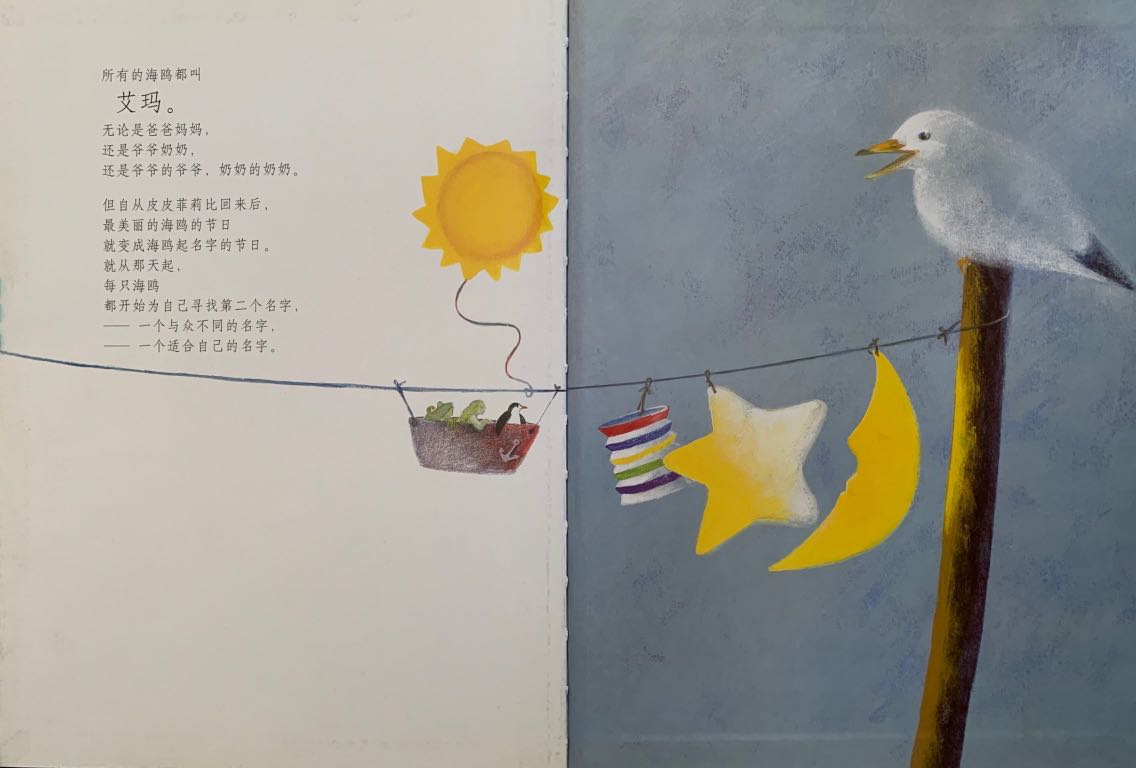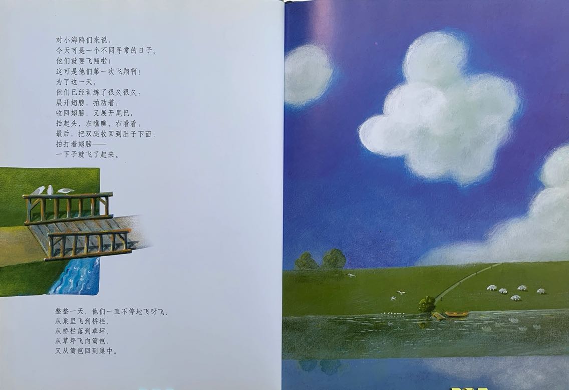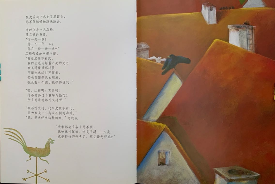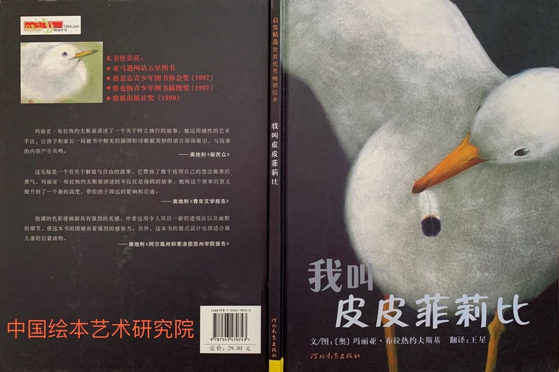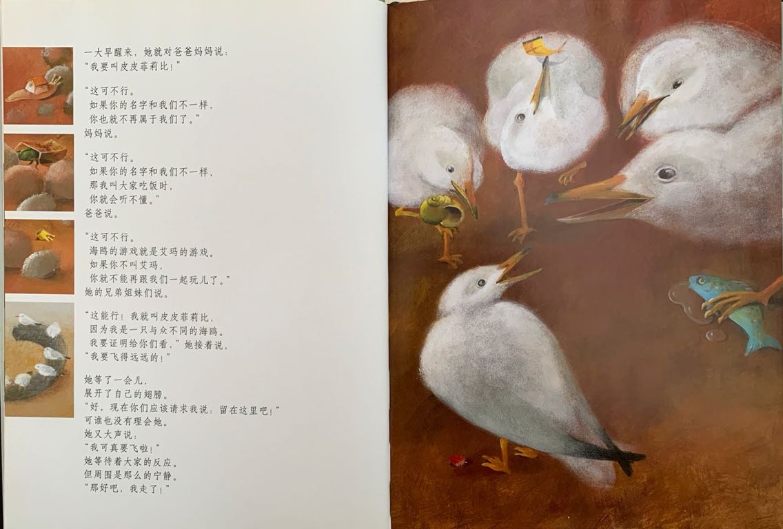 读皮皮菲莉比的故事,我们要带着读诗的感觉来读,因为它的语言凝有很强的音乐性。皮皮菲丽比一次次鸣啭歌喉,送来了纯净嘹亮的歌声,歌唱着“我的羽毛闪烁着月亮的光芒,/我可以和风一起飞翔……”每一次的叙述都增加着新的经历、新的感受,推进着情节的发展。 作为一本图画书,不可忽视绘画语言的表情达意。全书大部分画面色调柔和、明快,构图远远近近,很有节奏感。用色大胆,对比鲜明。画面视角多变,或俯瞰,或仰视,读者的目光被牵引着,好像和皮皮菲莉比在一起翱翔。 读图就是一种寻胜探幽,更需一双明敏的眼睛,不放过任何一幅幅大大小小的画面。当皮皮菲莉比告别图图,送他一根柔软、闪光的羽毛,请你仔细找找,那根羽毛在哪儿?当你看完全书,我建议你再从封面开始重新浏览一遍,你会对封面的那幅特写画有新的理解。就是蝴蝶页上那众多飘飞的白羽毛,也会把你再一次带上云天,和皮皮菲莉比比翼双飞……