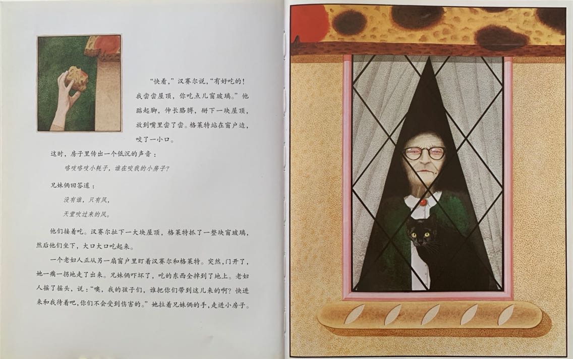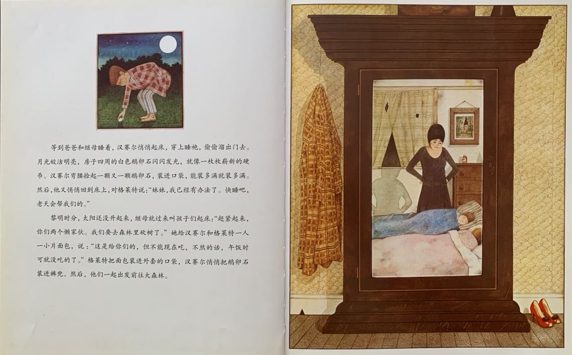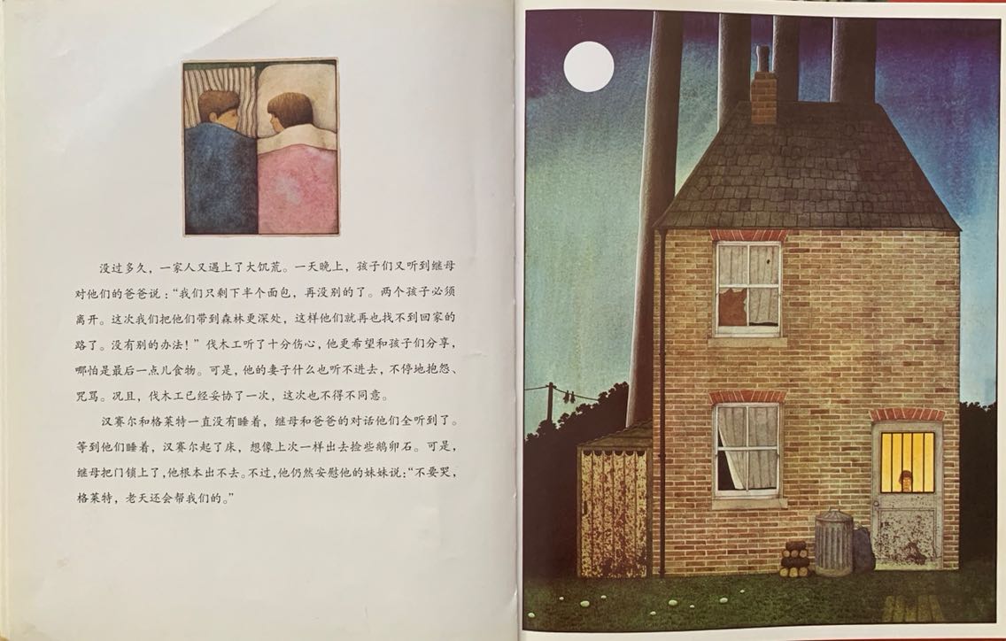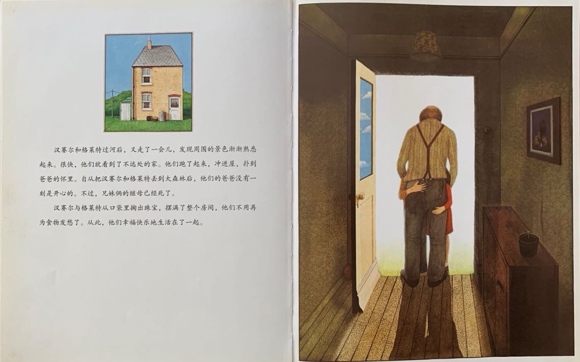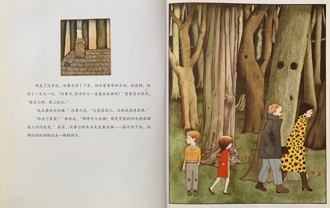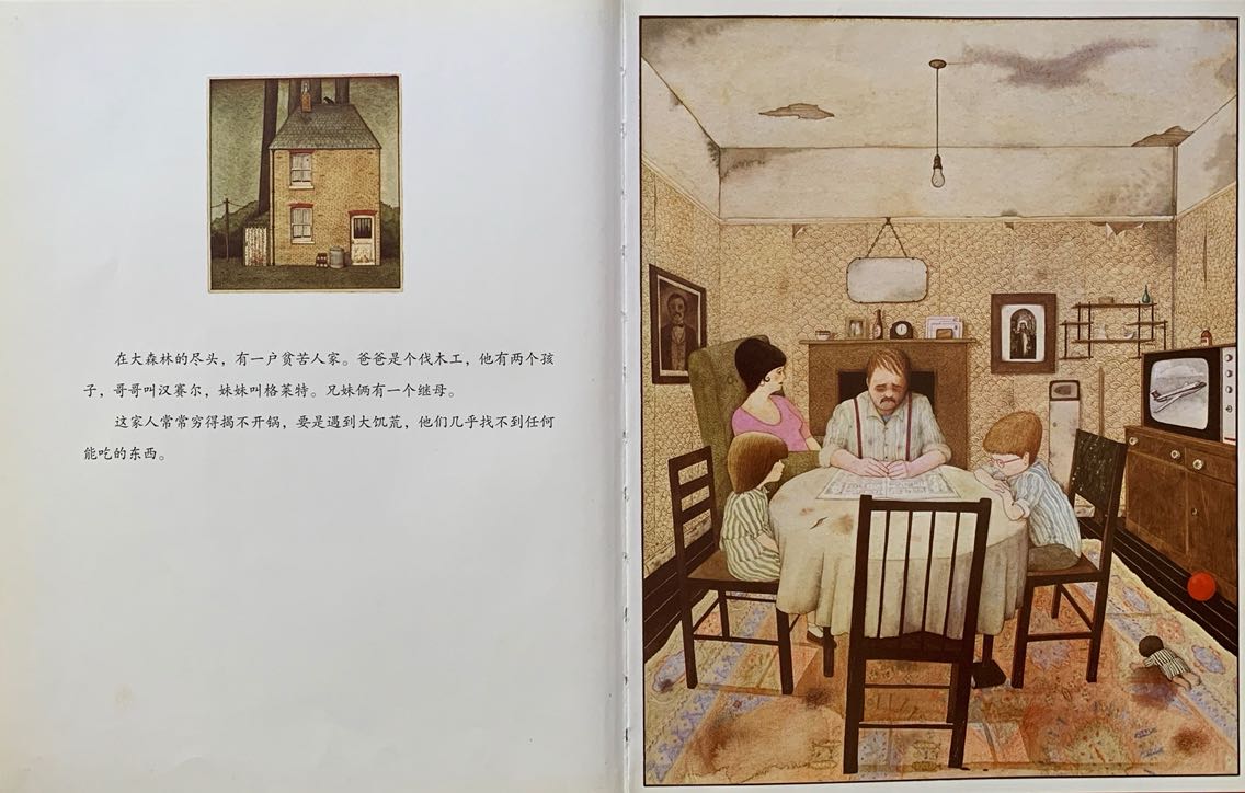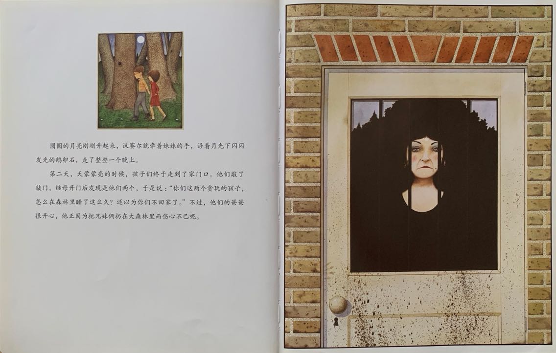 - 安东尼·布朗式绘本语言臻于成熟的标志(阿甲语) - 对我来说,设计一本图画书就好像拍一部电影,书的结构是特写和远景的结合体。而我的工作,则是天分(冒险这么说)和思考的结合体,两者很难分开。(安东尼·布朗语) - 感受“画中画”, 体验解读“秘密”的乐趣 《汉赛尔与格莱特》选自格林童话,安东尼布朗改编创作。在大森林深处住着一户穷苦人家,爸爸是个樵夫,养育了两个孩子,男孩叫汉赛尔,女孩叫格莱特。兄妹俩有个继母。一家人穷得揭不开锅,遇到饥荒,什么吃的都找不到。一天,樵夫愁眉苦脸地躺在床上,发愁日子怎么过下去。他的妻子出了个主意——把两个孩子丢在大森林里。樵夫不同意,却也没有办法。第二天,一家四口向森林深处走去……其实,兄妹俩早已听到了他们夜里的对话,汉赛尔已经想好了对策,并顺利找到了回家的路。不久,饥荒又来了,樵夫没办法,只好又听从了继母的话,将一双儿女带到森林更深处。这次,汉赛尔与格莱特没能如愿回到家,他们迷路了……就在奄奄一息之际,一间美味的面包小房子出现了,还有一位“善良”的老奶奶。兄妹俩还能逃出大森林吗?