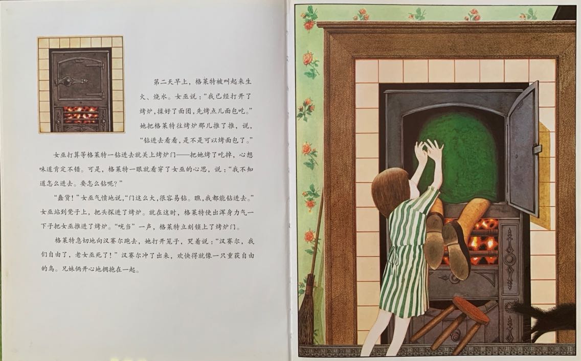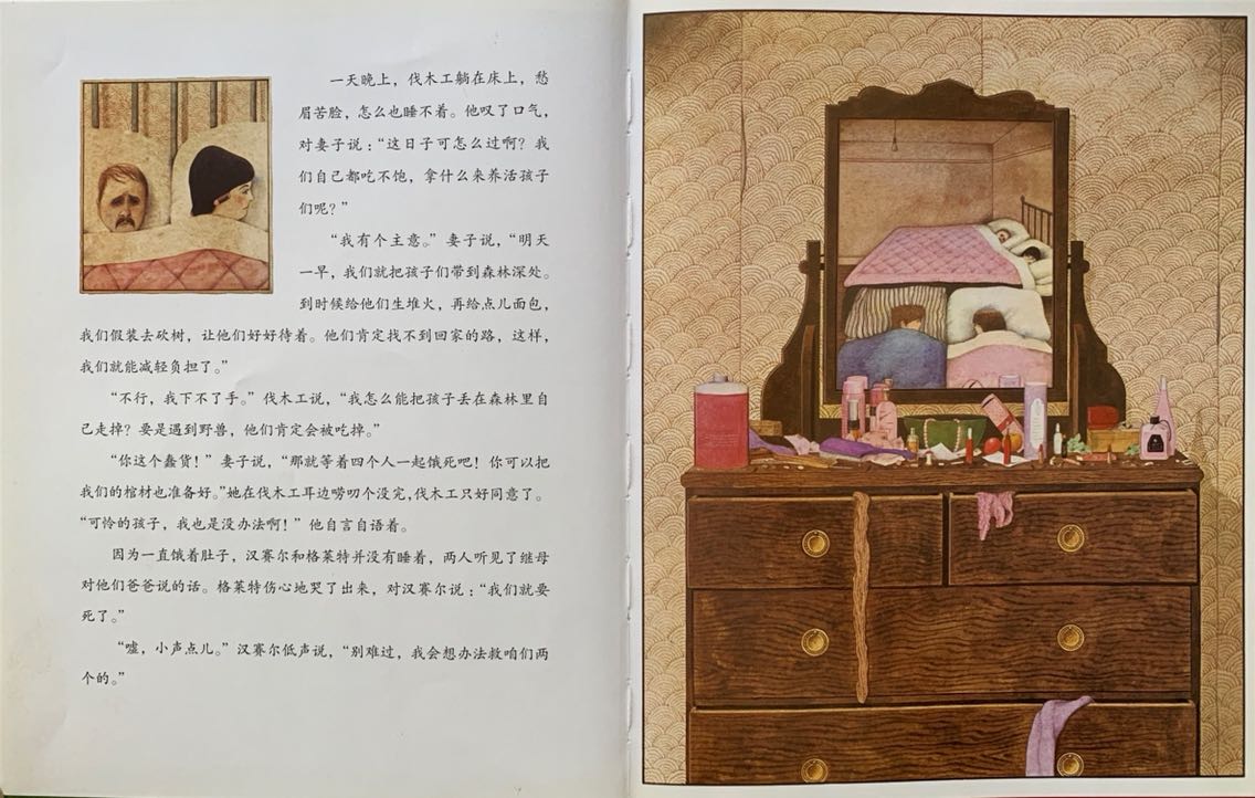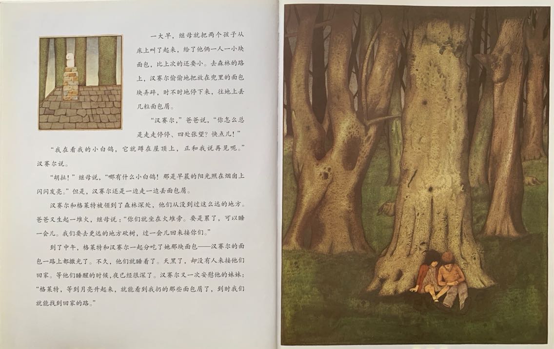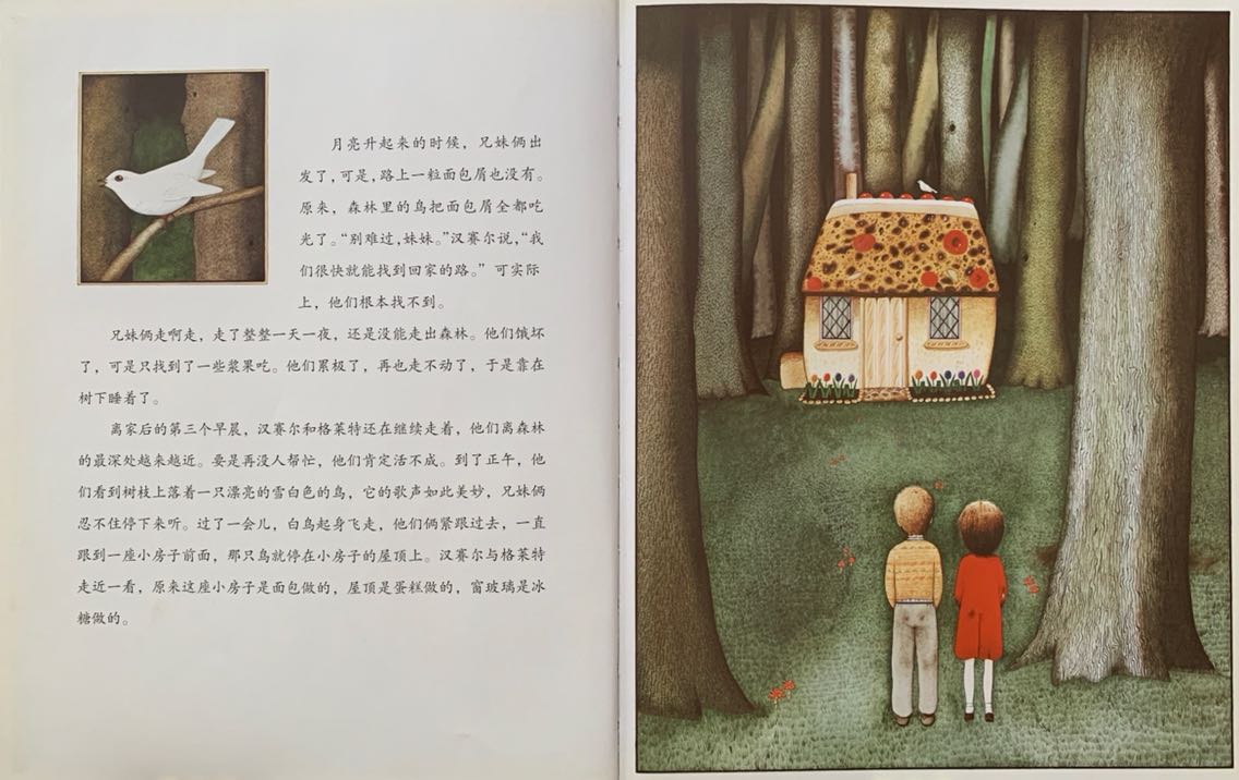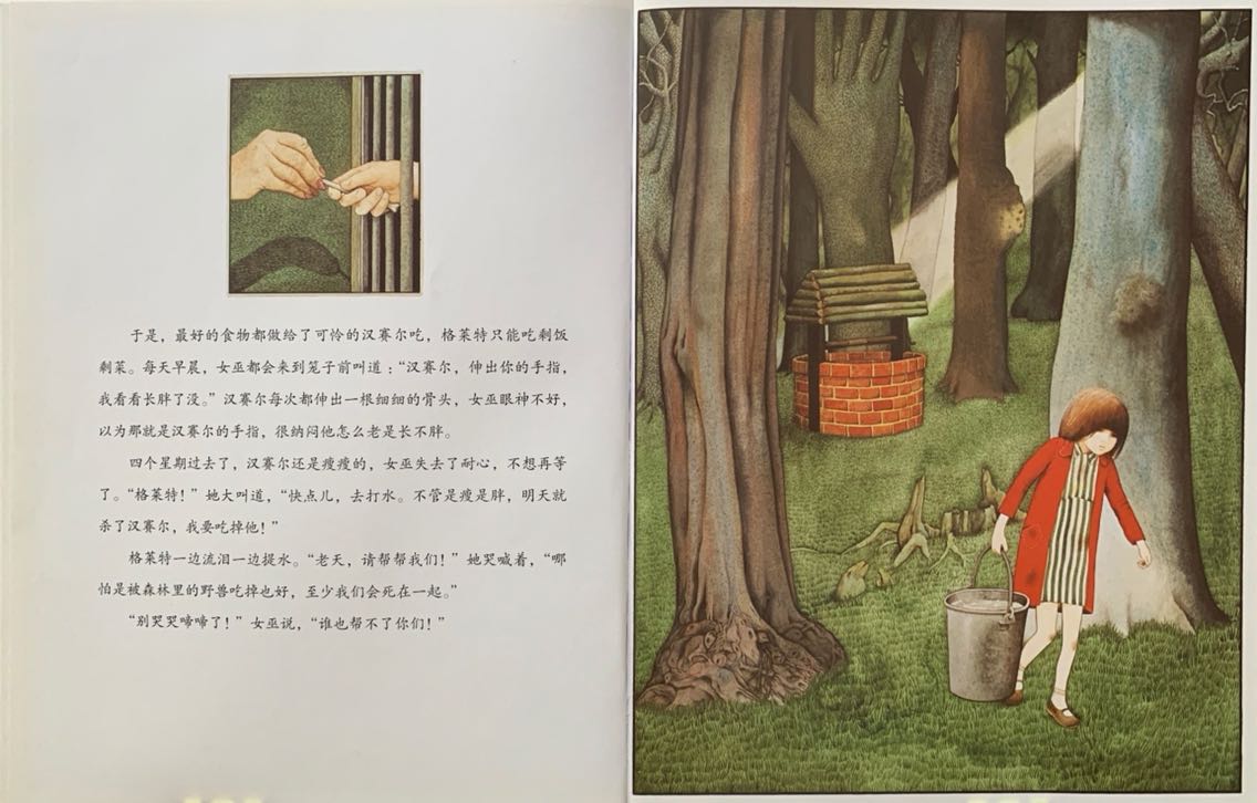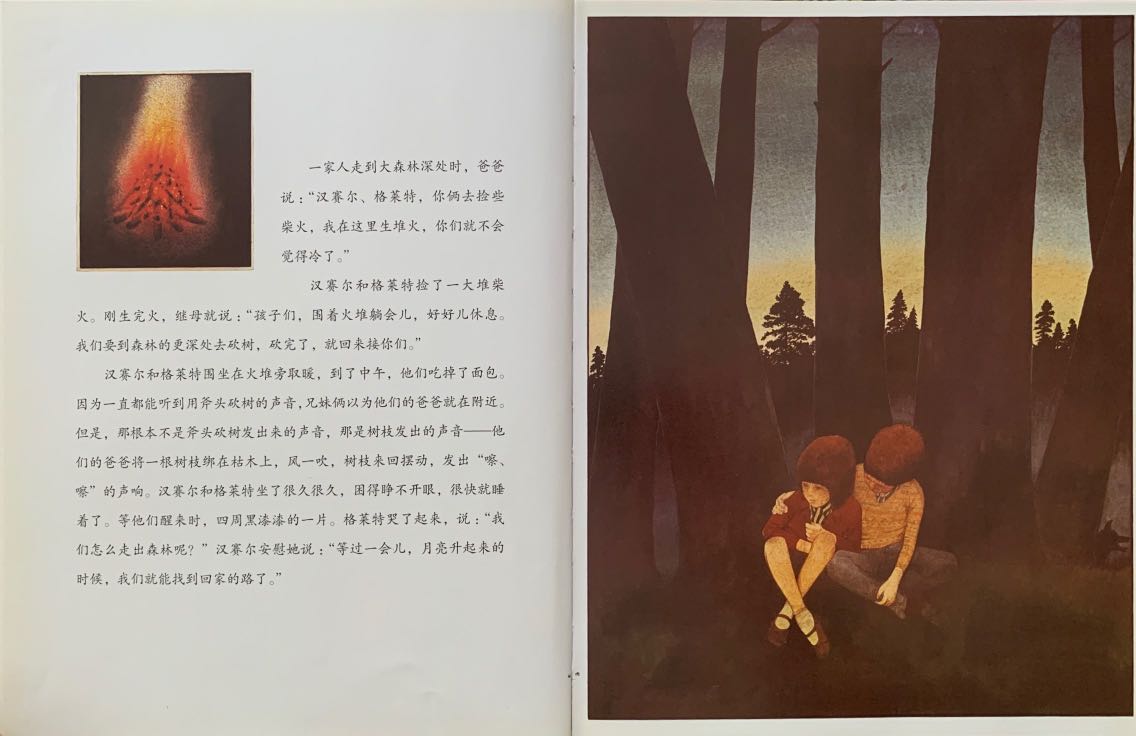 - 安东尼·布朗式绘本语言臻于成熟的标志(阿甲语) - 对我来说,设计一本图画书就好像拍一部电影,书的结构是特写和远景的结合体。而我的工作,则是天分(冒险这么说)和思考的结合体,两者很难分开。(安东尼·布朗语) - 感受“画中画”, 体验解读“秘密”的乐趣 《汉赛尔与格莱特》选自格林童话,安东尼布朗改编创作。在大森林深处住着一户穷苦人家,爸爸是个樵夫,养育了两个孩子,男孩叫汉赛尔,女孩叫格莱特。兄妹俩有个继母。一家人穷得揭不开锅,遇到饥荒,什么吃的都找不到。一天,樵夫愁眉苦脸地躺在床上,发愁日子怎么过下去。他的妻子出了个主意——把两个孩子丢在大森林里。樵夫不同意,却也没有办法。第二天,一家四口向森林深处走去……其实,兄妹俩早已听到了他们夜里的对话,汉赛尔已经想好了对策,并顺利找到了回家的路。不久,饥荒又来了,樵夫没办法,只好又听从了继母的话,将一双儿女带到森林更深处。这次,汉赛尔与格莱特没能如愿回到家,他们迷路了……就在奄奄一息之际,一间美味的面包小房子出现了,还有一位“善良”的老奶奶。兄妹俩还能逃出大森林吗?