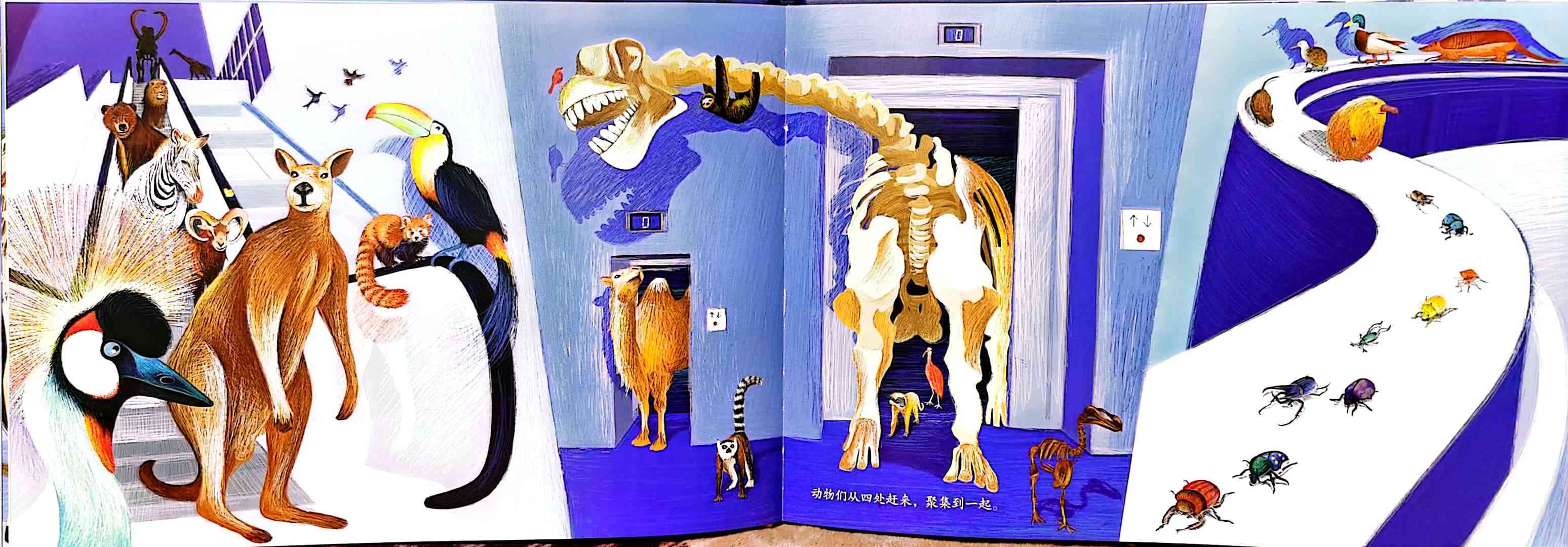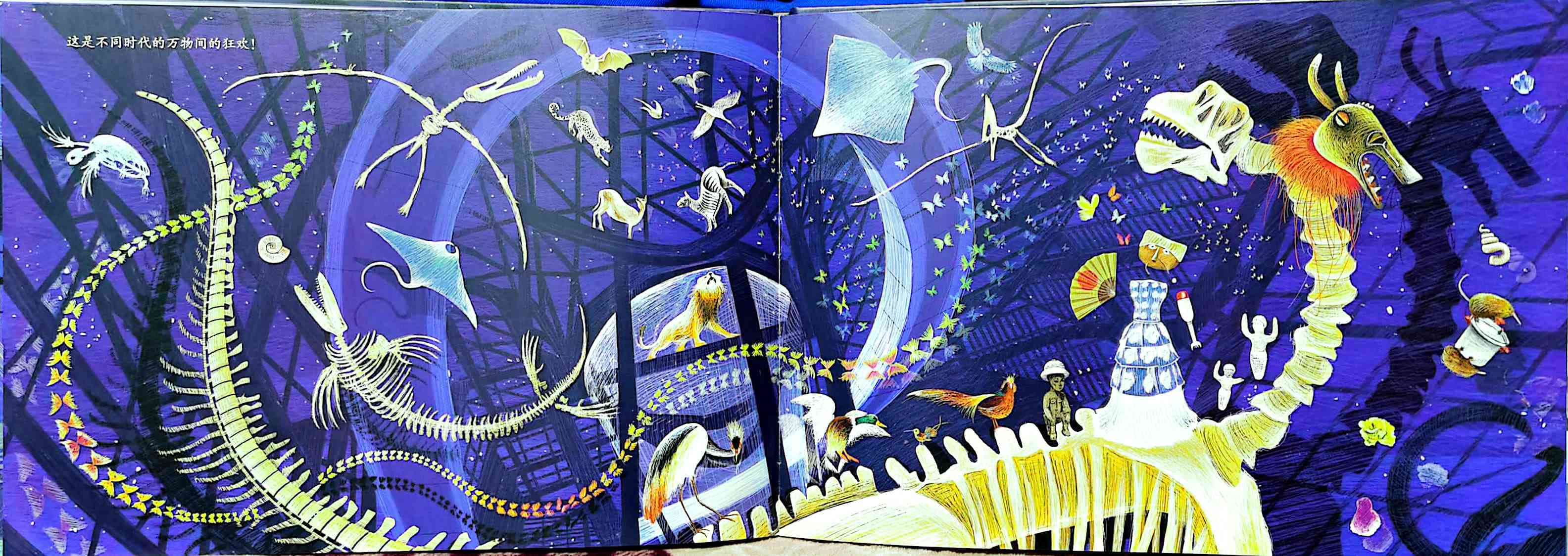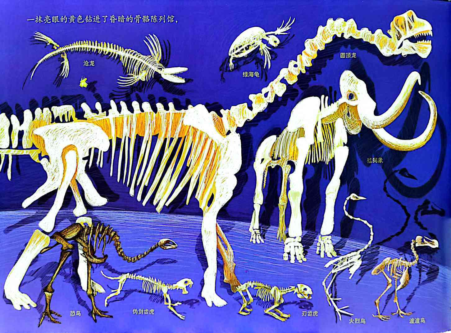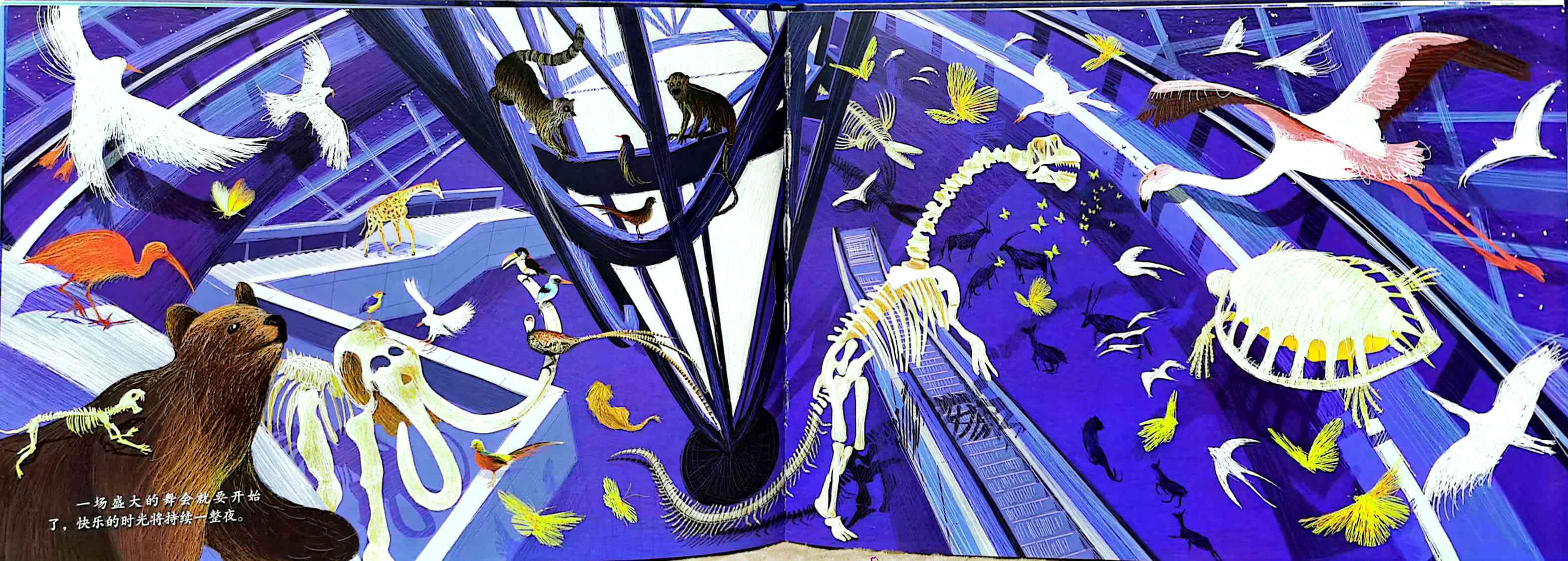《博物馆之夜》内容简介:一座造型奇特的博物馆坐落在罗纳河旁边。夜晚降临了,动植物化石静悄悄的,甲壳类昆虫们和蝴蝶们也静悄悄的。突然一只蝴蝶飞了出来,几只蝴蝶飞了出来,蝴蝶在动物的骨骼上停留。接着,大小哺乳动物和卵生动物们都活了过来。于是,博物馆珍藏的宝贝们开始了一场“大出走”。当第二天清晨来临,人们来到博物馆参观会发现什么呢?
