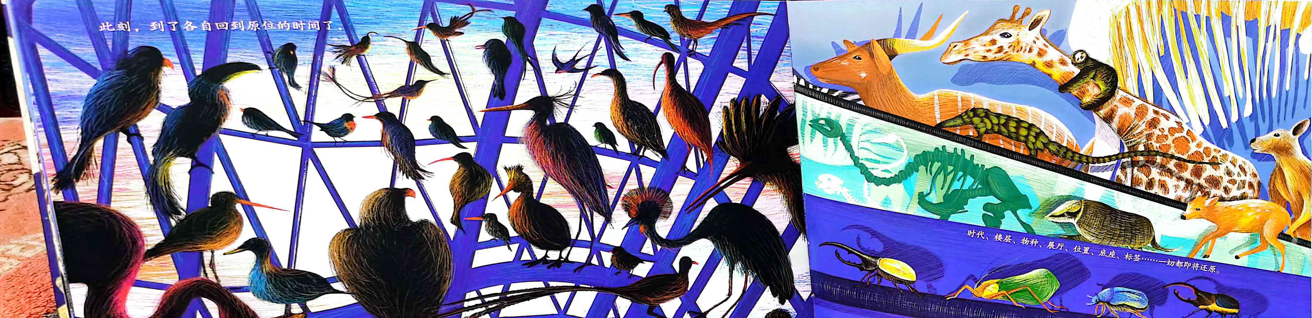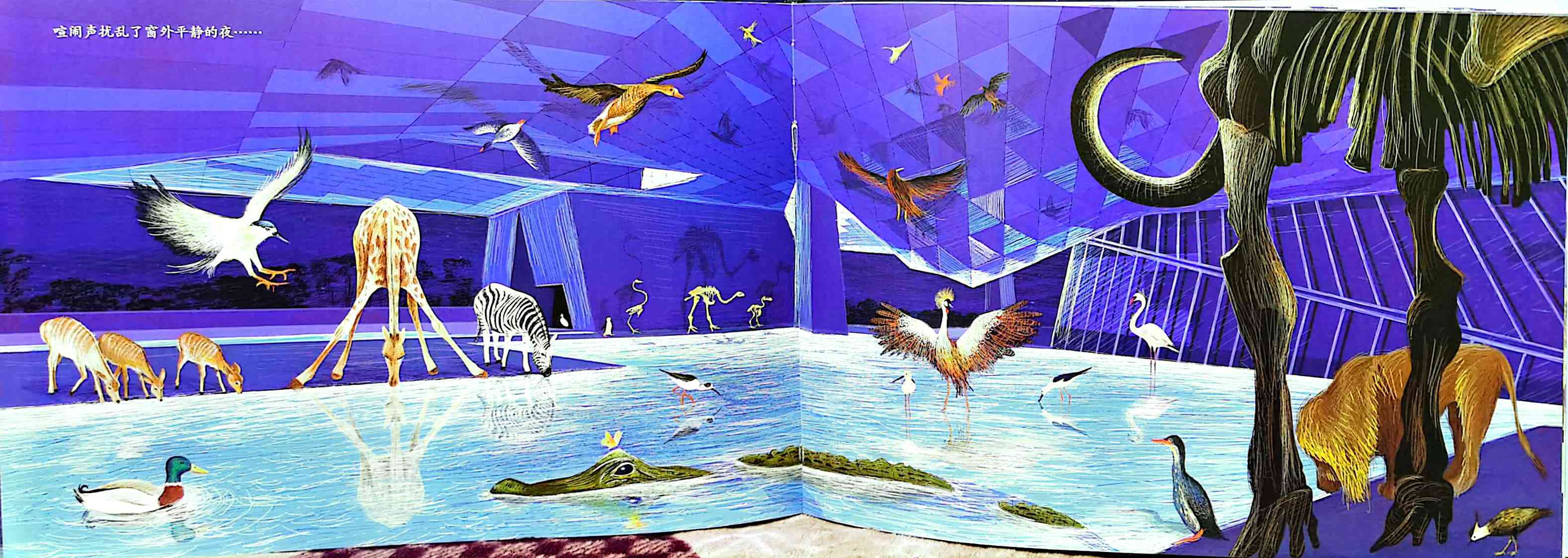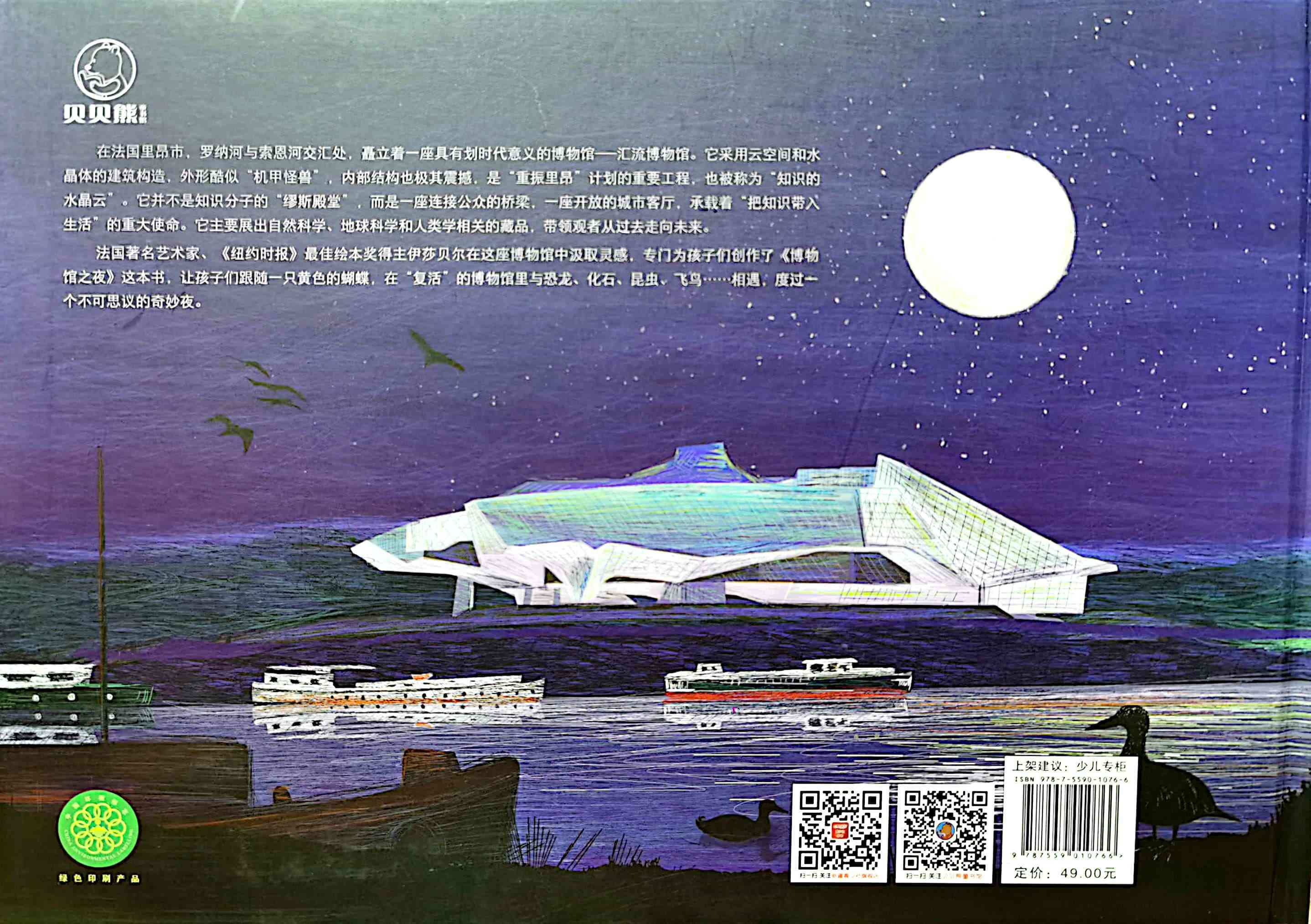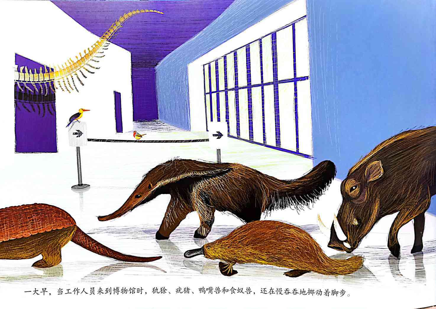《博物馆之夜》内容简介:一座造型奇特的博物馆坐落在罗纳河旁边。夜晚降临了,动植物化石静悄悄的,甲壳类昆虫们和蝴蝶们也静悄悄的。突然一只蝴蝶飞了出来,几只蝴蝶飞了出来,蝴蝶在动物的骨骼上停留。接着,大小哺乳动物和卵生动物们都活了过来。于是,博物馆珍藏的宝贝们开始了一场“大出走”。当第二天清晨来临,人们来到博物馆参观会发现什么呢?