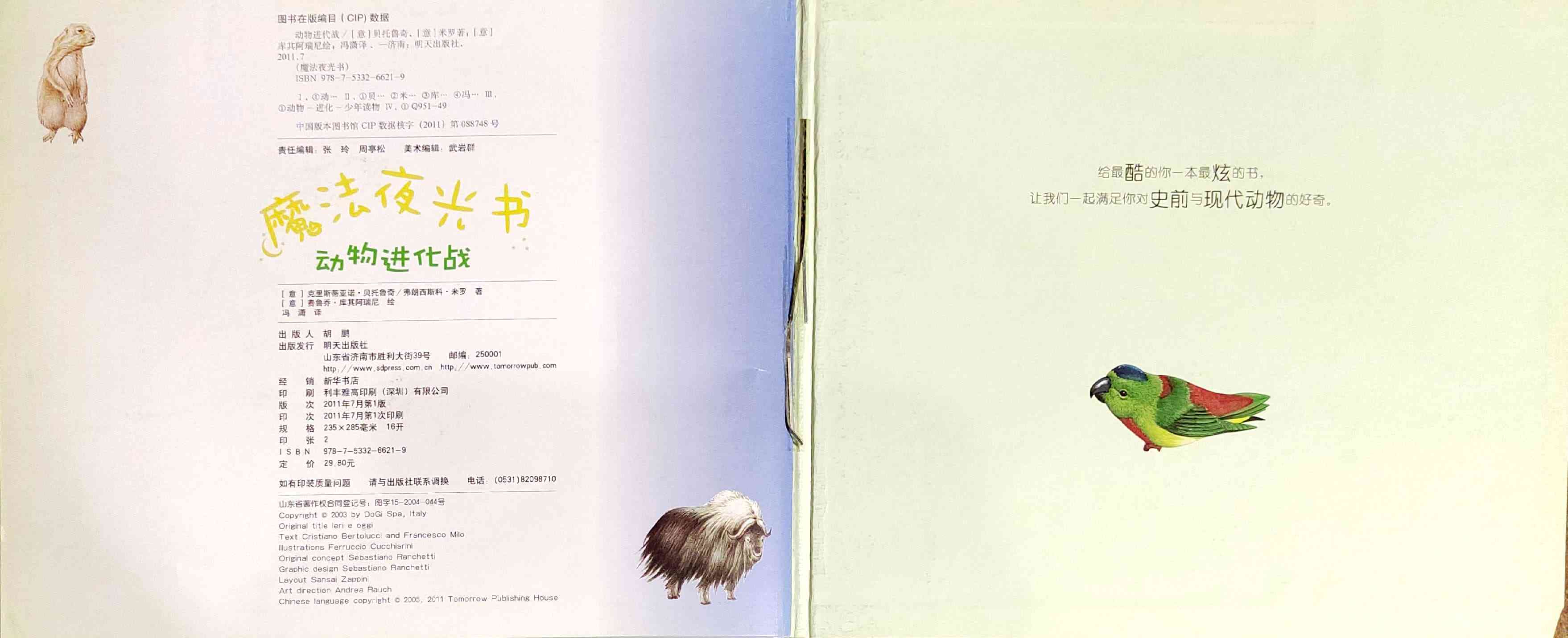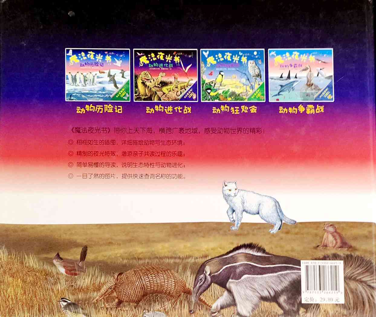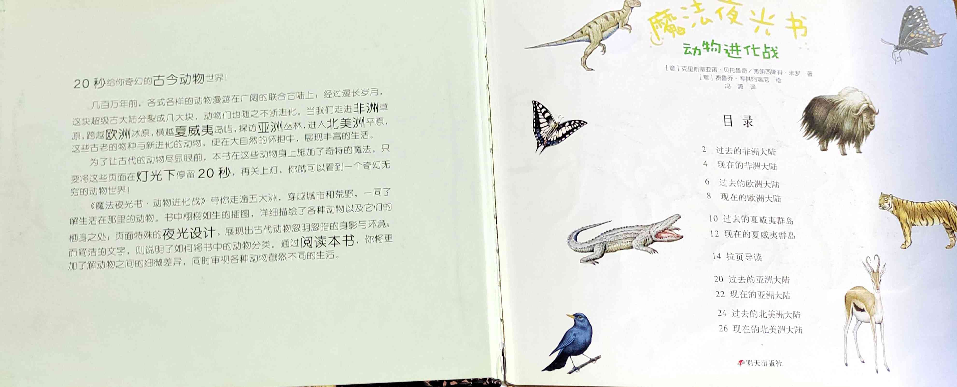 《魔法夜光书:动物进化战》在这些动物身上施加了奇特的魔法,只要将这些页面在灯光下翻开20秒,再关上灯,你就可以看到一个奇幻动物世界!《魔法夜光书──动物进化战》带你走遍五大洲,穿越城市和荒野,一同了解生活在那里的动物。书中栩栩如生的插图,详细描绘了各种动物以及牠们的栖身之处;页面特殊的夜光设计,展现出古代动物忽明忽暗的身影与环境;而简洁的文字则说明了如何将书中的动物分类。 海报: