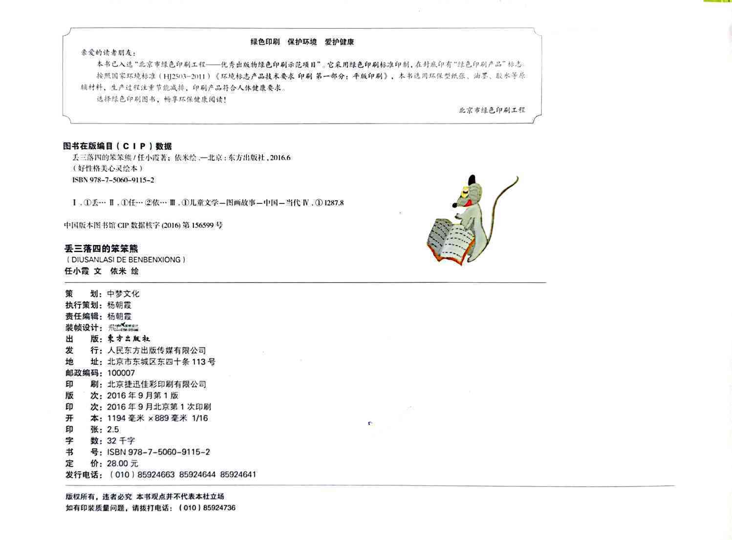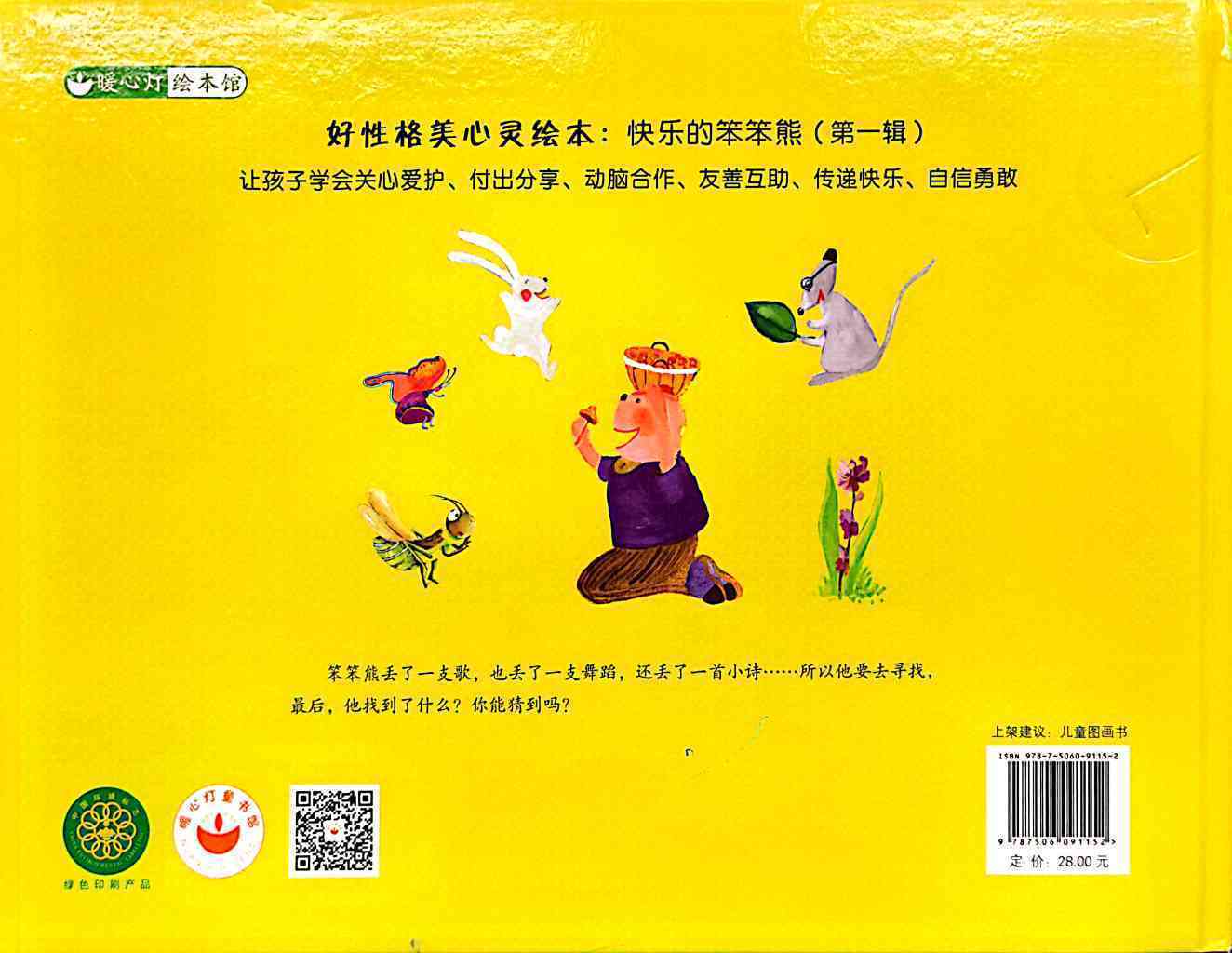 ★原创精品心灵成长、性格培养图画书 由著名儿童文学作家任小霞撰文、新锐实力派插画师依米绘制插画,专为学龄前(3-7岁)儿童量身创作的一套高品质性格和心灵培养绘本。 ★让孩子变得更有爱、更聪明、更快乐、更自信、更勇敢的暖心小故事 任小霞的文字优美生动,充满想象力,蕴含哲理,意味深长,富有启发意义,对孩子美好性格的形成有很大的帮助作用。通过笨笨熊和他的朋友们之间发生的一个个暖心小故事,传递着满满的正能量,在孩子面前呈现出一个真善美的世界,滋养孩子的心灵。 ★画风充满童趣,色调温暖明亮,培养孩子的想象力和审美情趣 依米绘制的插画富有童趣,色彩饱满鲜艳,小动物形象栩栩如生,活泼可爱,符合幼儿的视觉审美。画面在准确表达文字内涵的同时,又丰富扩充了文字的外延,图文互映,极大地激发孩子的想象力,培养孩子审美情趣。 ★笨笨熊给孩子树立了学习的榜样和完美的典范 书中的主要角色笨笨熊一点儿也不傻,他心地善良,乐于助人,乐观自信,快乐勇敢,懂得给予和分享,是孩子学习的榜样,将会使孩子从容面对儿童时期出现的各种困惑和挫折,带领孩子进入一个洒满阳光、温馨美好的世界。 ★入选北京市优秀少儿读物绿色印刷示范项目,环