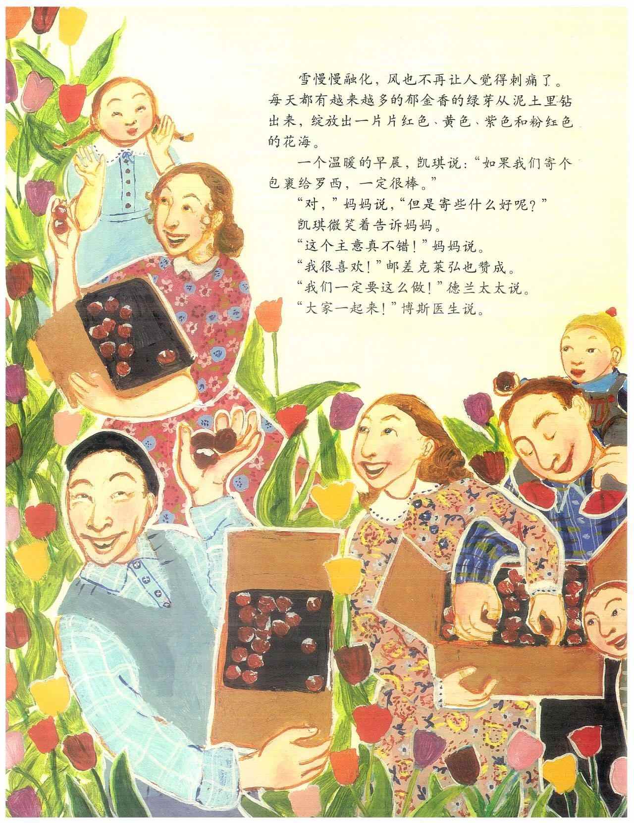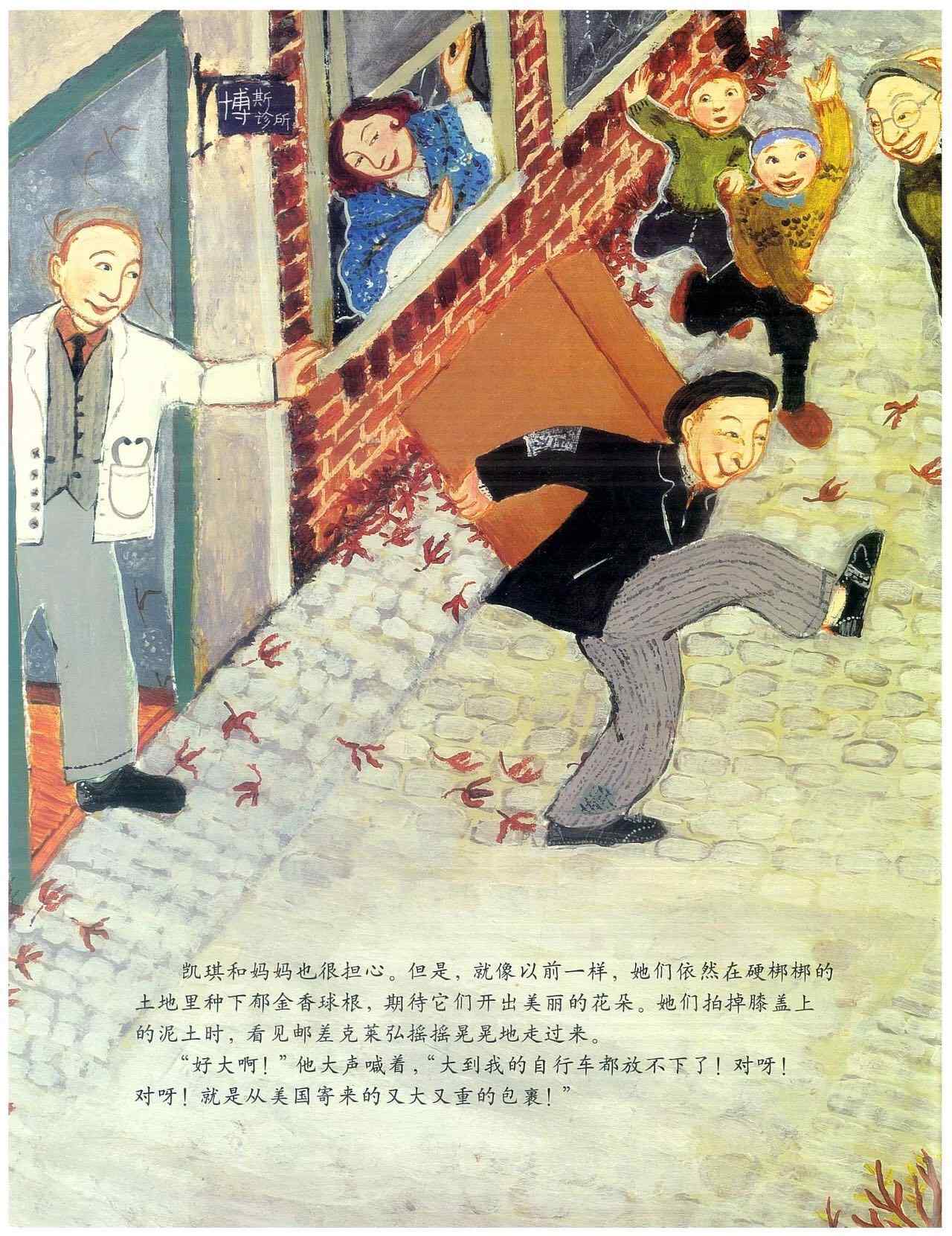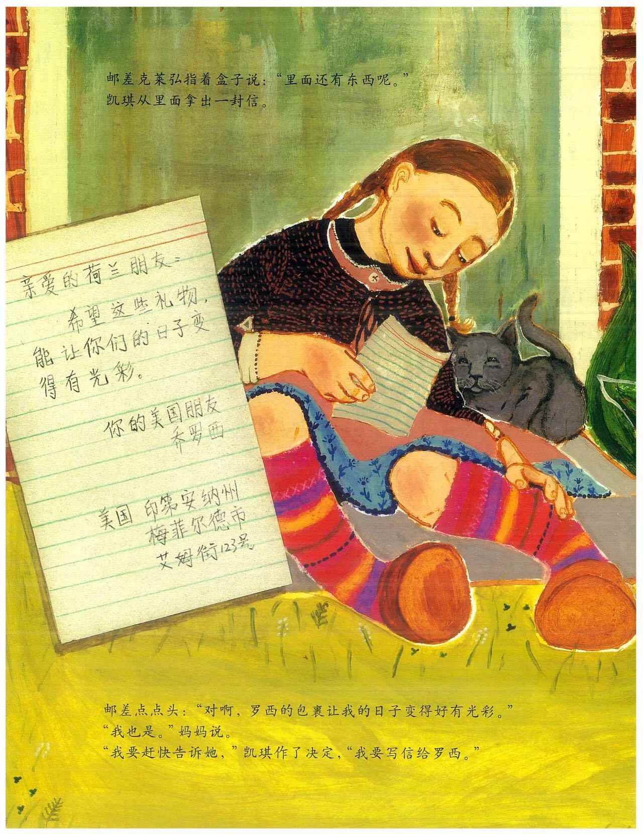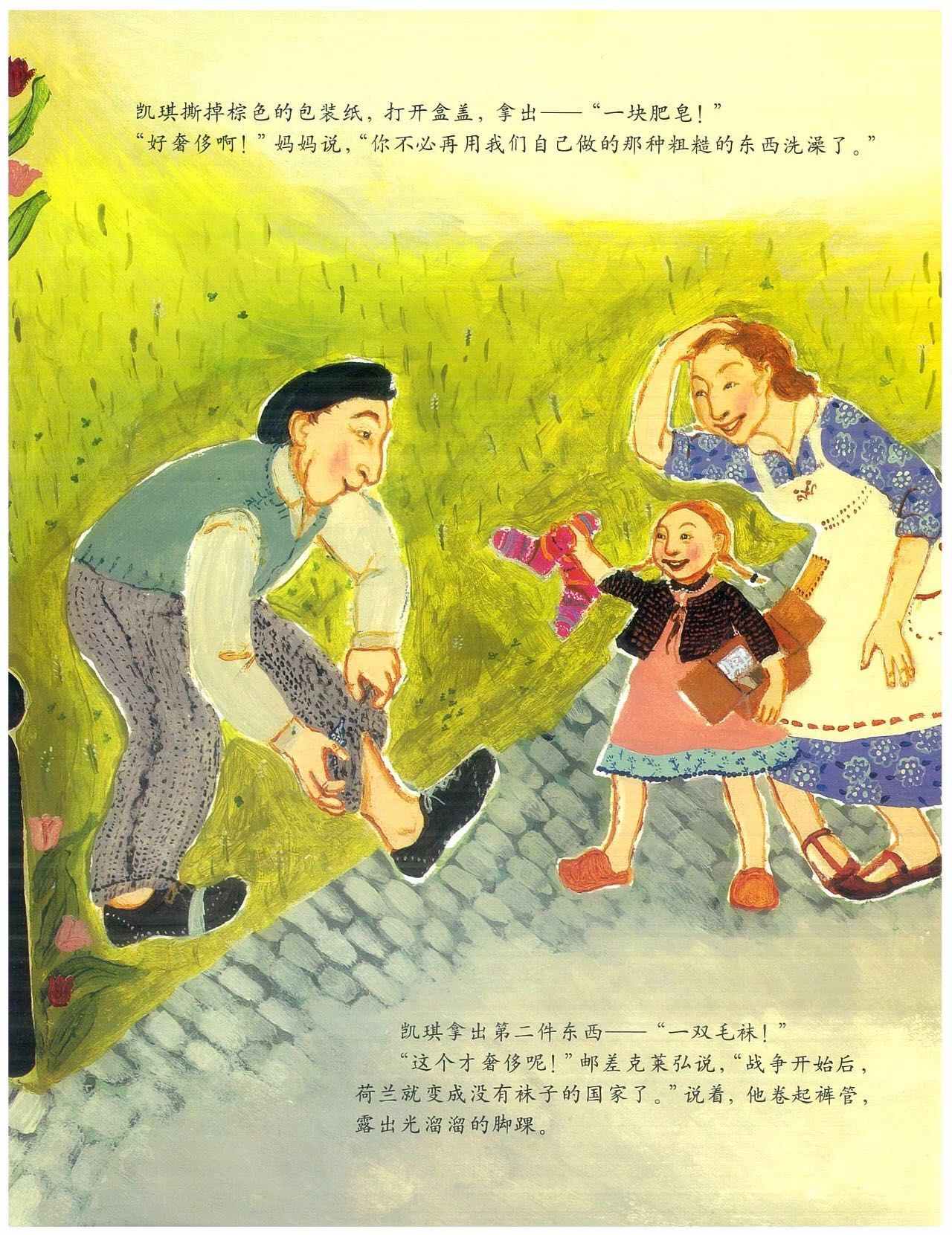 《凯琪的包裹》是根据一个真实事件写成的。1945年5月,我母亲往欧洲寄了一个小包裹,里面装了一支牙膏、一双袜子、一块肥皂和一封短信。我母亲用难以辨认的潦草字迹送上祝福,也写下了自己的地址。我想,那些郁金香应该都还盛开着吧。