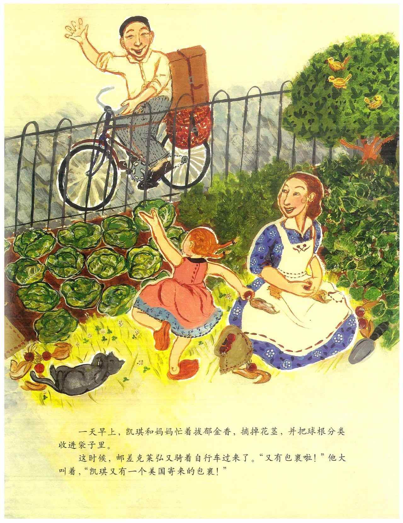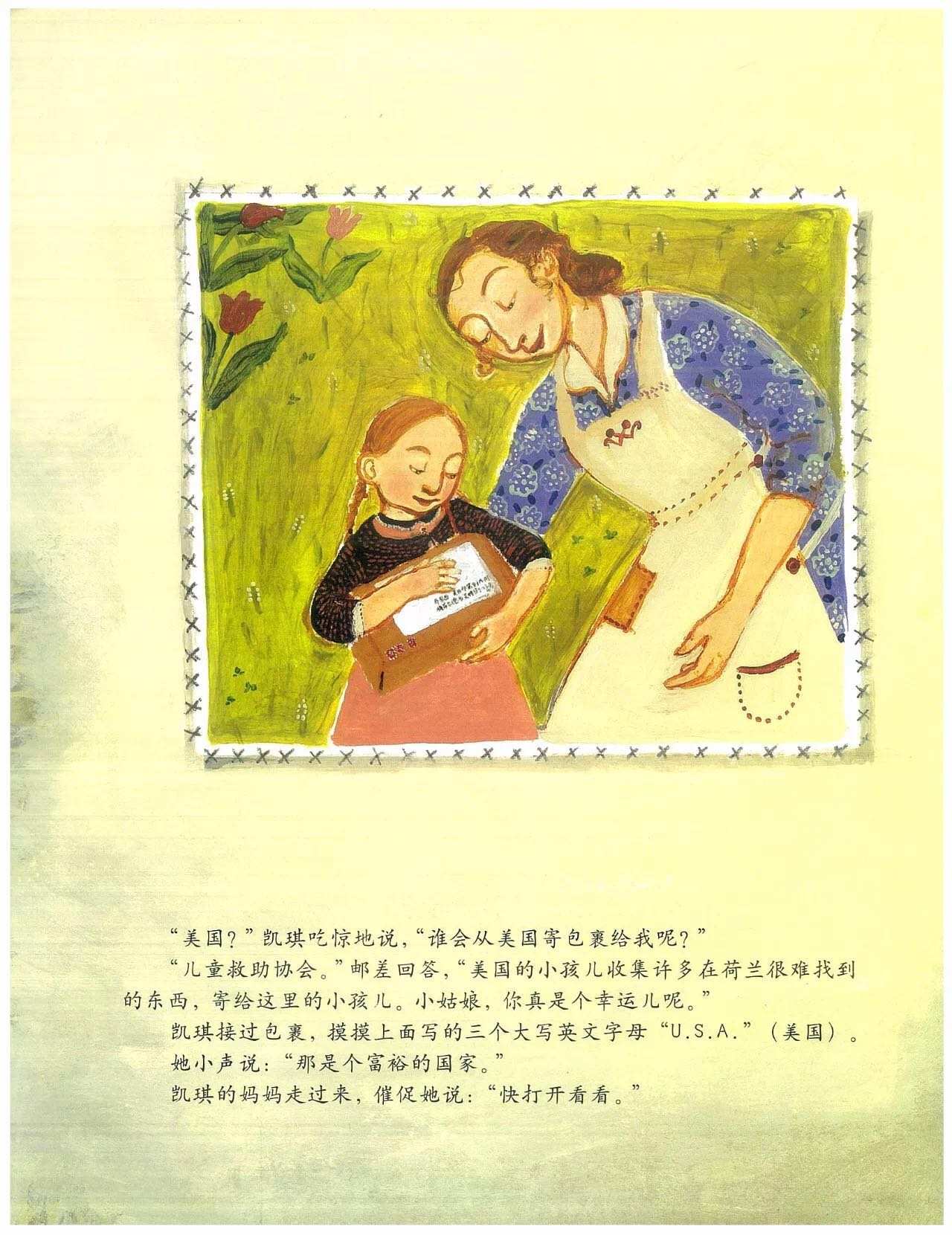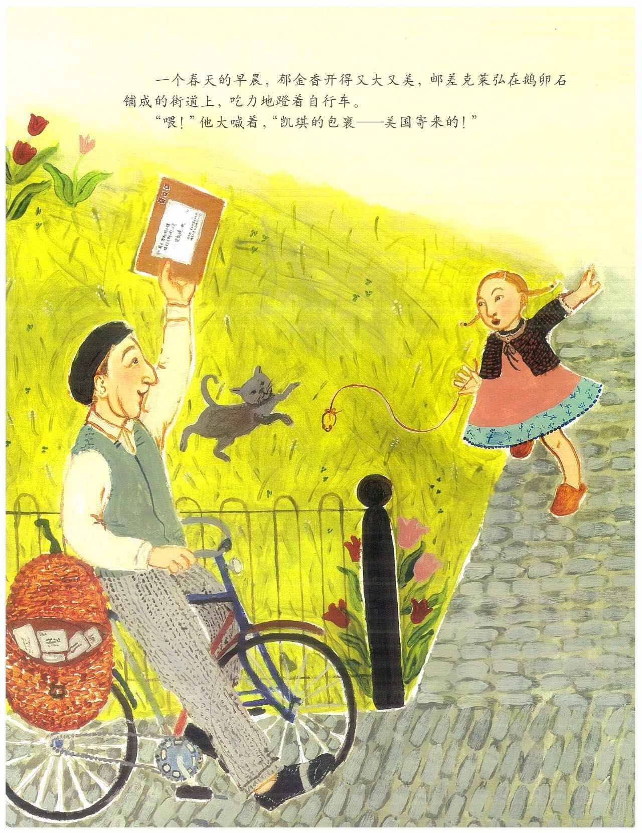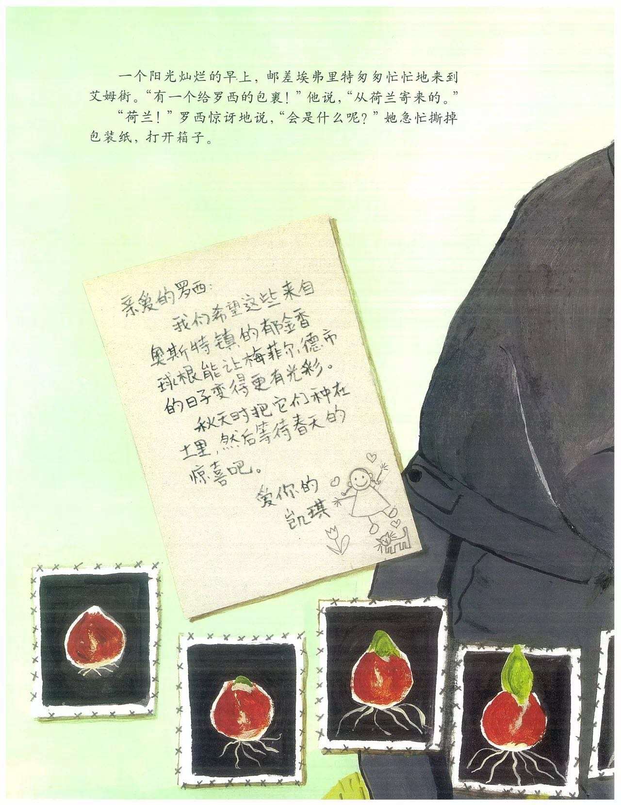 《凯琪的包裹》是根据一个真实事件写成的。1945年5月,我母亲往欧洲寄了一个小包裹,里面装了一支牙膏、一双袜子、一块肥皂和一封短信。我母亲用难以辨认的潦草字迹送上祝福,也写下了自己的地址。我想,那些郁金香应该都还盛开着吧。
