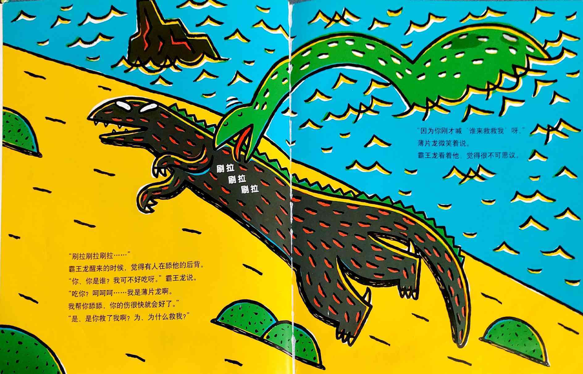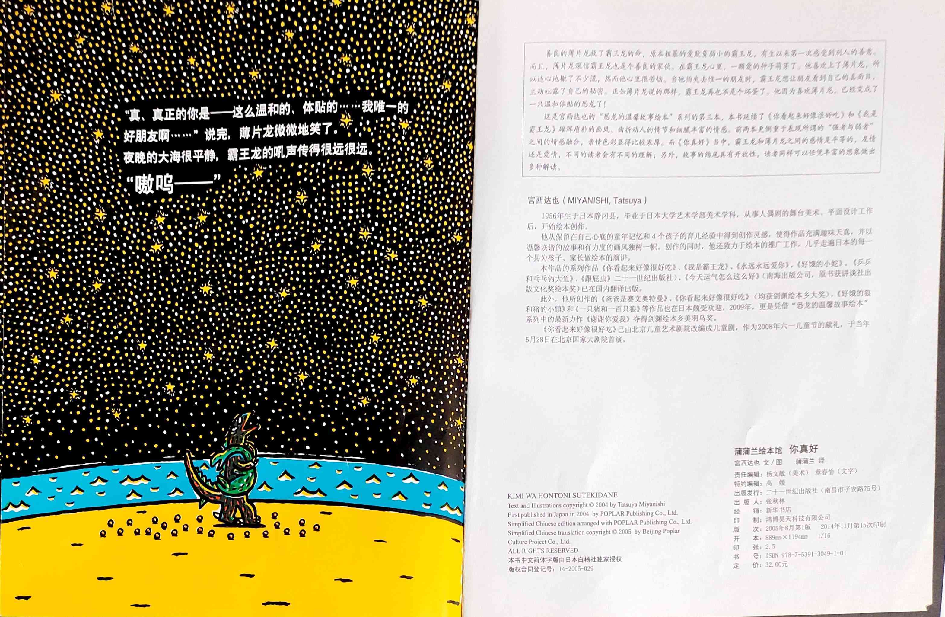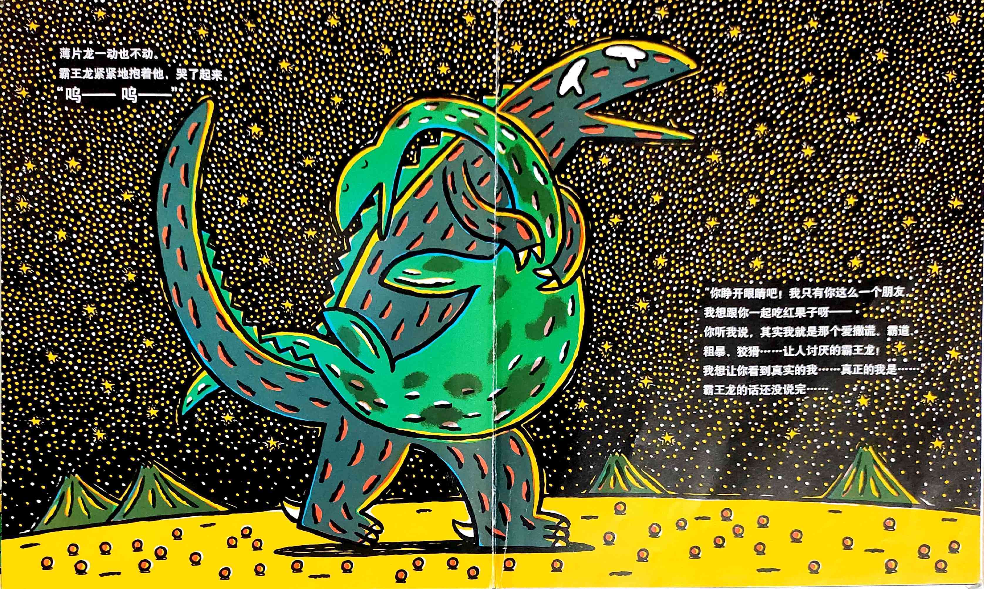 《你真好》内容简介:善良的薄片龙救了霸王龙的命,原本粗暴的爱欺负弱小的霸王龙,有生以来第一次感受到别人的善意。而且,薄片龙深信霸王龙也是个善良的家伙。在霸王龙心里,一颗爱的种子萌芽了。他喜欢上了薄片龙,所以违心地撒了不少谎,然而他心里很苦恼。当他怕失去惟一的朋友时,霸王龙想让朋友看到自己的真面目,主动吐露了自己的秘密。正如薄片龙说的那样,霸王龙再也不是个坏蛋了。他因为喜欢薄片龙,已经变成了一只温和体贴的恐龙了! 这是宫西达也的〈恐龙的温馨故事绘本〉系列的第三本,《你真好》延续了《你看起来好像很好吃》和《我是霸王龙》雄浑质朴的画风、曲折动人的情节和细腻丰富的情感。前两本更侧重于表现所谓的“强者与弱者”之间的情感融合,亲情色彩显得比较浓厚。而《你真好》当中,霸王龙和薄片龙之间的感情是平等的,友情还是爱情,不同的读者会有不同的理解;另外,故事的结尾具有开放性,读者同样可以任凭丰富的想象做出多种解读