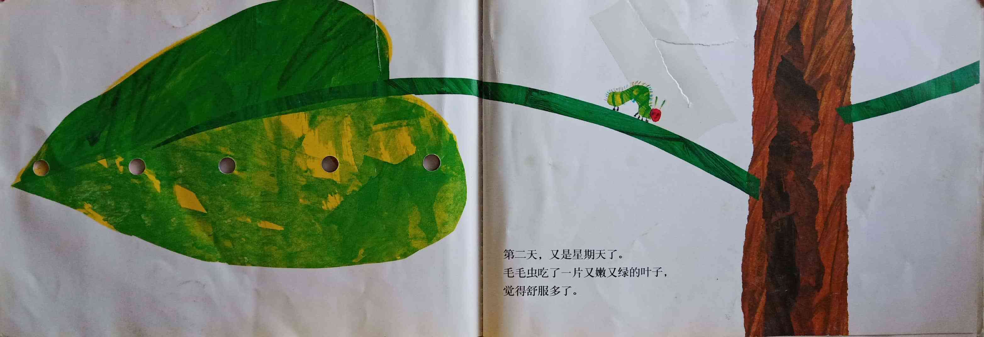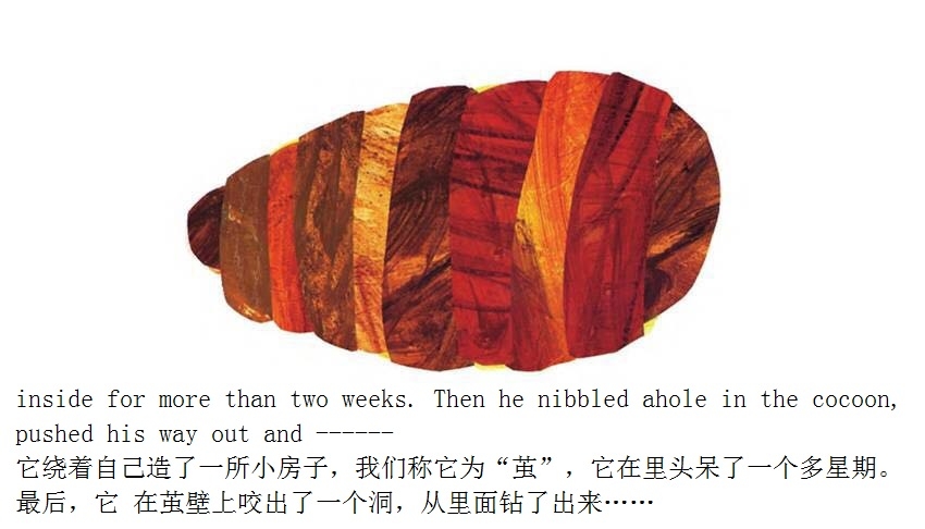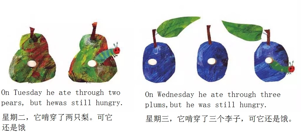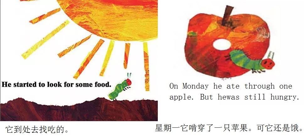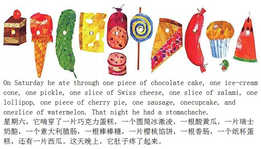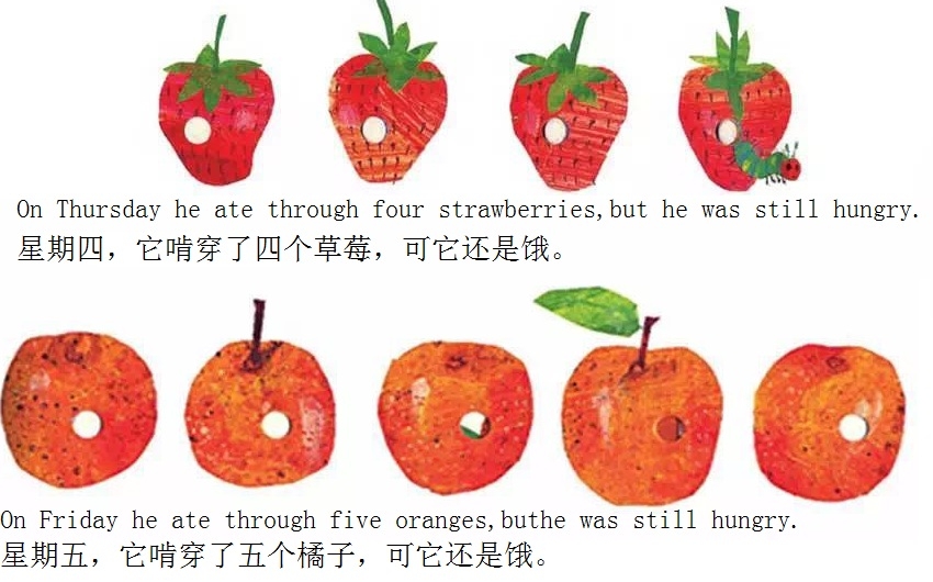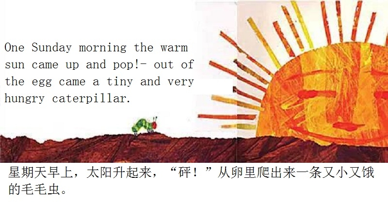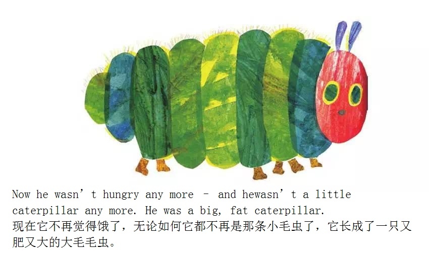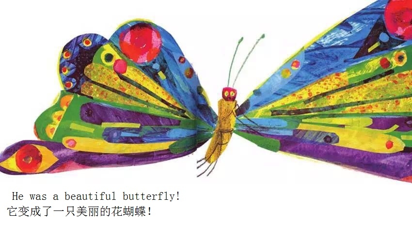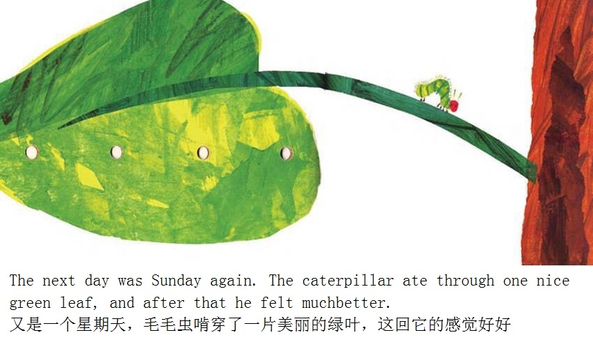 月光下,叶子上躺着一颗小小的蛋。 星期天早上,太阳升起来,“砰!”从蛋里爬出来一条又小又饿的毛毛虫。 他开始去找吃的。星期一吃了一个苹果,可还是好饿。星期二吃了两个梨子,可还是好饿。星期三吃了三个李子,可还是好饿。星期四吃了四个草莓,可还是好饿。星期五吃了五个橘子,可还是好饿。星期六,他吃了一块巧克力蛋糕、一个冰淇淋、一根黄瓜、一块乳酪、一条火腿、一根棒棒糖、一个樱桃派、一根香肠、一个杯子蛋糕和一片西瓜。那天晚上,毛毛虫肚子痛了。 第二天又是星期天。毛毛虫吃了绿叶子,肚子好多了。 现在,他不饿了,不是一条小毛毛虫了,是一条又肥又大的毛毛虫了。他造了一个小房子,叫茧,把自己包在了里面。他在里面呆了两个多星期,咬了一个小洞挤了出来。 毛毛虫变成了一只漂亮的蝴蝶。
