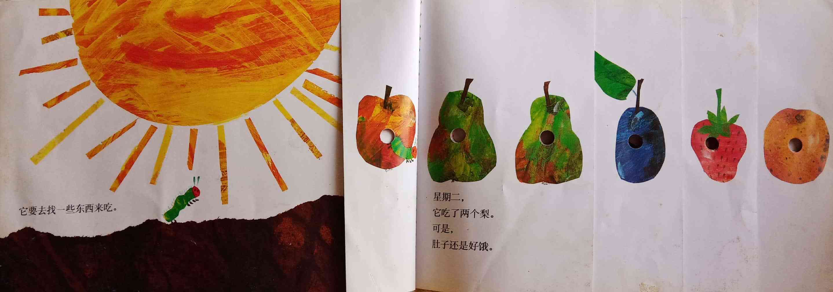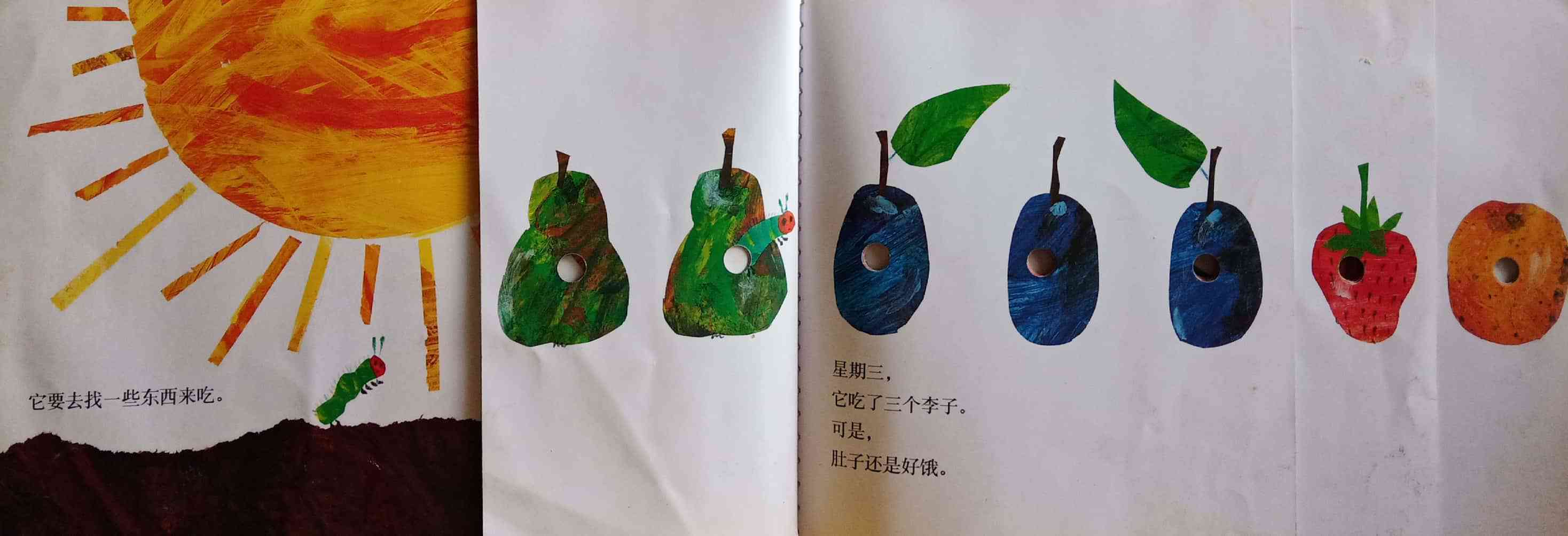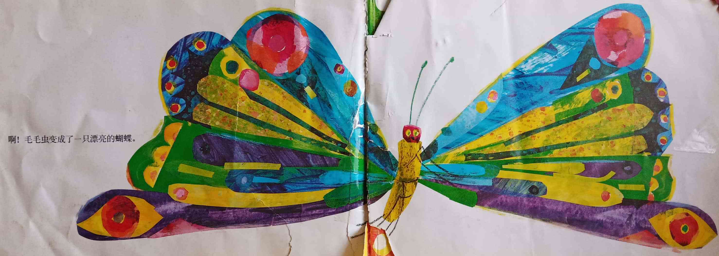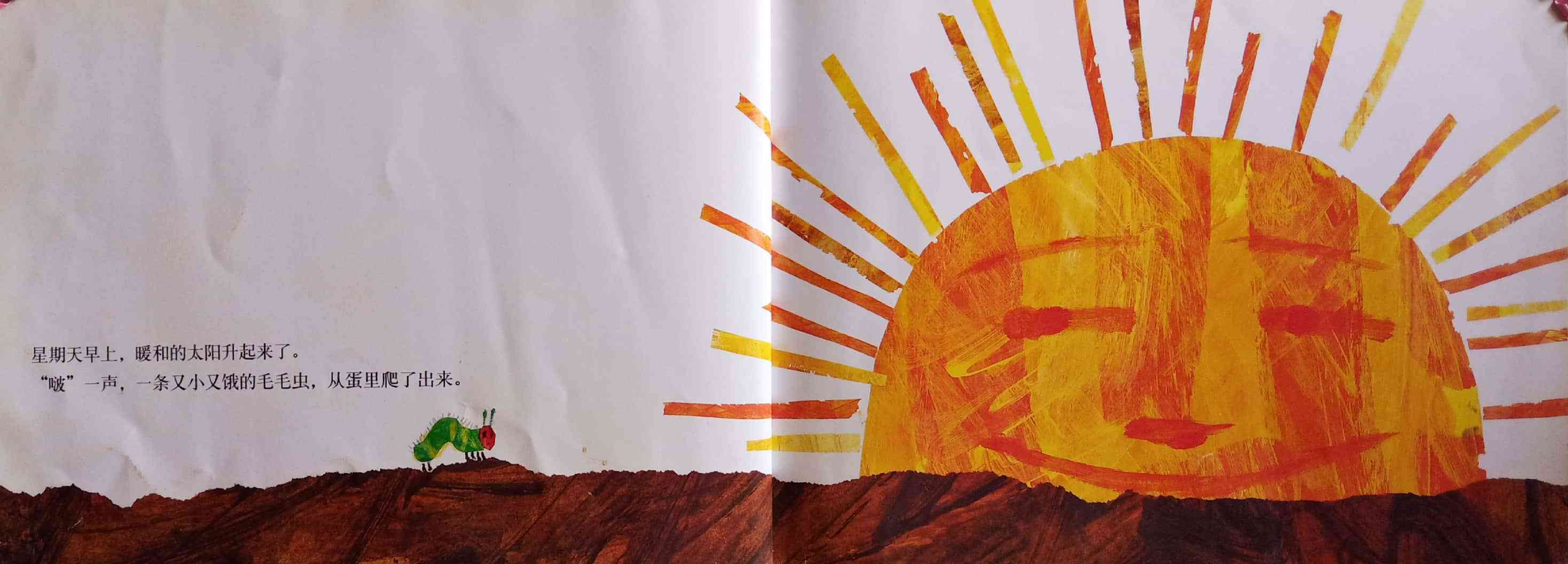 月光下,叶子上躺着一颗小小的蛋。 星期天早上,太阳升起来,“砰!”从蛋里爬出来一条又小又饿的毛毛虫。 他开始去找吃的。星期一吃了一个苹果,可还是好饿。星期二吃了两个梨子,可还是好饿。星期三吃了三个李子,可还是好饿。星期四吃了四个草莓,可还是好饿。星期五吃了五个橘子,可还是好饿。星期六,他吃了一块巧克力蛋糕、一个冰淇淋、一根黄瓜、一块乳酪、一条火腿、一根棒棒糖、一个樱桃派、一根香肠、一个杯子蛋糕和一片西瓜。那天晚上,毛毛虫肚子痛了。 第二天又是星期天。毛毛虫吃了绿叶子,肚子好多了。 现在,他不饿了,不是一条小毛毛虫了,是一条又肥又大的毛毛虫了。他造了一个小房子,叫茧,把自己包在了里面。他在里面呆了两个多星期,咬了一个小洞挤了出来。 毛毛虫变成了一只漂亮的蝴蝶。
