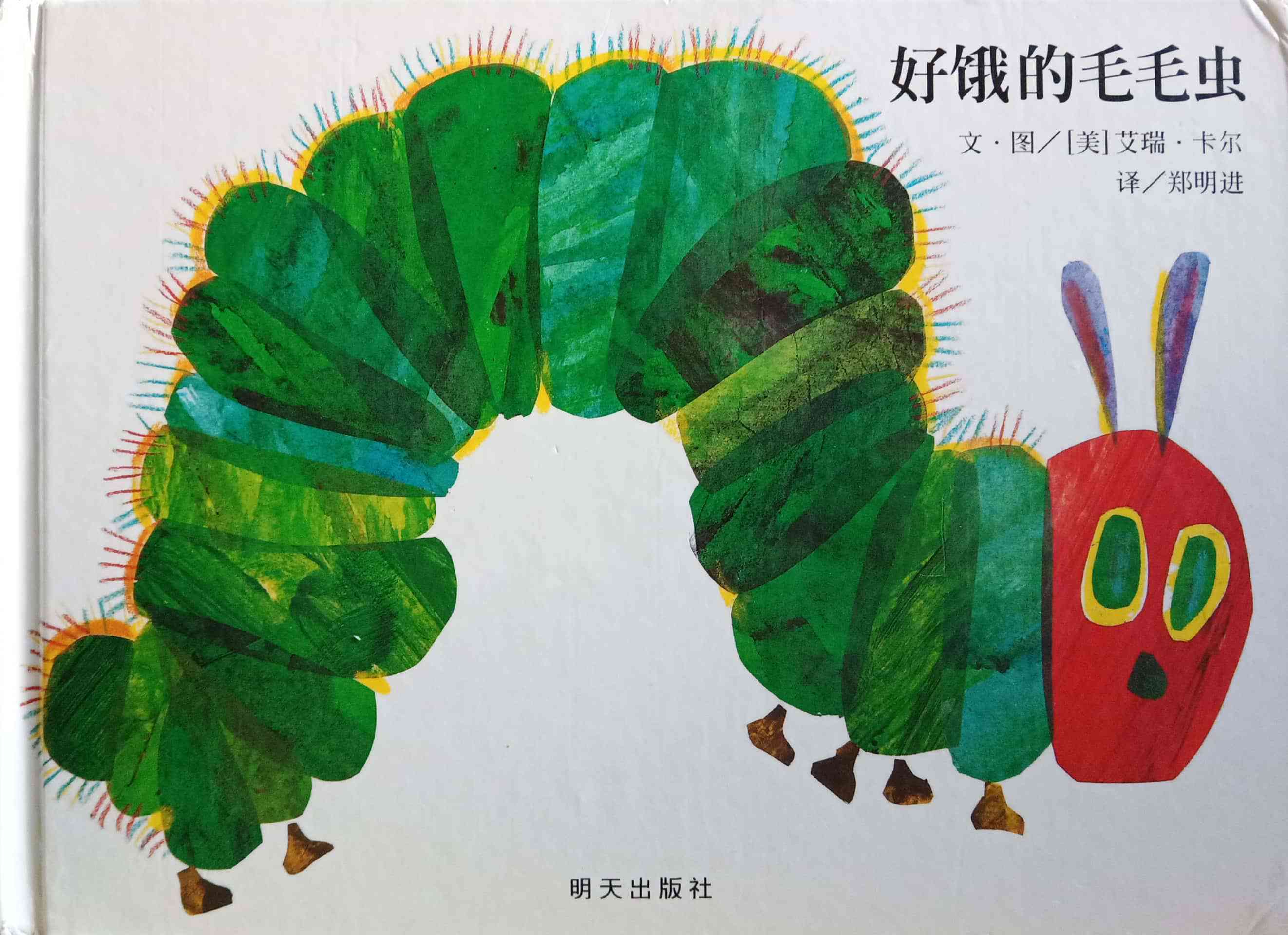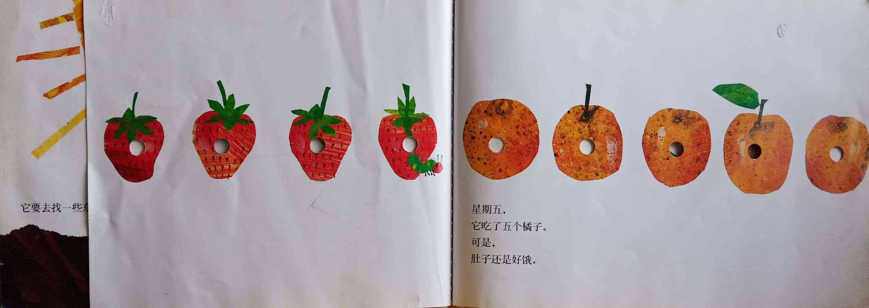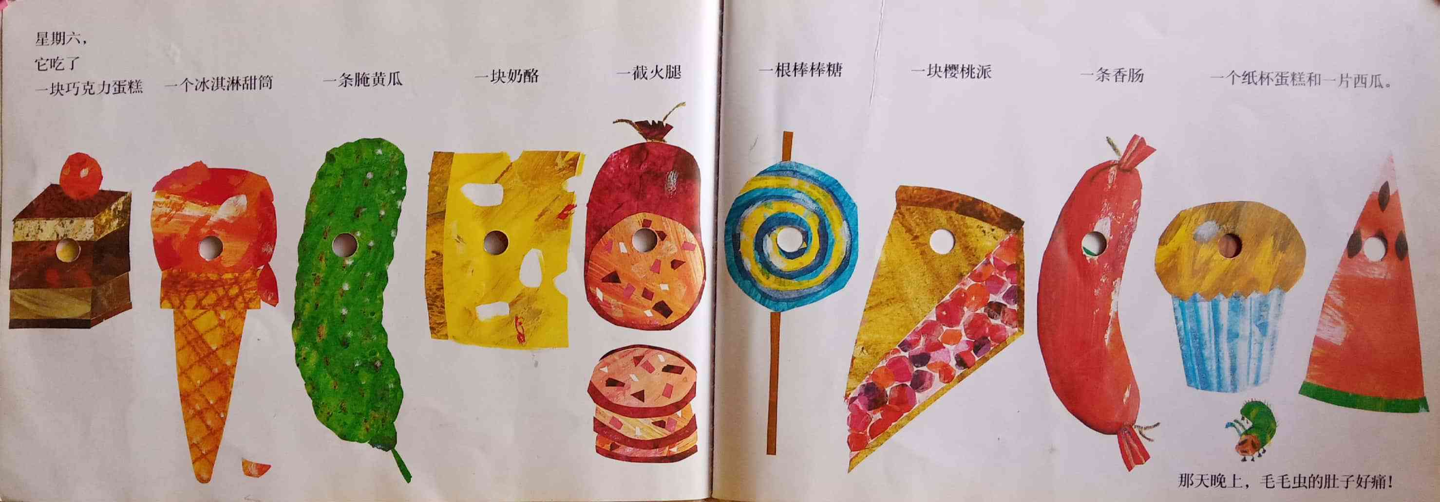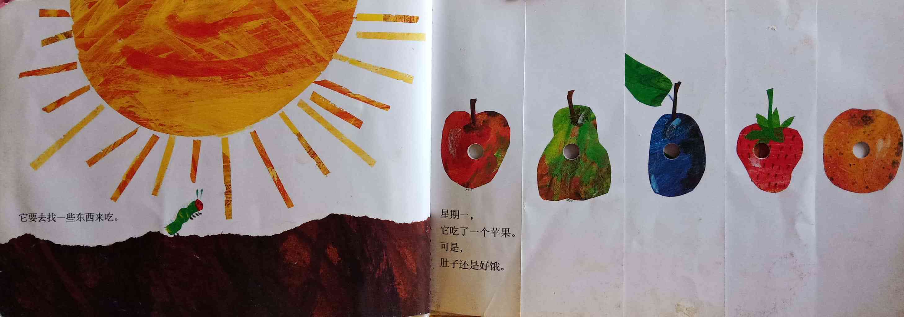 月光下,叶子上躺着一颗小小的蛋。 星期天早上,太阳升起来,“砰!”从蛋里爬出来一条又小又饿的毛毛虫。 他开始去找吃的。星期一吃了一个苹果,可还是好饿。星期二吃了两个梨子,可还是好饿。星期三吃了三个李子,可还是好饿。星期四吃了四个草莓,可还是好饿。星期五吃了五个橘子,可还是好饿。星期六,他吃了一块巧克力蛋糕、一个冰淇淋、一根黄瓜、一块乳酪、一条火腿、一根棒棒糖、一个樱桃派、一根香肠、一个杯子蛋糕和一片西瓜。那天晚上,毛毛虫肚子痛了。 第二天又是星期天。毛毛虫吃了绿叶子,肚子好多了。 现在,他不饿了,不是一条小毛毛虫了,是一条又肥又大的毛毛虫了。他造了一个小房子,叫茧,把自己包在了里面。他在里面呆了两个多星期,咬了一个小洞挤了出来。 毛毛虫变成了一只漂亮的蝴蝶。