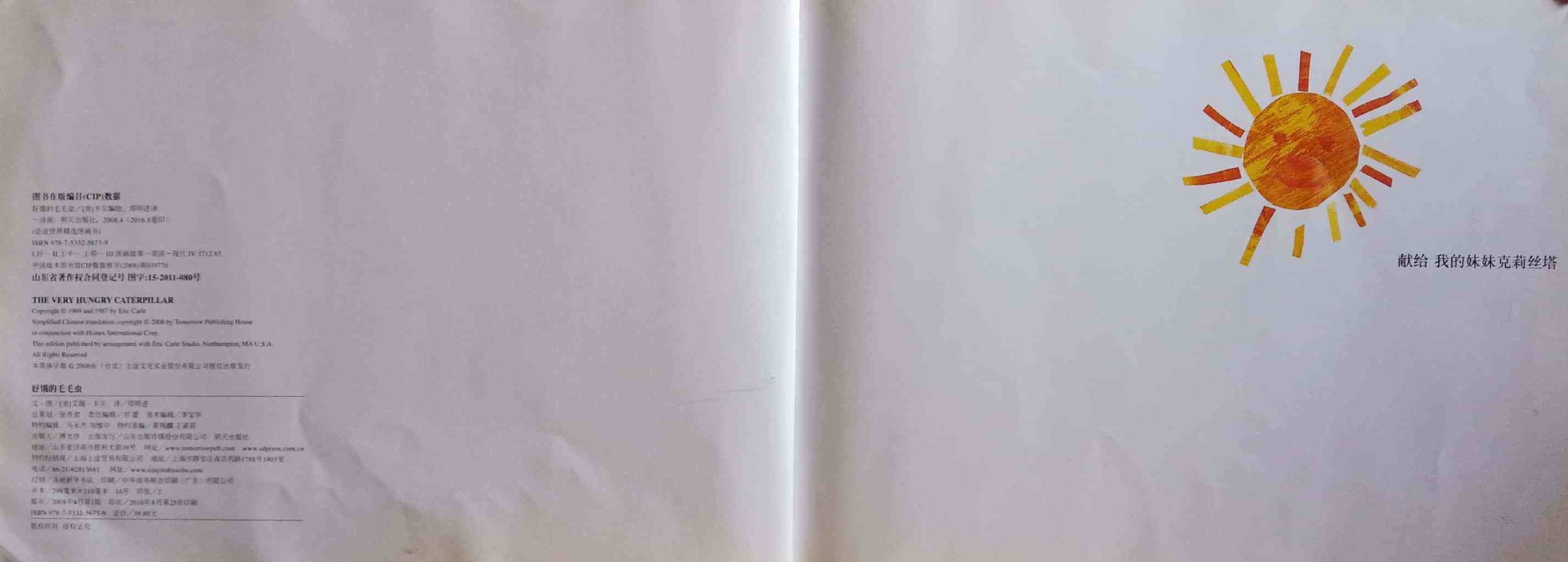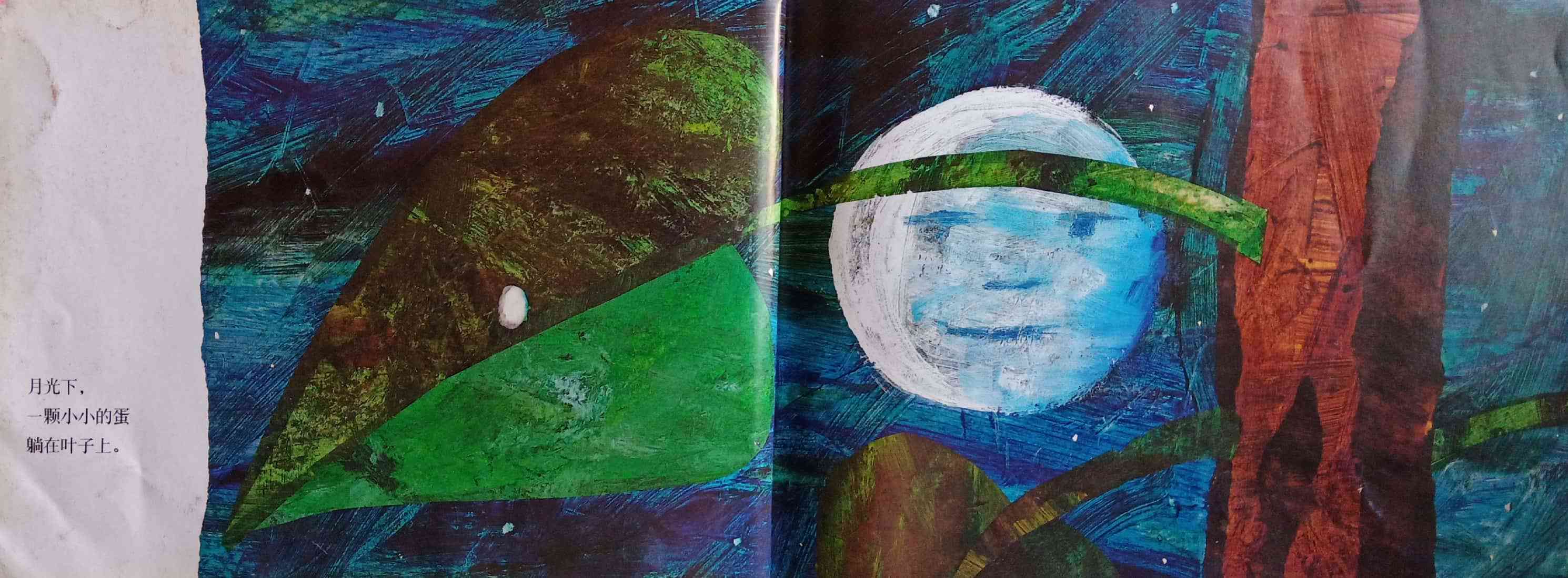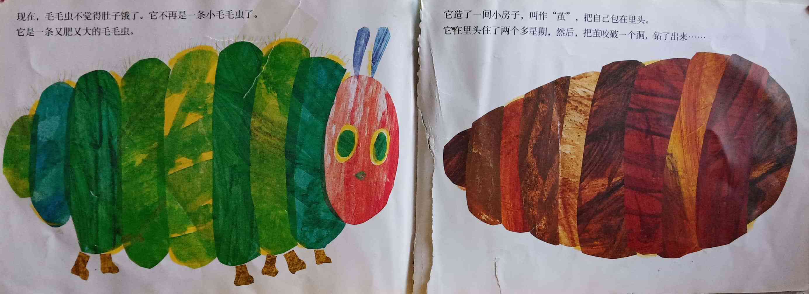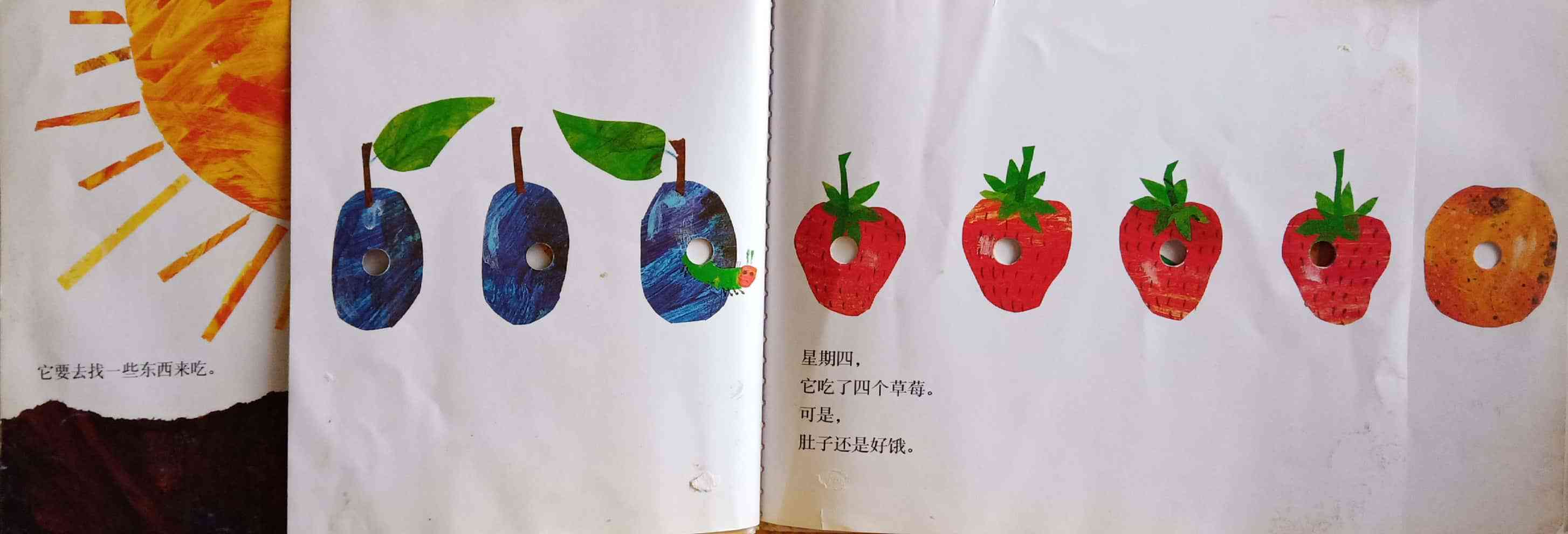 月光下,叶子上躺着一颗小小的蛋。 星期天早上,太阳升起来,“砰!”从蛋里爬出来一条又小又饿的毛毛虫。 他开始去找吃的。星期一吃了一个苹果,可还是好饿。星期二吃了两个梨子,可还是好饿。星期三吃了三个李子,可还是好饿。星期四吃了四个草莓,可还是好饿。星期五吃了五个橘子,可还是好饿。星期六,他吃了一块巧克力蛋糕、一个冰淇淋、一根黄瓜、一块乳酪、一条火腿、一根棒棒糖、一个樱桃派、一根香肠、一个杯子蛋糕和一片西瓜。那天晚上,毛毛虫肚子痛了。 第二天又是星期天。毛毛虫吃了绿叶子,肚子好多了。 现在,他不饿了,不是一条小毛毛虫了,是一条又肥又大的毛毛虫了。他造了一个小房子,叫茧,把自己包在了里面。他在里面呆了两个多星期,咬了一个小洞挤了出来。 毛毛虫变成了一只漂亮的蝴蝶。
