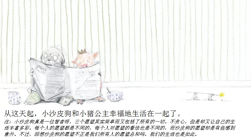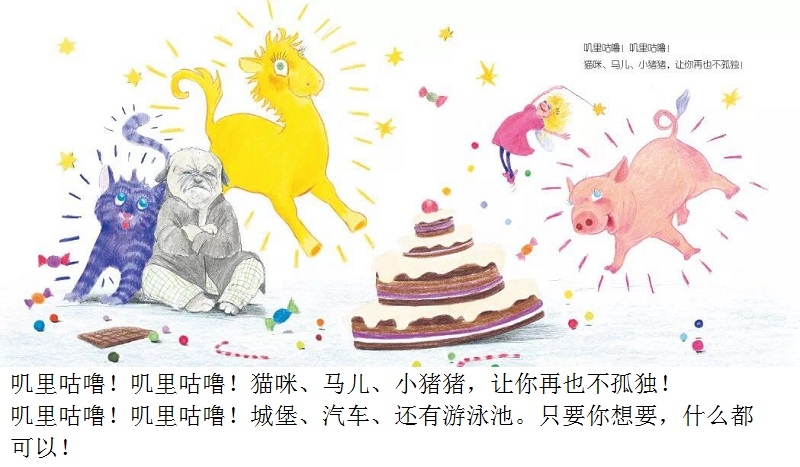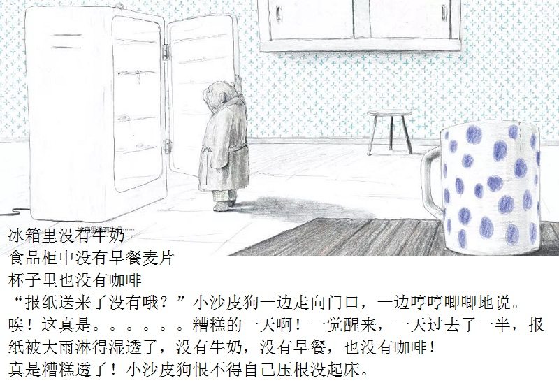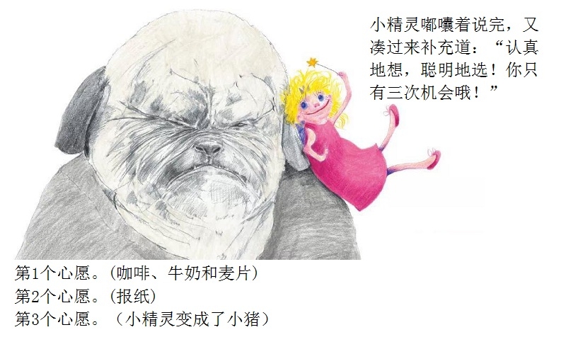 对小沙皮狗来说,这真是糟糕的一天啊:他睡过头了,早餐麦片也吃光了,家里居然还没有咖啡。更可气的是,又赶上了下雨的天气,连门口的报纸都被淋透了。碰上这样的一天,还能指望什么呢?幸好,一个小精灵出现了,她可以为小沙皮狗实现三个心愿哦:“叽里咕噜!叽里咕噜!满盆果酱和奶油蛋糕,各种巧克力应有尽有……” 抱歉的是,小沙皮狗的心愿实在让人难以预料……
