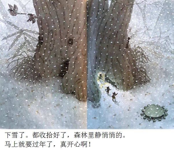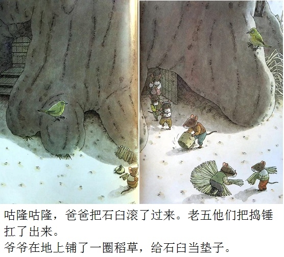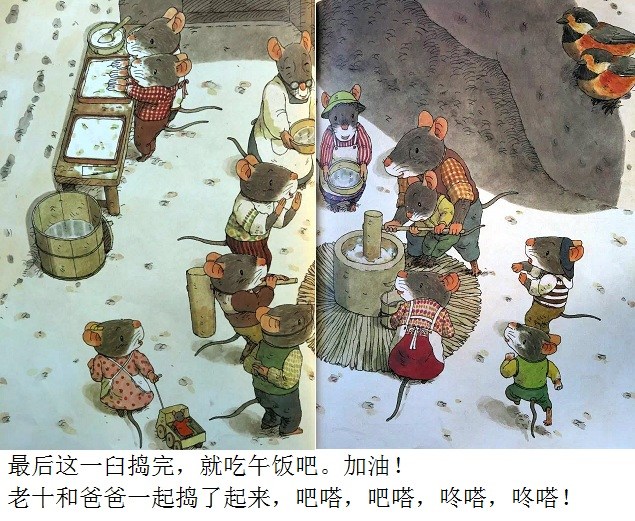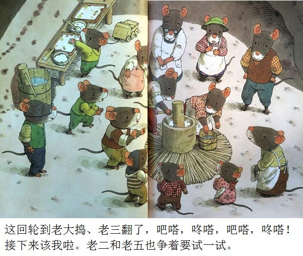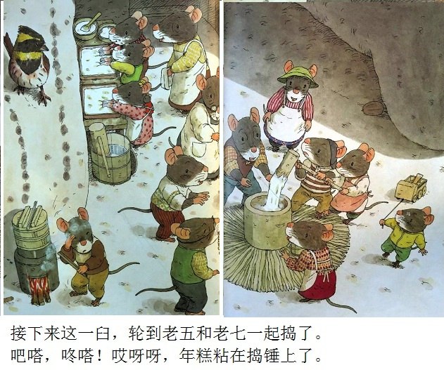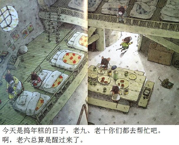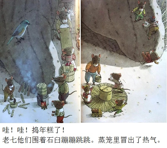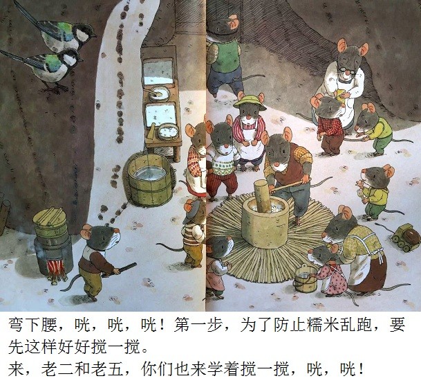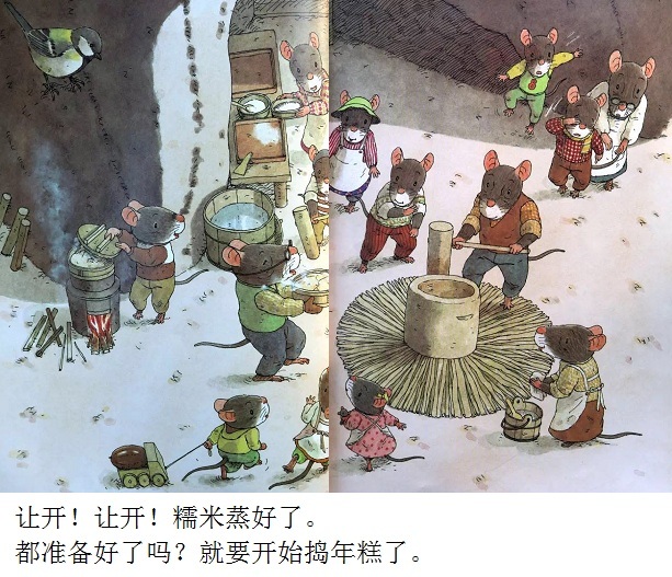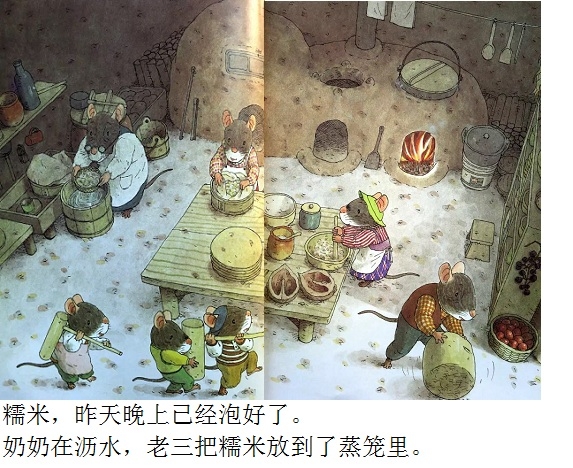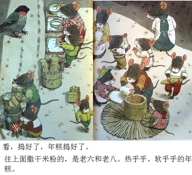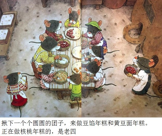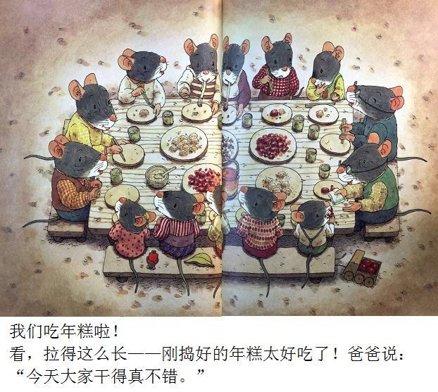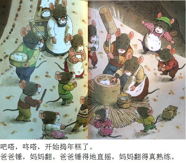 《14只老鼠捣年糕》内容简介:新年快到了,十四只老鼠一早起床,大家分工合作,忙着捣年糕。现代人过年已经很少自己动手做年糕,书中十四只老鼠用传统木臼,木杵捣年糕,对孩子来说是鲜少难得的经验。这也是坐着创作《14只老鼠捣年糕》的用心,他细腻传神的描绘出完整的捣年过程,孩子投过观察书中小老鼠们的神情和动作,有如跟着他们一起经历一次捣年糕的洗礼,希望借此在孩子心中留下传统的印记。 看完《14只老鼠捣年糕》,如果孩子表现出对捣年糕的浓厚兴趣,希望爸妈不要怕麻烦,只要准备两杯糯米,一根擀面棍,就可以给孩子一次难忘的经验。
