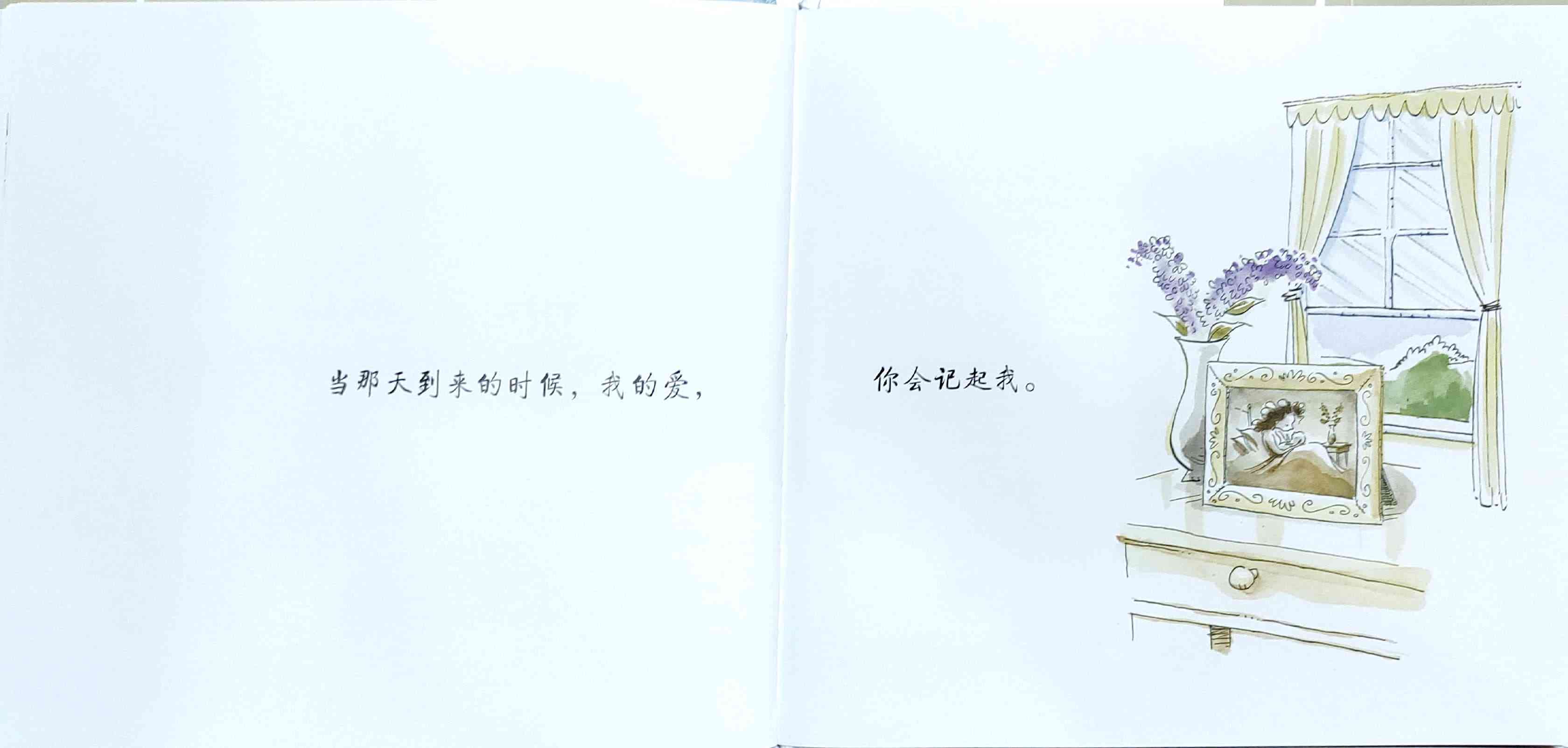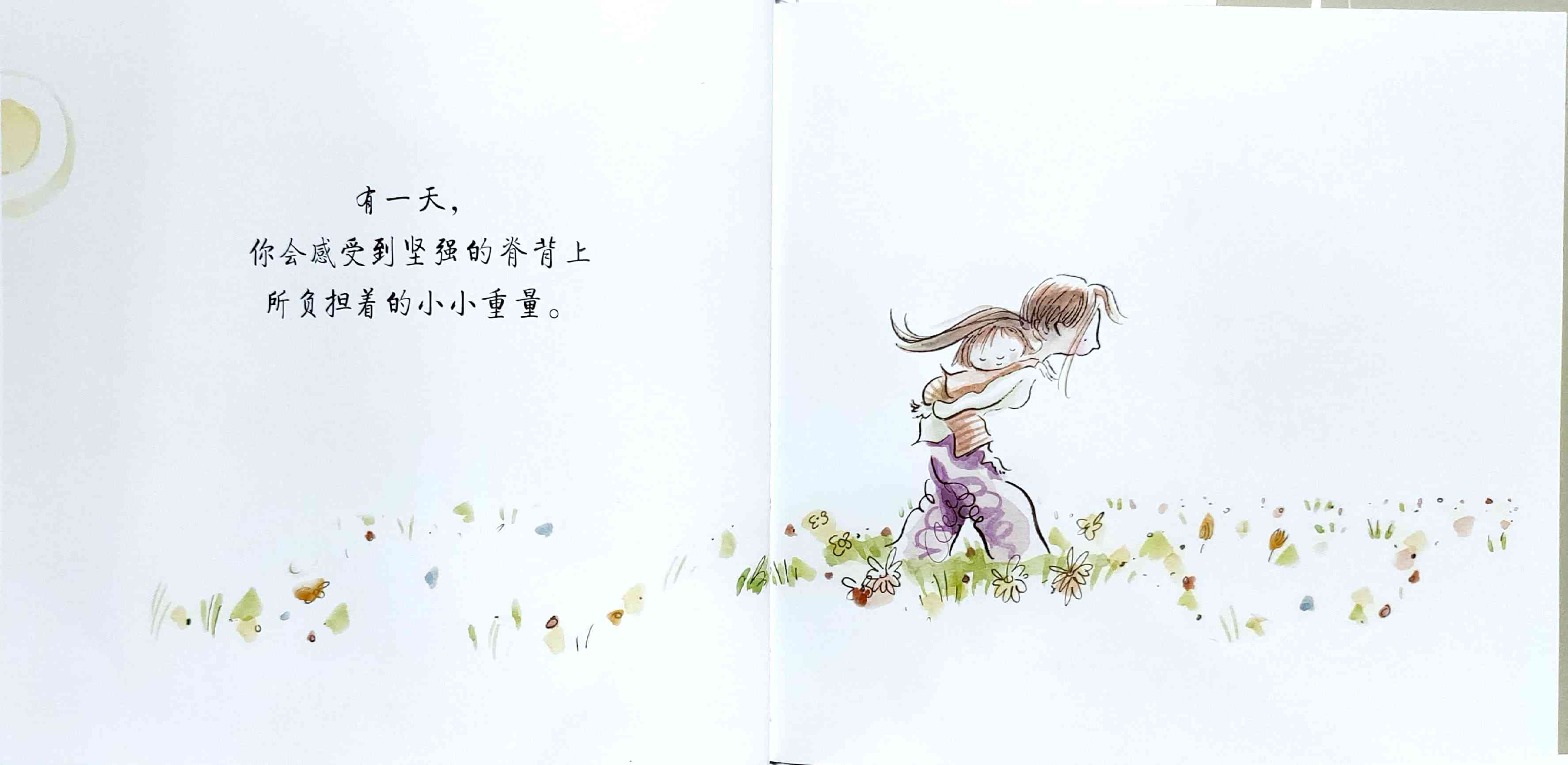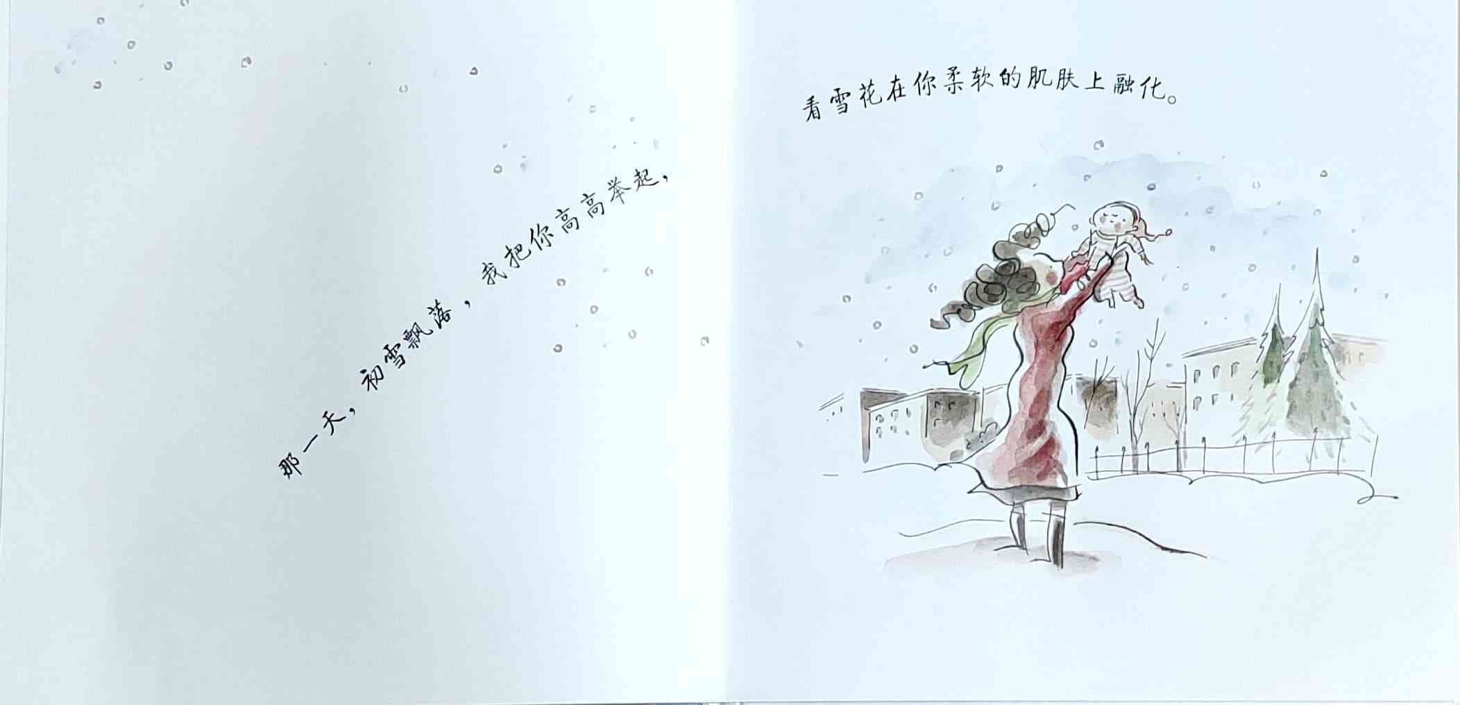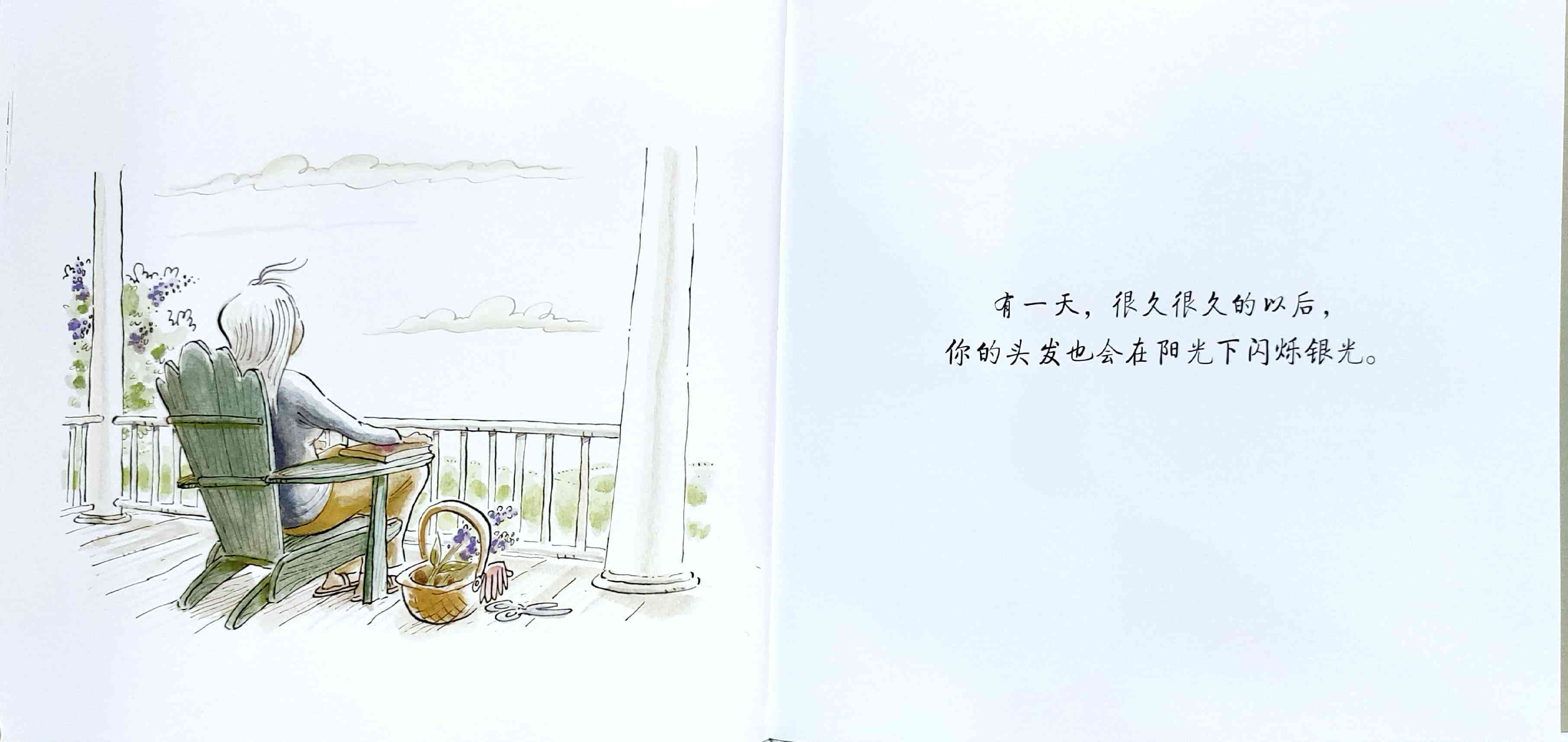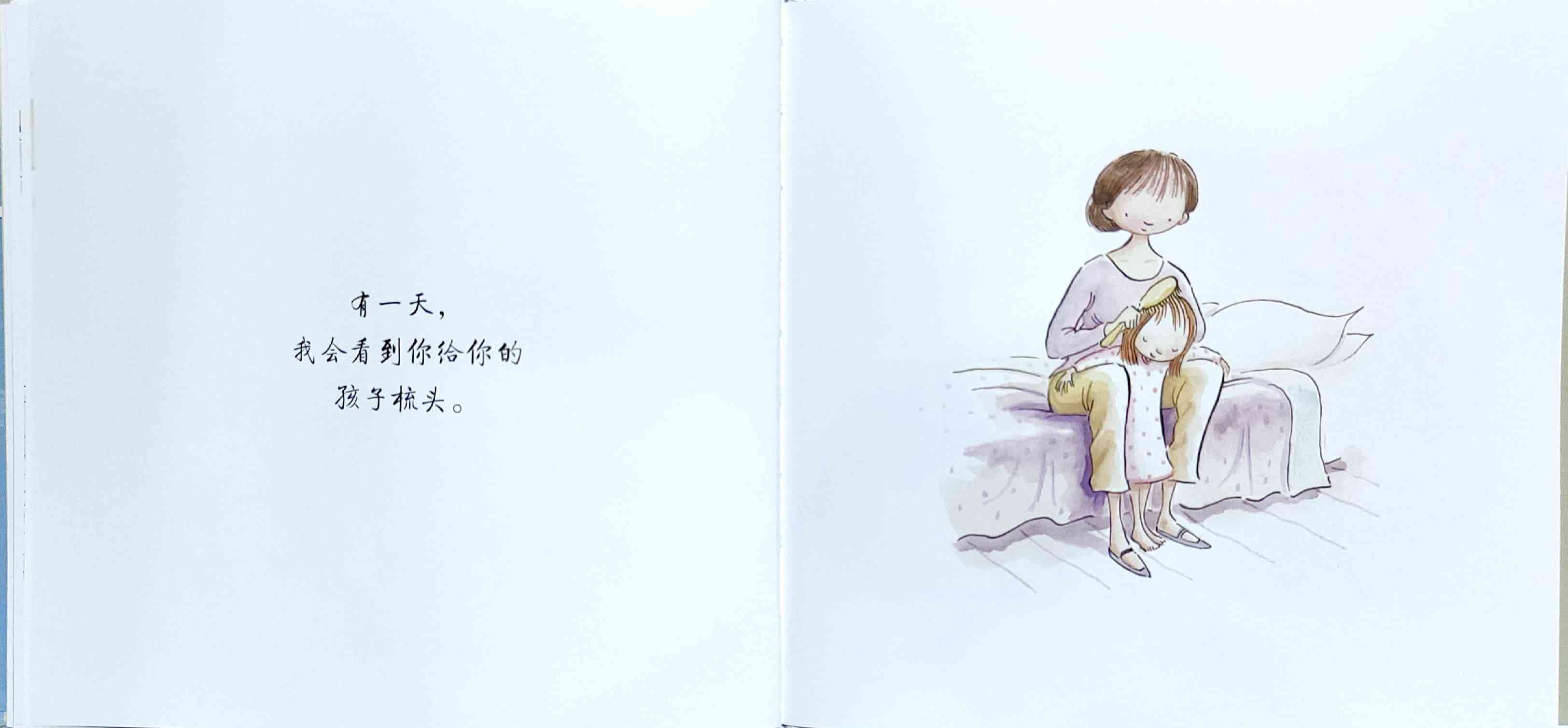 简单质朴的语言,传达出如天空和海洋般辽阔的母爱。 一天深夜,艾莉森·麦基站在卧室门口看着熟睡的女儿,感到心不知被什么温柔地触碰了一下。她悄悄走进厨房,在餐桌旁写下了《有一天》的初稿:“那一天,我数算你的手指,轻轻把它们亲遍;那一天,初雪飘落,我把你高高举起……” 诗一般的文字,仿佛一位母亲的喃喃自语:有一天,孩子会独自去体验成长中的种种酸甜;有一天,她会离开家,渐行渐远,拥有自己的孩子,直到满头白发的那一天到来时,她会想起母亲的爱……
