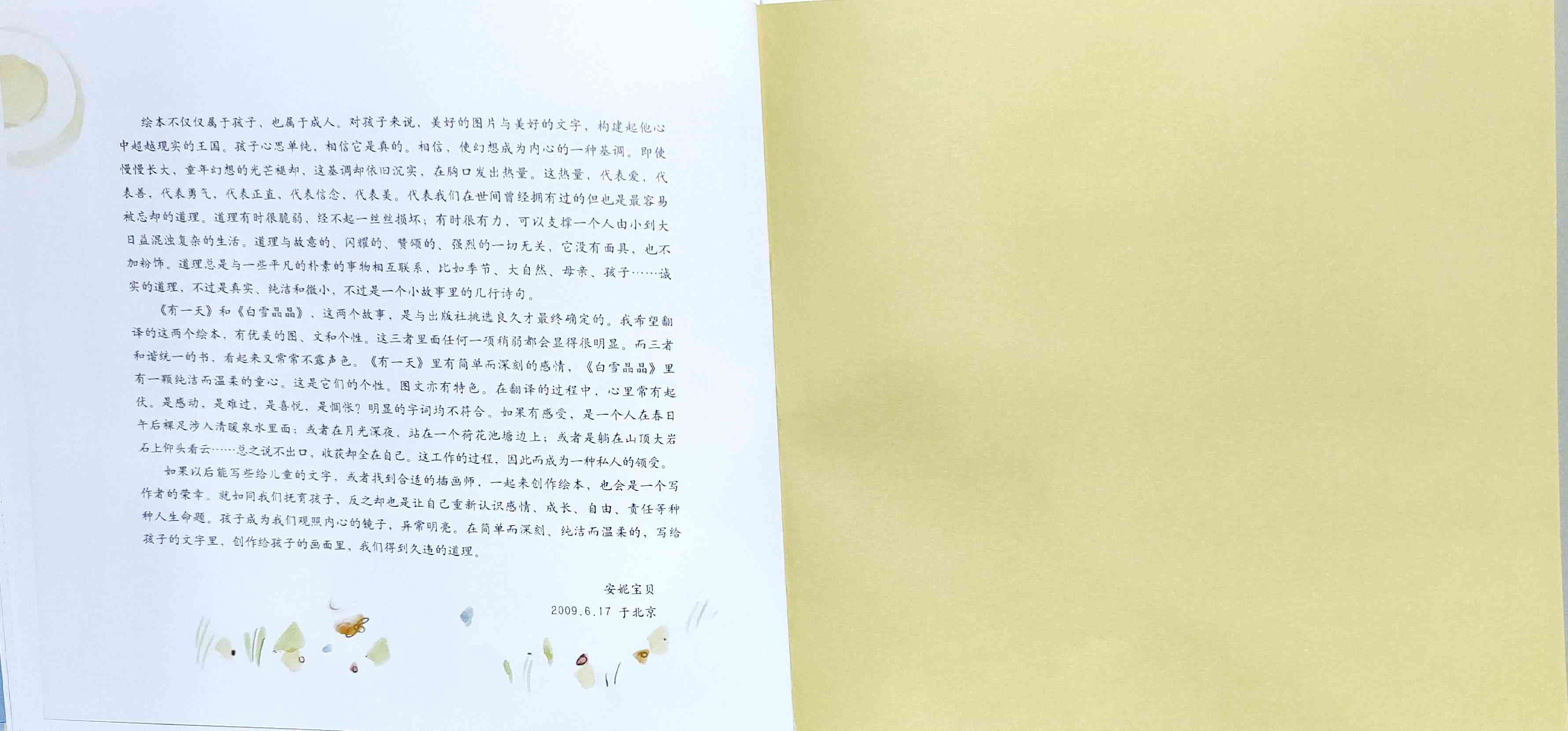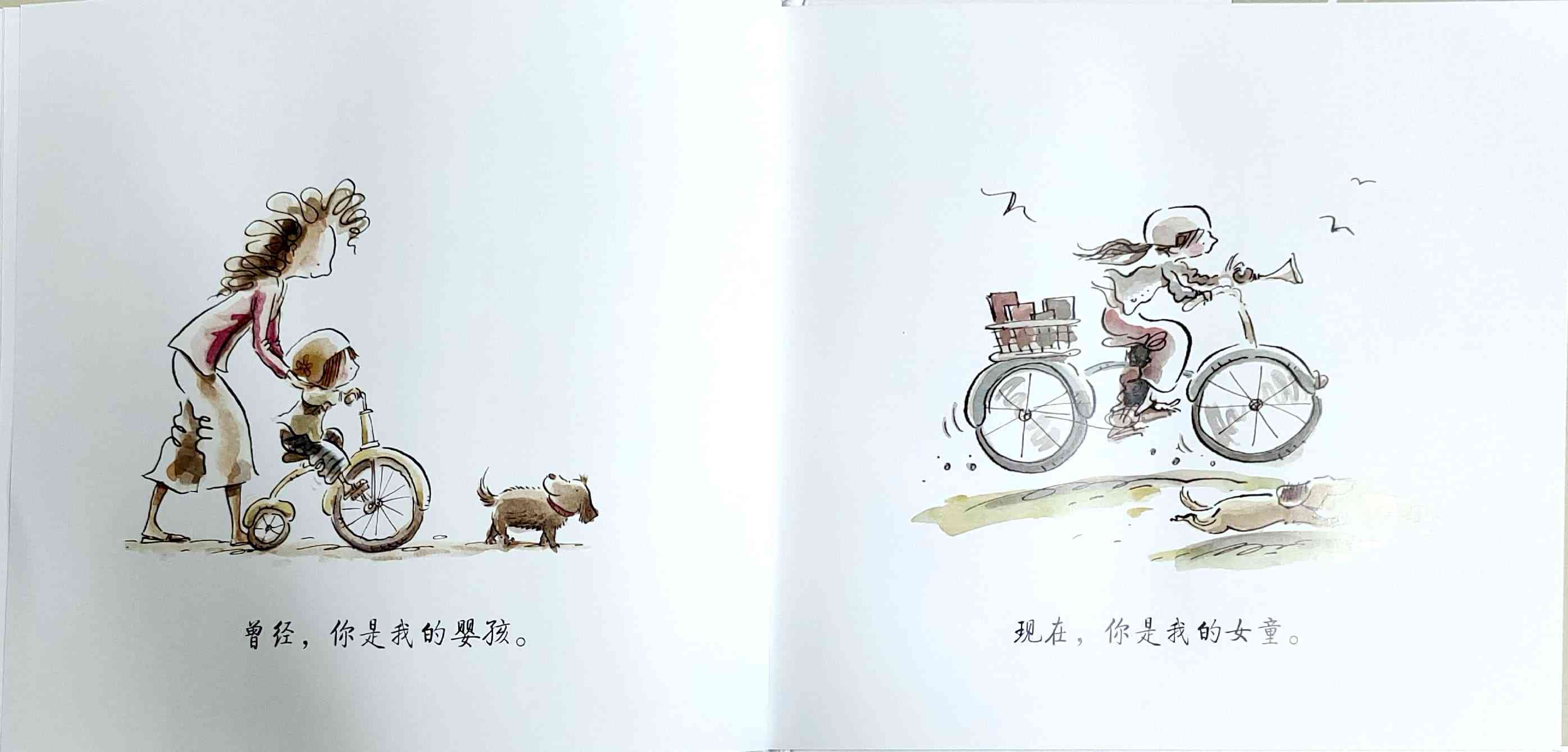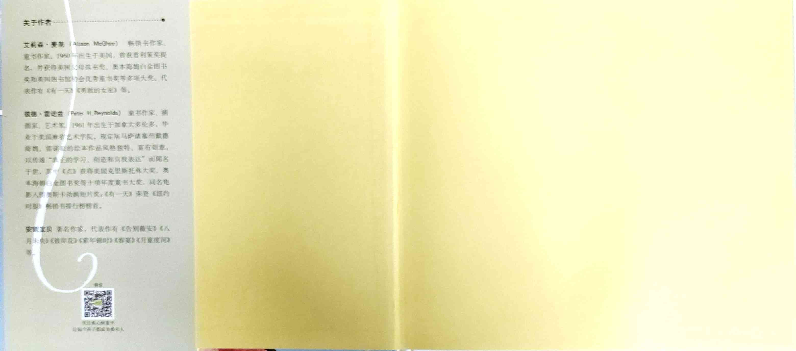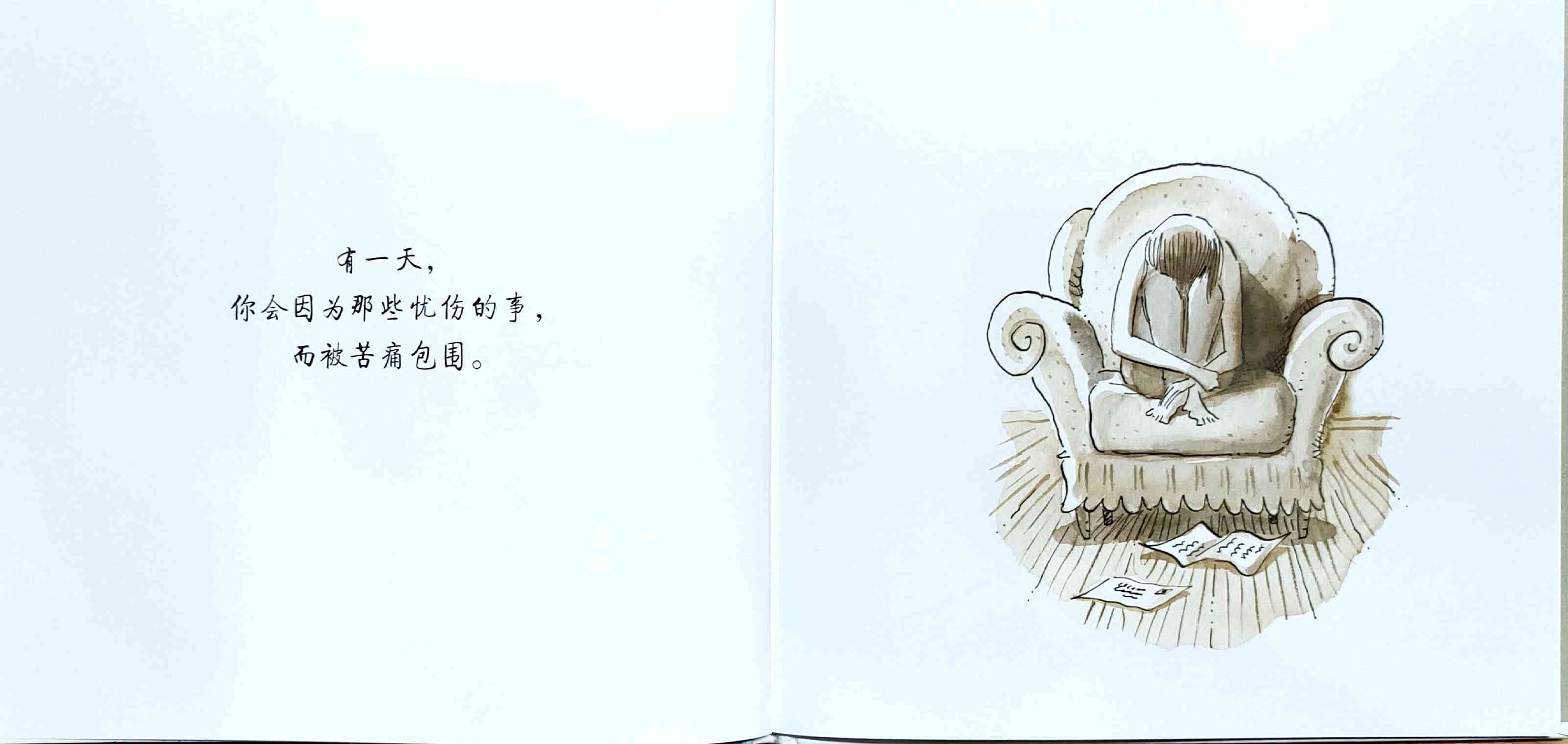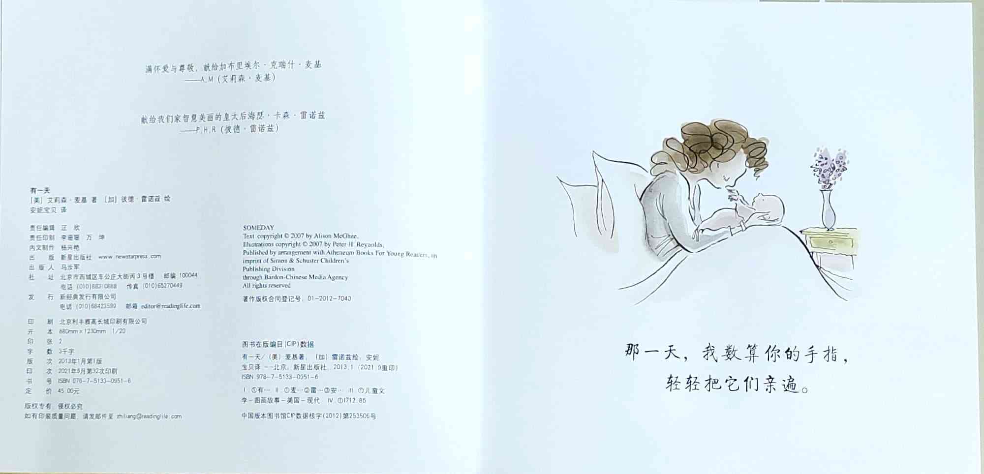 简单质朴的语言,传达出如天空和海洋般辽阔的母爱。 一天深夜,艾莉森·麦基站在卧室门口看着熟睡的女儿,感到心不知被什么温柔地触碰了一下。她悄悄走进厨房,在餐桌旁写下了《有一天》的初稿:“那一天,我数算你的手指,轻轻把它们亲遍;那一天,初雪飘落,我把你高高举起……” 诗一般的文字,仿佛一位母亲的喃喃自语:有一天,孩子会独自去体验成长中的种种酸甜;有一天,她会离开家,渐行渐远,拥有自己的孩子,直到满头白发的那一天到来时,她会想起母亲的爱……