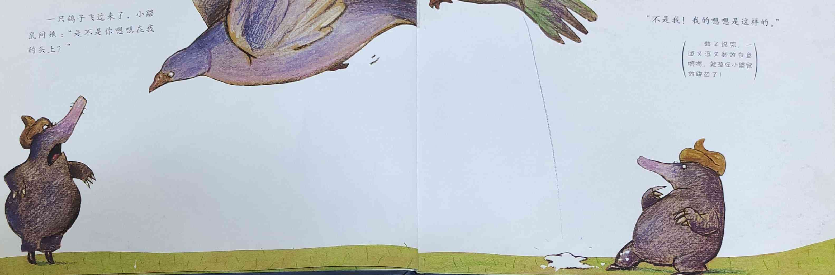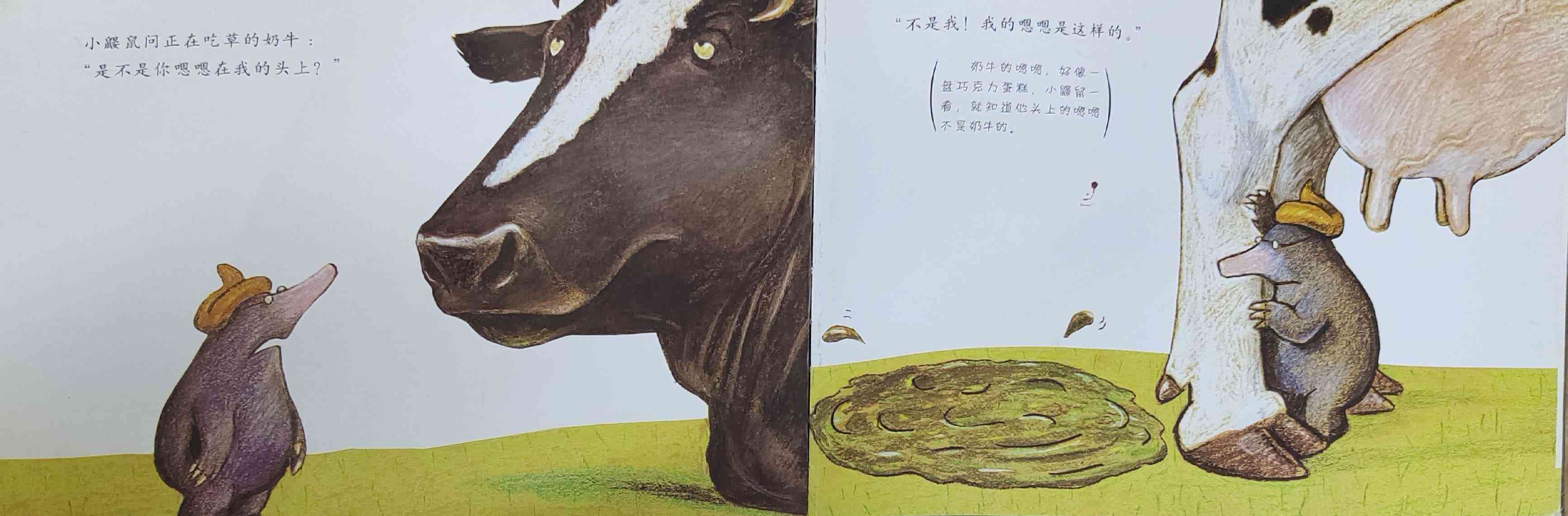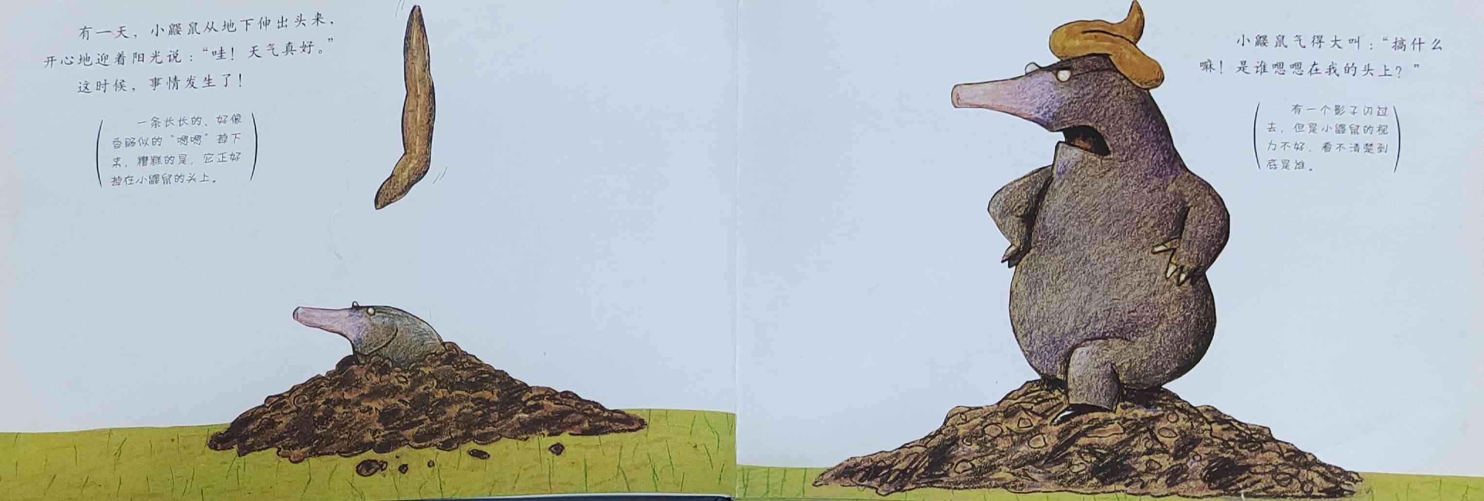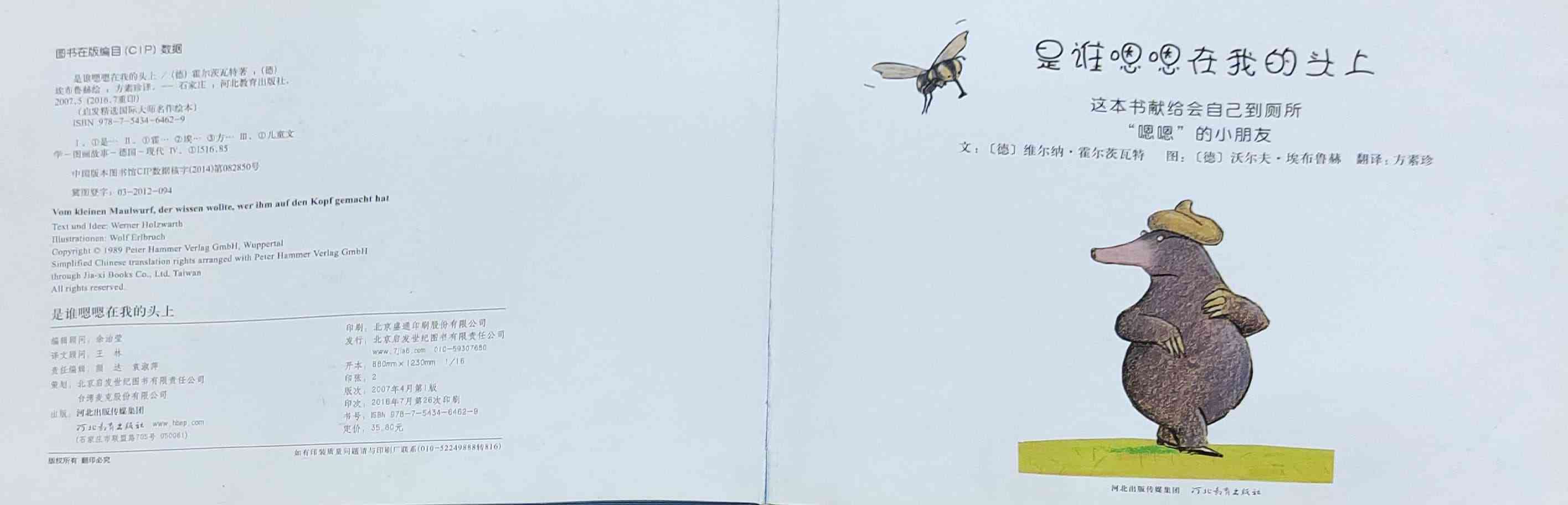 “嗯嗯”到底有什么学问呢?故事透过一只倒霉的小鼹鼠,寻找到底是哪个坏蛋“嗯嗯”在他头上的过程,轻松愉快地让我们了解:原来每一种动物的排泄物形状都不同,什么样的动物就“大”什么样的“便”,我们也从《是谁嗯嗯在我的头上》中得到更深一层的认识。 而最后小鼹鼠到底能不能找到那个“嗯嗯”在他头上的坏蛋呢?专吃大便的苍蝇可是破案的关键喔!这是一本兼具趣味性和知识性的好书,在书末还附上一篇“动物的吃喝拉撒”的文章,说明了动物的食物、消化与排泄的关系,让小朋友在哈哈大笑之余,也得到生物学相关的常识。