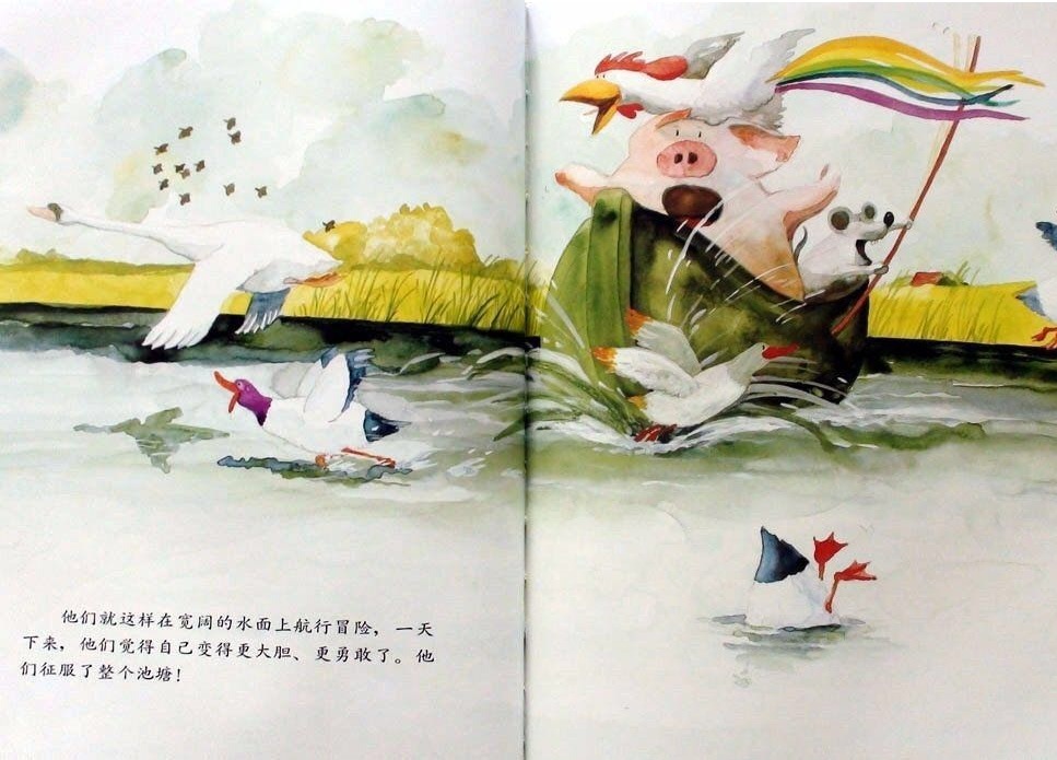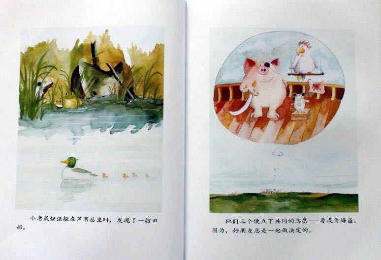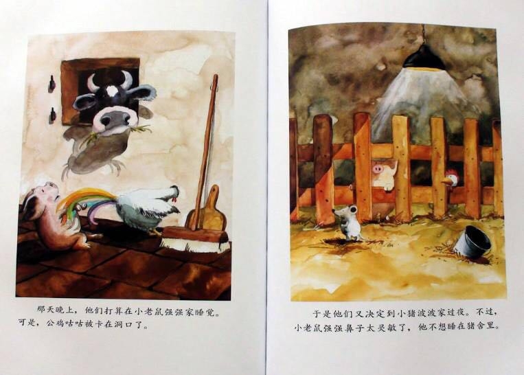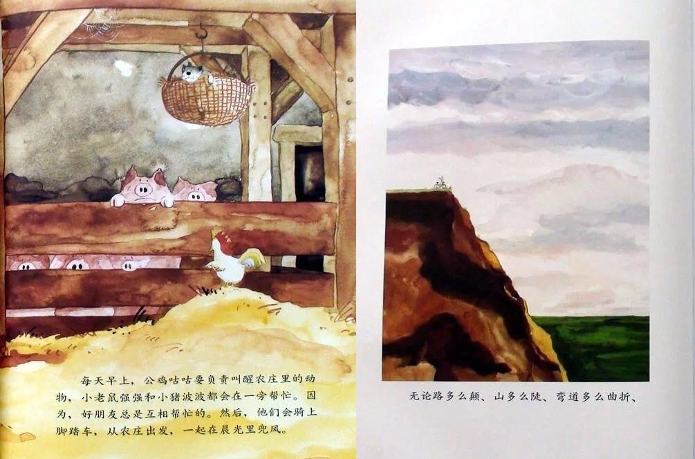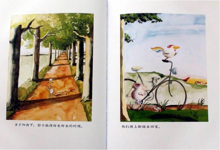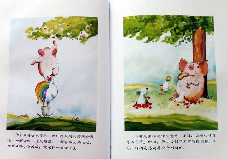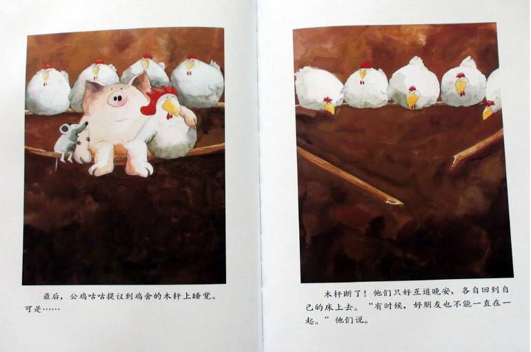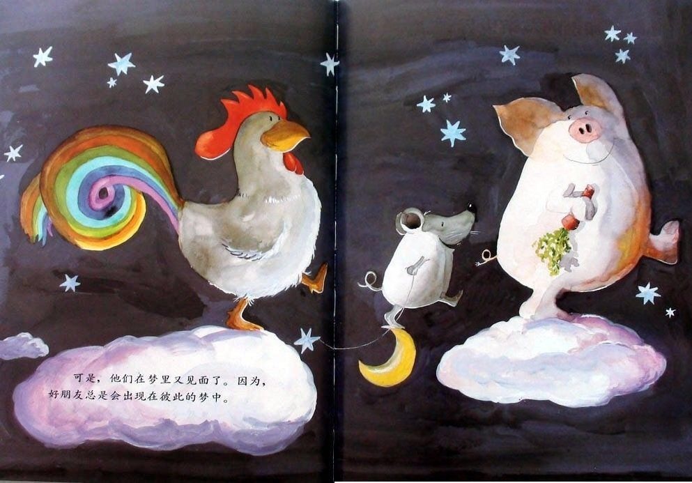 小猪波波、小老鼠强强和公鸡咕咕是好朋友,它们认为好朋友是永远不分开的。每天清晨在小老鼠强强和小猪波波的帮助下,公鸡咕咕叫醒农庄里所有的动物。而后它们便相互合作骑一辆自行车去兜风:公鸡扶车把,小老鼠和小猪一左一右去踩脚踏板;它们相互合作划一只小船,公鸡当帆,小老鼠划桨,小猪则用屁股堵住船底的窟窿;它们搭了一个“人梯”去摘树上的樱桃,“人梯”从下至上依次是小老鼠、公鸡和小猪……他们发誓要做一辈子朋友,因为好朋友是永不分离的,可是他们最后还是分开了……但是在结尾处,作者安排了三个好朋友又相聚在美梦里。其实即使分离,只要依然相互关心,彼此间的感情就不会冲淡!