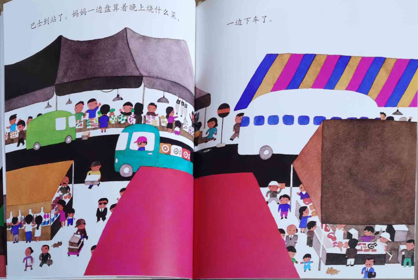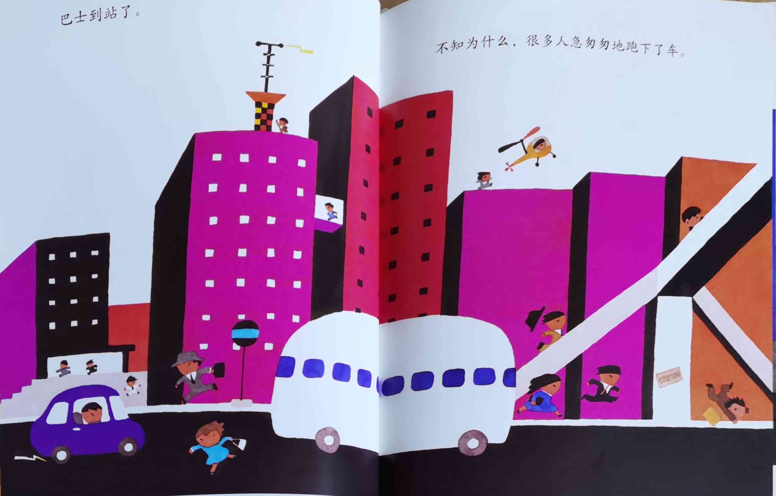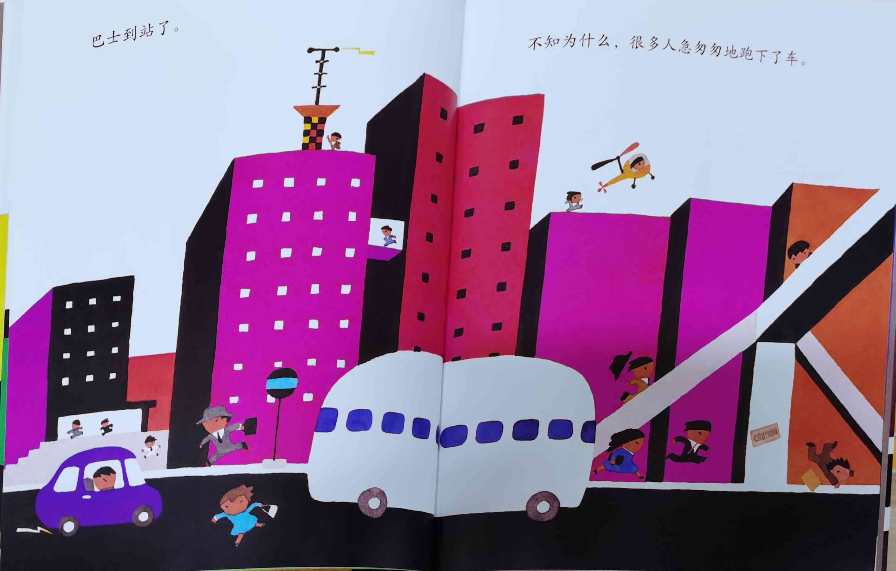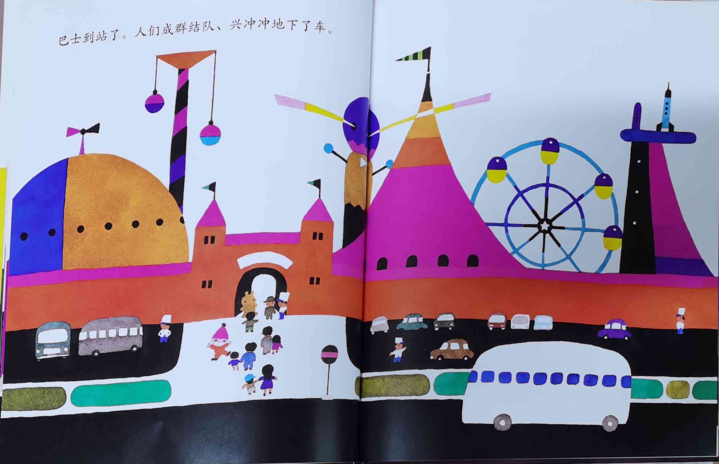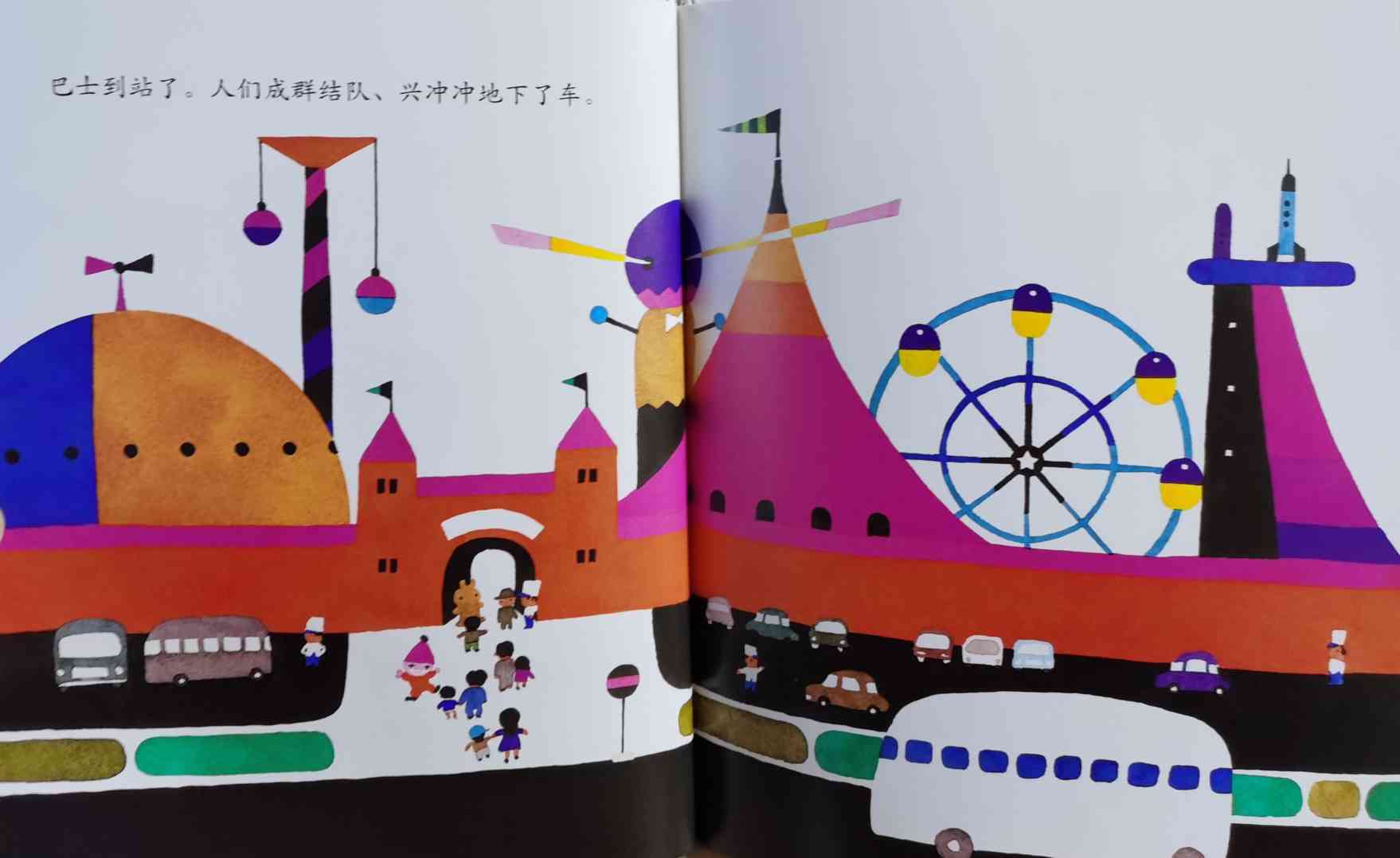 《巴士到站了》以“巴士到站了(バスガきた),某某该下车了(……おりた)”构成回复旋律。人们乘坐巴士到达属于自己的目的地,每个人都在自己的那一站下车去做自己的事情。我们能否猜出每一站是什么地方?而巴士的下一站又会停在哪里呢?一位色彩魔术师——五味太郎,用非常鲜艳美丽的色彩,规划了巴士的路线:从海边、山边、小区、新市镇、大都会、游乐场、运动场、医院、市场、垃圾场、制片场……到停车场。透过色彩,不仅将不同停靠站所代表的生活气氛表露无遗,也透露了巴士服务的各种人的职业,以及服务时间。最重要的,缤纷的色彩也让巴士每天的行程变得非常愉快。小朋友,你来看一下,巴士都到了什么地方呢?下来的人们又都是什么职业的呢?想不想跟着爸爸妈妈一起去乘巴士,然后把《巴士到站了》的故事说给他们听呢? 海报: