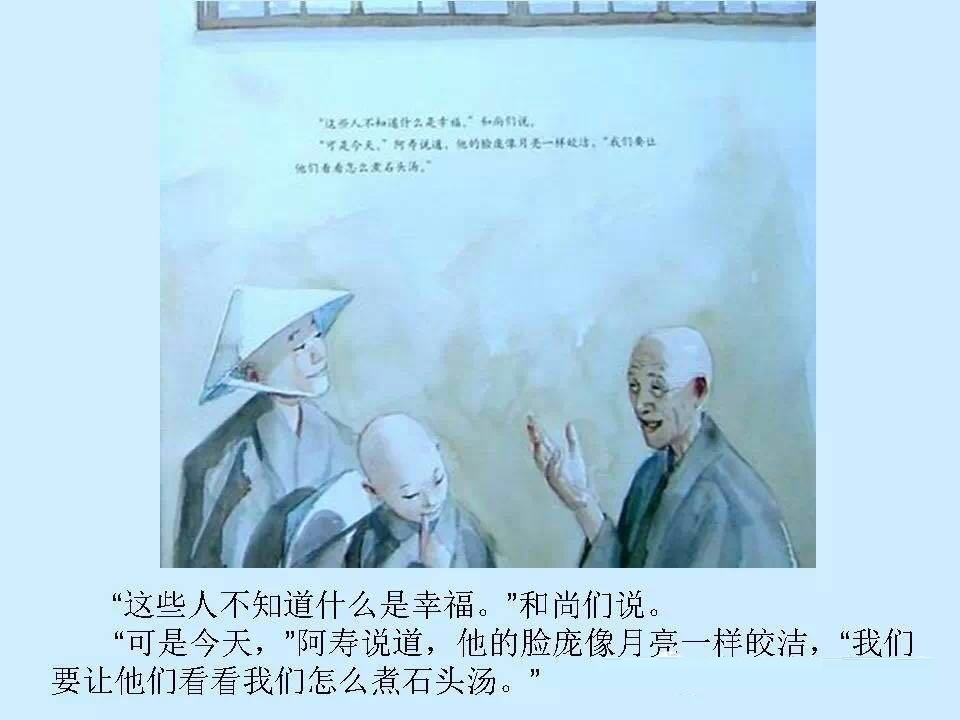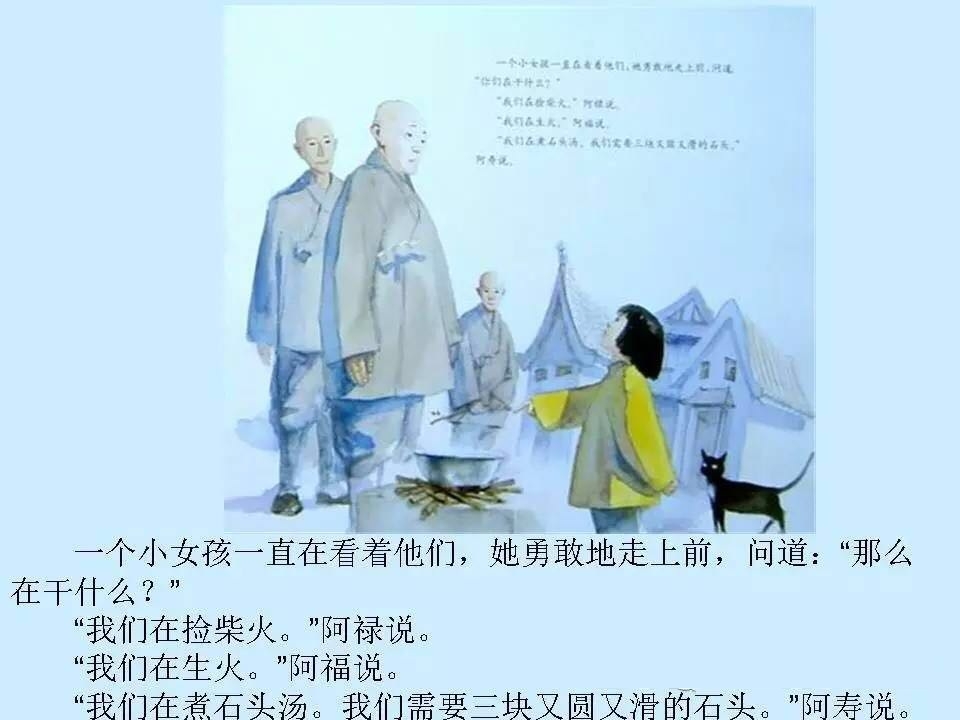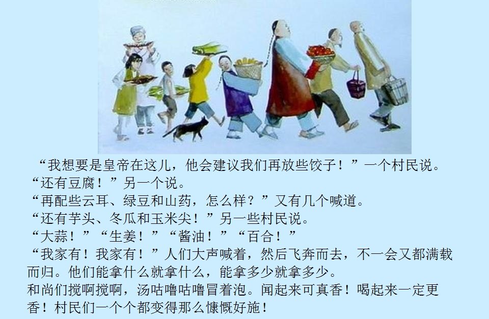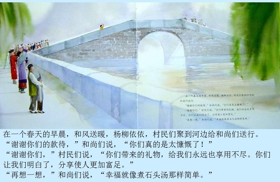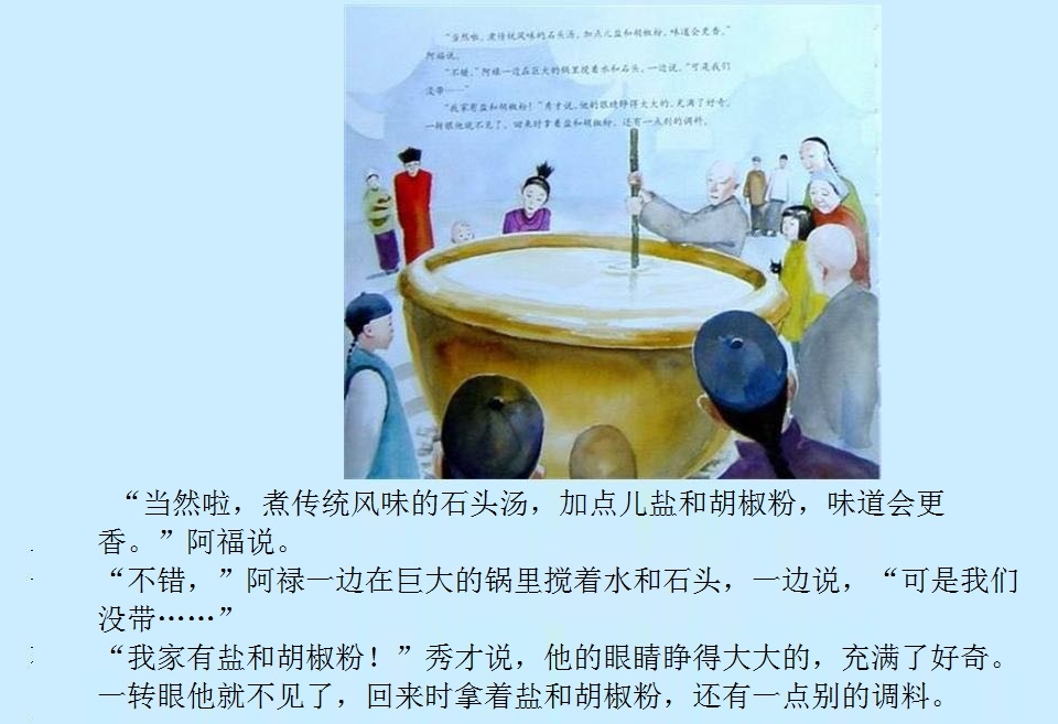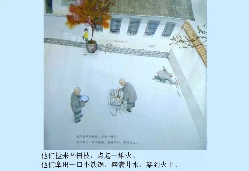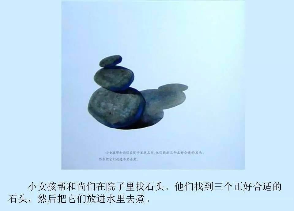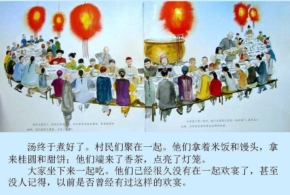 《石头汤》内容简介:三个和尚来到一个饱经苦难的村庄,村民们长年在艰难岁月中煎熬,心肠变得坚硬,不愿接纳任何人。可是,和尚们用煮石头汤的方法,让村民们不知不觉地付出了很多,更明白了付出越多回报越多的道理。琼·穆特运用华丽的水彩画,引领读者去深思蕴涵在故事背后的道理。他把自己对禅宗和东方文化的热爱,融入这个古老的巧计故事当中,以此弘扬慷慨好施的力量。 点击链接进入英文版: Stone Soup