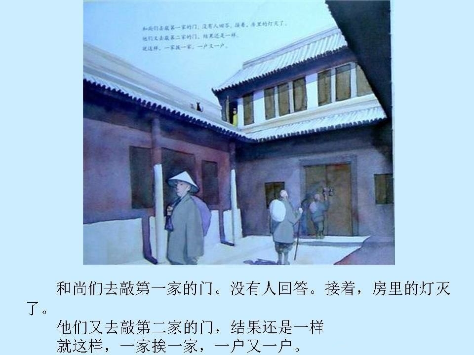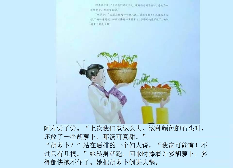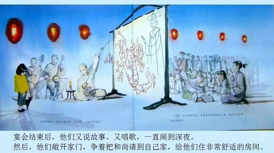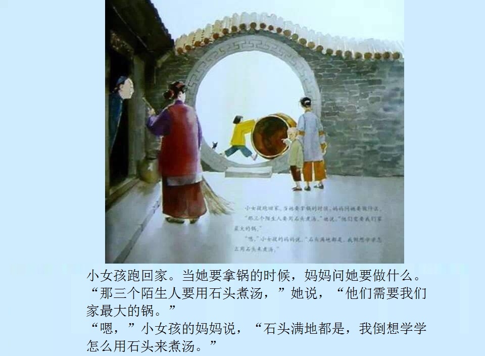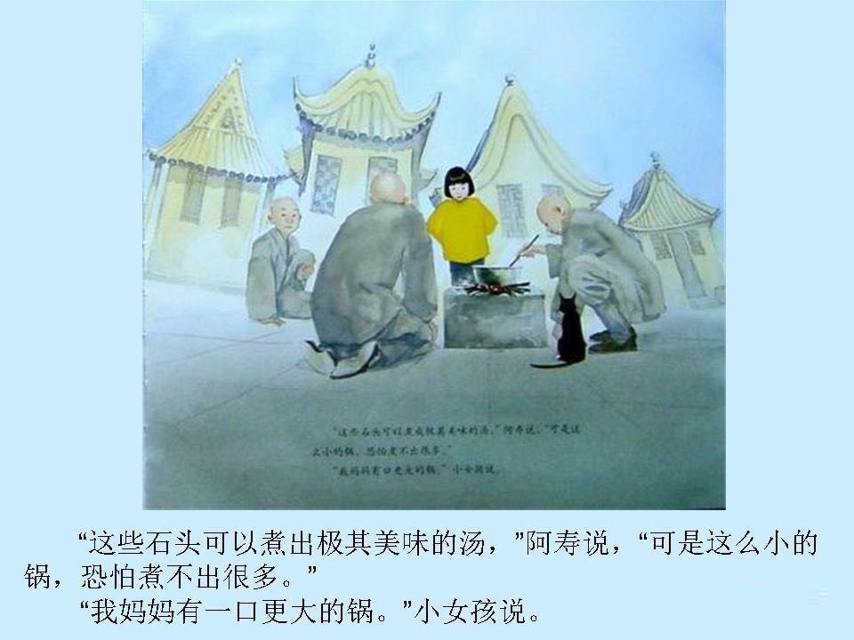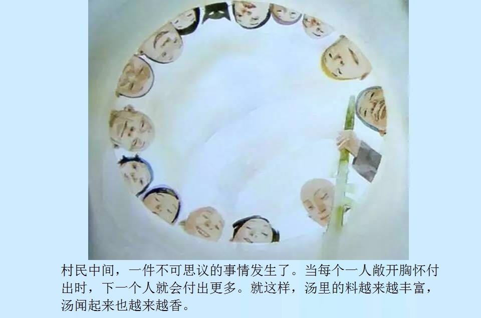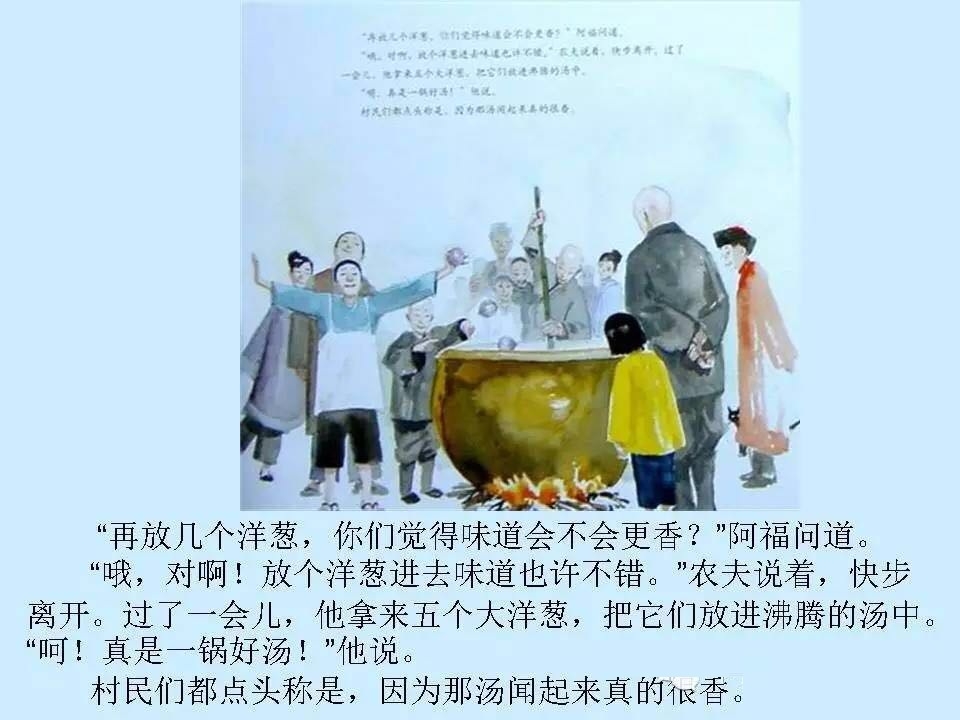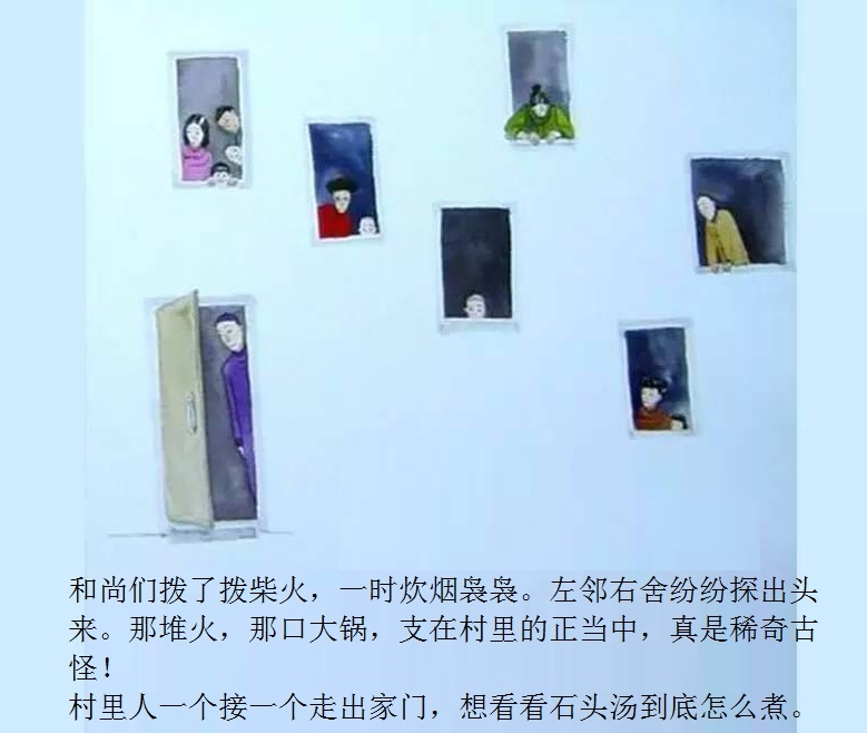 《石头汤》内容简介:三个和尚来到一个饱经苦难的村庄,村民们长年在艰难岁月中煎熬,心肠变得坚硬,不愿接纳任何人。可是,和尚们用煮石头汤的方法,让村民们不知不觉地付出了很多,更明白了付出越多回报越多的道理。琼·穆特运用华丽的水彩画,引领读者去深思蕴涵在故事背后的道理。他把自己对禅宗和东方文化的热爱,融入这个古老的巧计故事当中,以此弘扬慷慨好施的力量。 点击链接进入英文版: Stone Soup