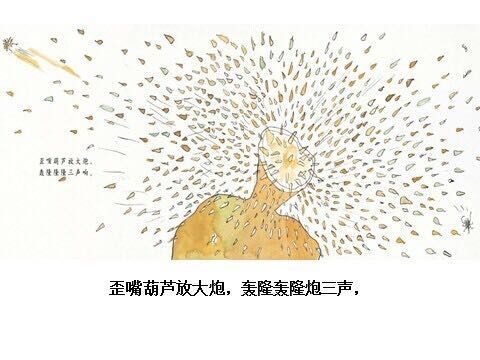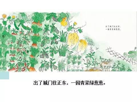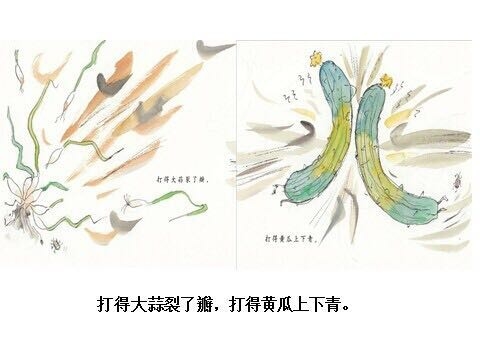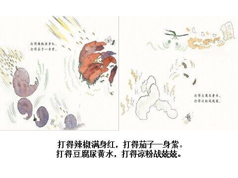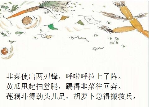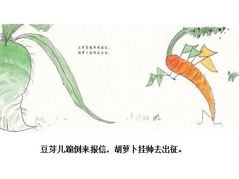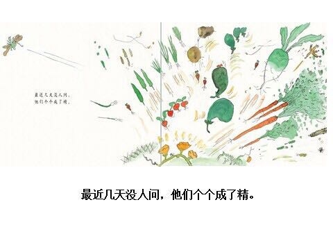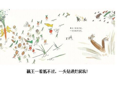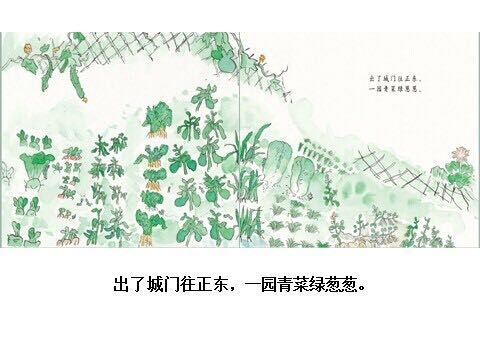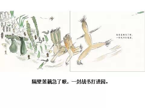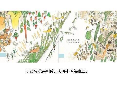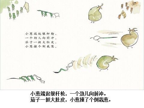 《一园青菜成了精》巧妙地蕴藏了青菜们的特性,这是一种充满智慧的幽默。小葱青秆绿叶儿长得直,正像一根银杆枪;韭莱的叶片狭长而扁平,如同两刃锋。大蒜成熟后的裂瓣,辣椒的浑身红通通,茄子的紫涨圆滚,都成了战斗的结果,让人读出意料之外却又不得不信服的荒诞。写到莲藕时,不是说它天性生长于湿泥里,而是成了逃跑不及的败军之将,糊里糊涂,慌不择路地钻进了烂泥坑——孩子们怎能不笑出声儿来呢。 好的童谣需要好的画面来表现,增一分则太闹,减些许就平淡无奇。画童谣类的作品,一定要走进和它同步的韵味儿中,丢掉华丽虚假的习气,踏踏实实浸润到泥土里,才能相得益彰。我翻开书页,看到青莱萝卜们的神气活现和眉飞色舞,已然开始窃喜了。画家遵循着青菜们的独特个性,又赋予其饱满的情绪和孩童的顽皮,夸张却不鬼怪离奇,让这一群顽童煞有介事地摆开阵势,斗得畅快淋漓。 点击链接进入: 《子儿,吐吐》 《妈妈买绿豆!》 《小鱼散步》 《信谊图画书奖系列:门》 《信谊图画书奖系列:葡萄》 《信谊图画书奖系列:进城》 《爸爸去上班》 《那只深蓝色的鸟是我爸爸》 《团圆》
